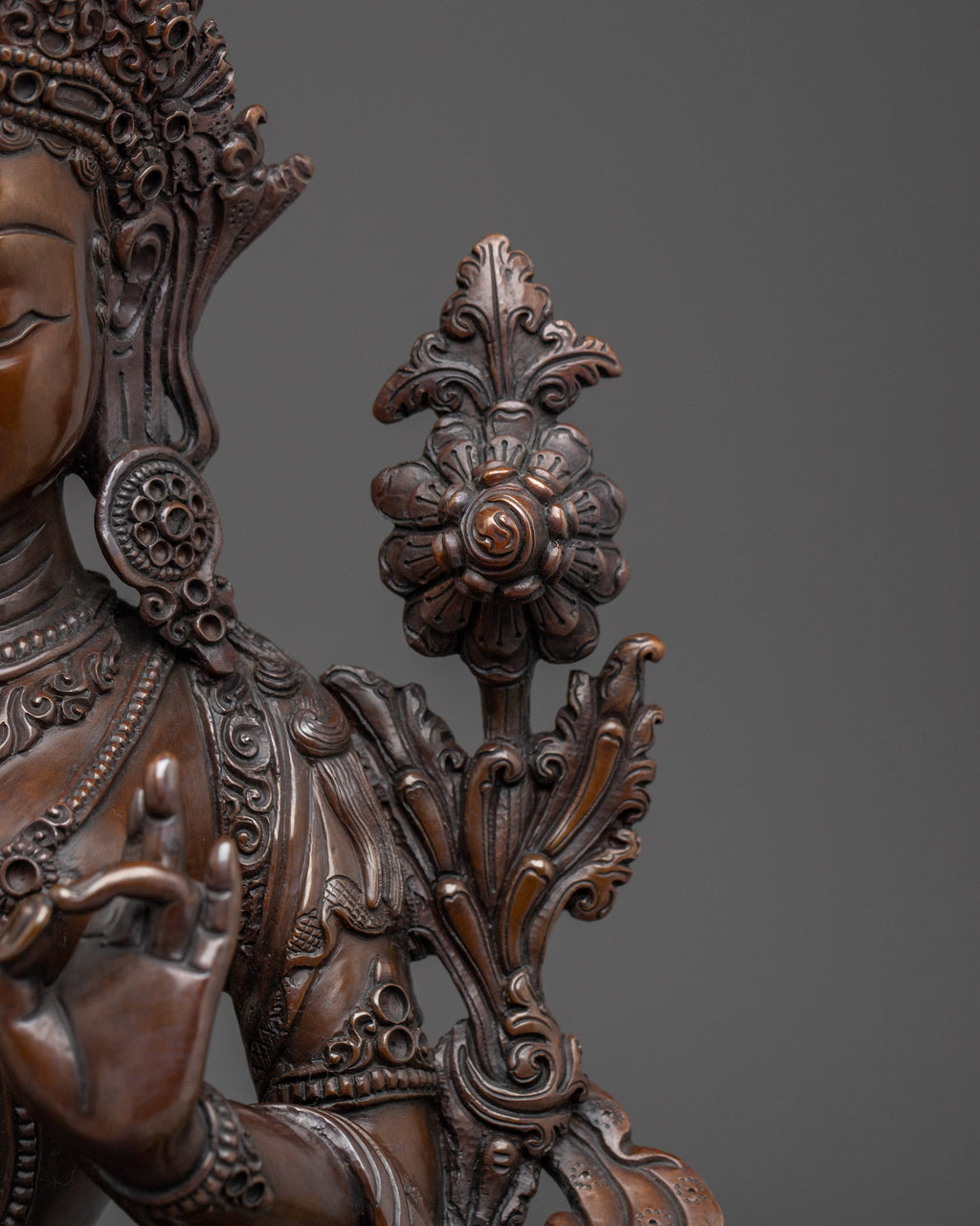 As depicted, Green Tara is shown seated on a lotus throne with her right leg typically extended forward, signifying her active compassion and willingness to help. Her hands express profound meaning through their gestures; the right hand is displayed in the "gesture of giving" (Varada Mudra), symbolizing her boundless generosity and willingness to provide blessings. Meanwhile, her left hand delicately holds a blue lotus (Utpala), a symbol of purity and spiritual awakening, offering protection and reassurance to those who seek her guidance.