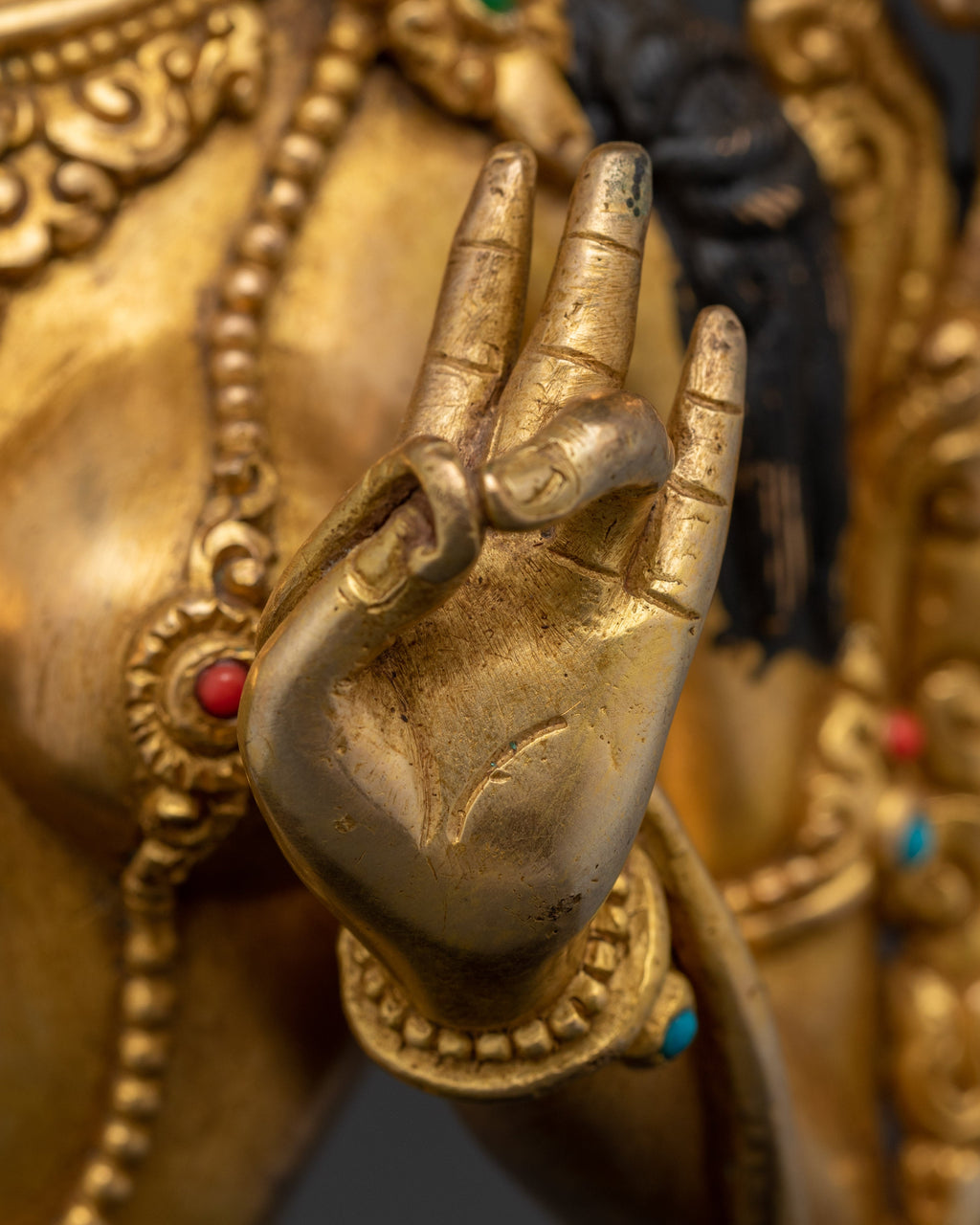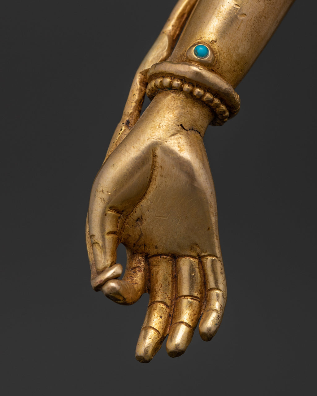 Discover the magnificent beauty of the Tibetan Green Tara Deity, a wonderfully handmade statue measuring 14.2 inches tall, 9.1 inches wide, and weighing 2.25 kg. This gorgeous item has a copper body that is painstakingly embellished with 24K gold gilding and gold and acrylic paints, with an antique finish that adds to its everlasting charm.
