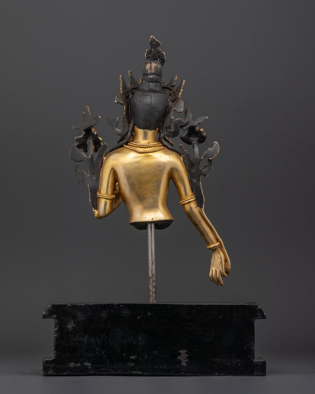 The Green Tara is respected for her caring presence and immediate protection. The antique finish adds a feeling of historical reverence to this piece, making it an excellent addition to any Buddhist shrine or meditation space. The antique finish provides visual depth to the statue and gives it a feeling of historical and spiritual significance, representing Tibet's rich artistic legacy.