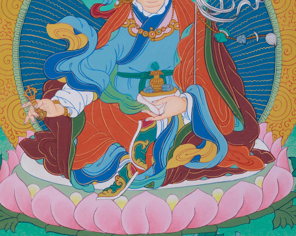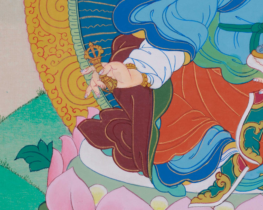 This thangka depicts Padmasambhava, also known as Guru Rinpoche, in a lively, commanding pose. Sitting on a lotus seat, Guru Rinpoche radiates a calm yet lively aura, symbolizing his supreme wisdom and spiritual strength. His majestic appearance, with detailed robes and ornaments, reflects his status as a revered figure in Tibetan Buddhism. Guru Rinpoche holds a vajra and a katvanga, symbolizing his power to overcome obstacles. The vibrant colors, especially the blues, reds, and golds, intensify the divine presence of Guru Rinpoche, while the intricate details of his surroundings emphasize his connection to the sacred realm. This portrayal highlights his role as the founder of Tibetan Buddhism, known for his transformative teachings and for introducing Buddhist practices to Tibet.