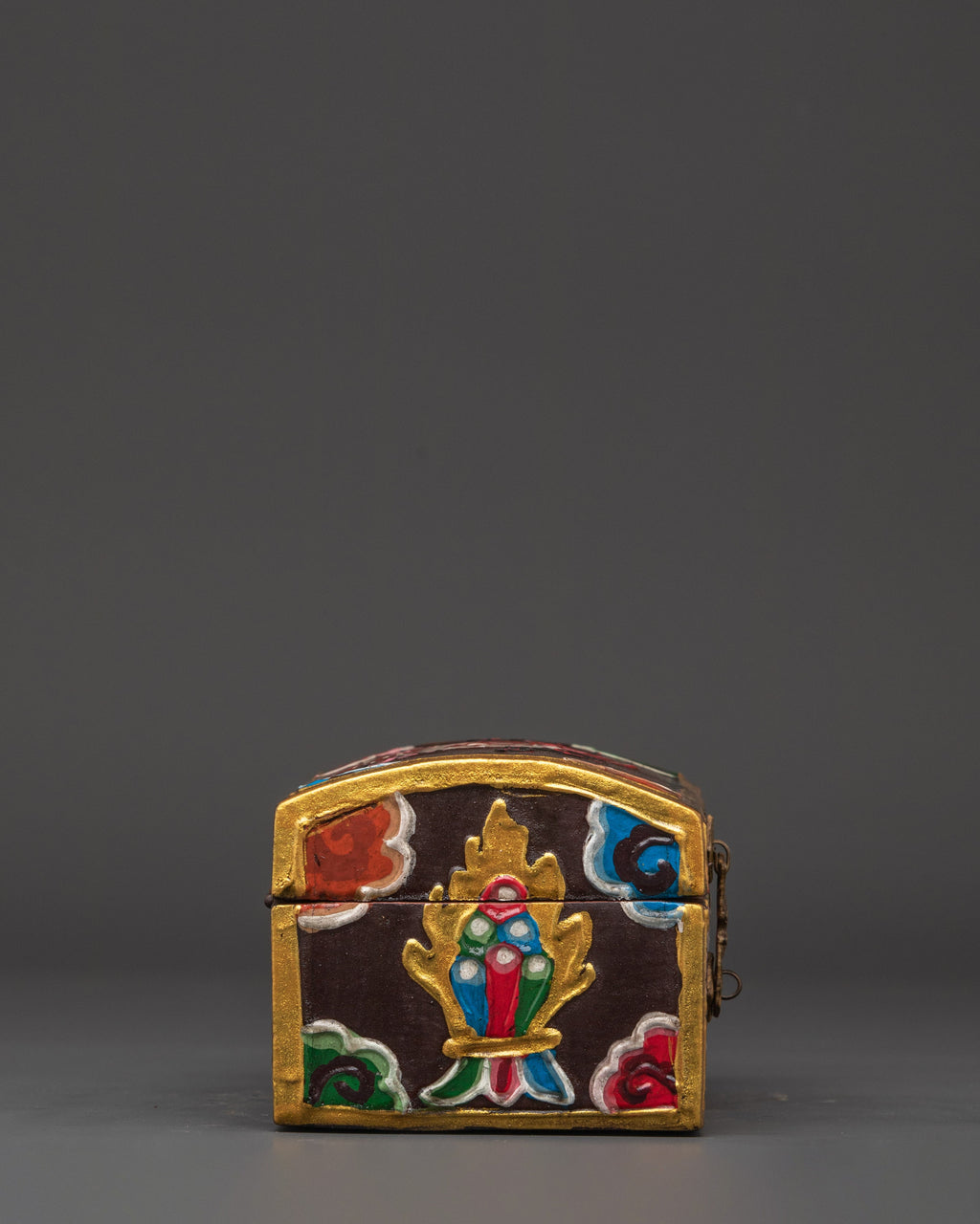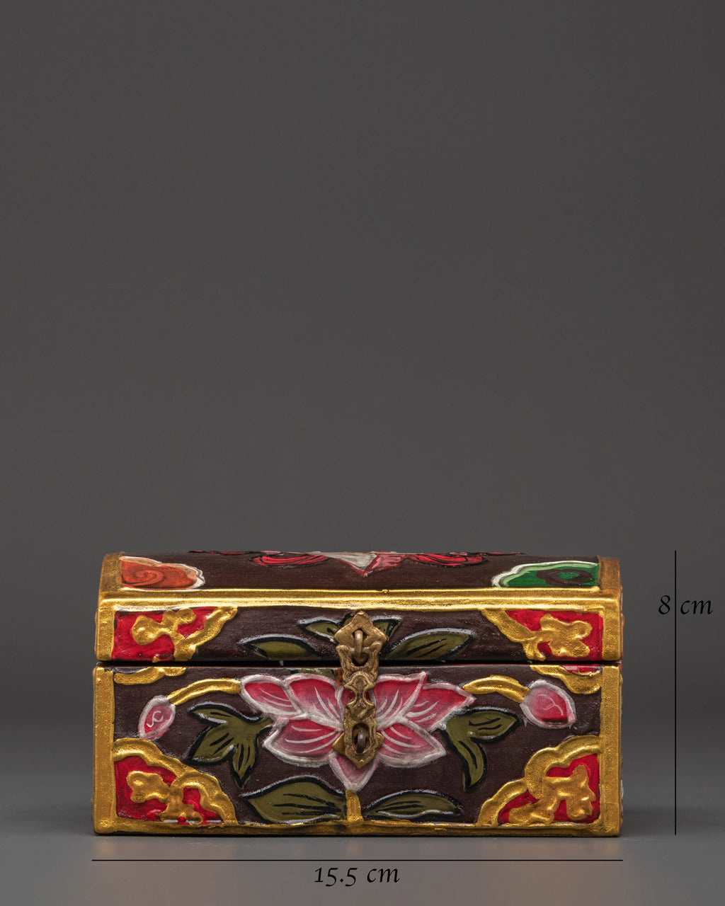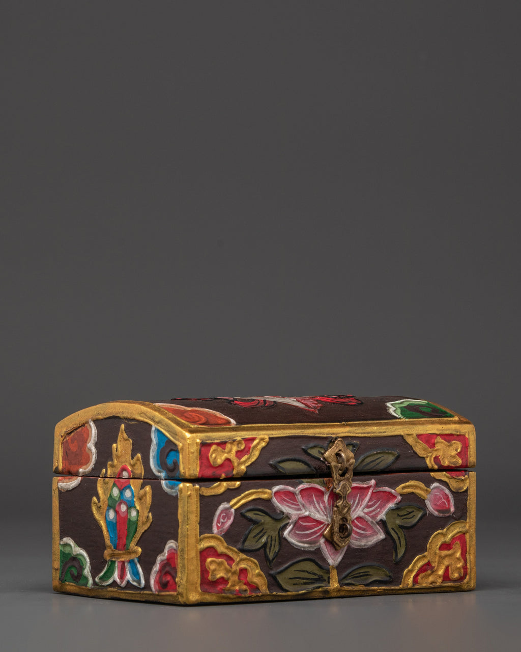 Enhance your spiritual environment with this beautifully hand-painted Tibetan wooden box, meticulously designed to store your most significant belongings. This box combines a traditional lotus motif and sacred Tibetan symbols, representing purity, enlightenment, and spiritual protection. Its vibrant colors and elaborate details render it both a practical storage solution and a piece of art.