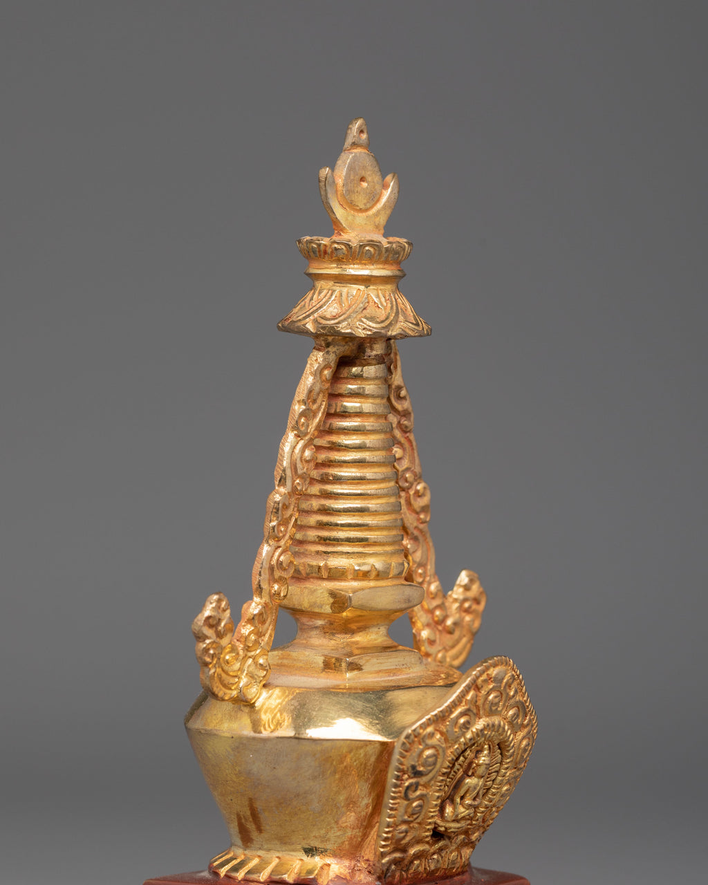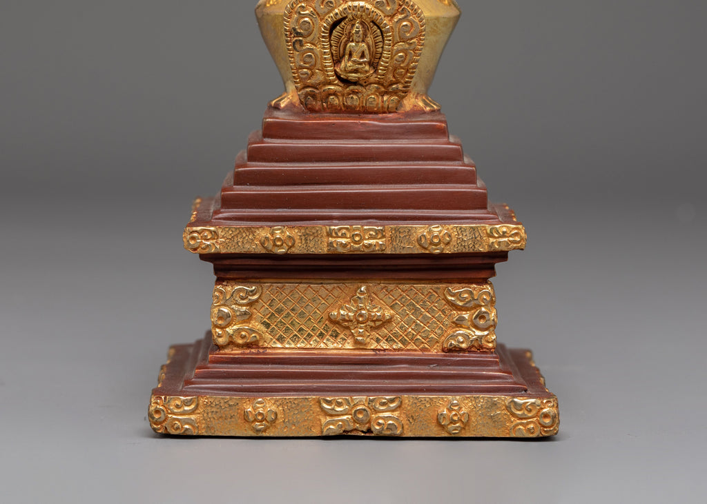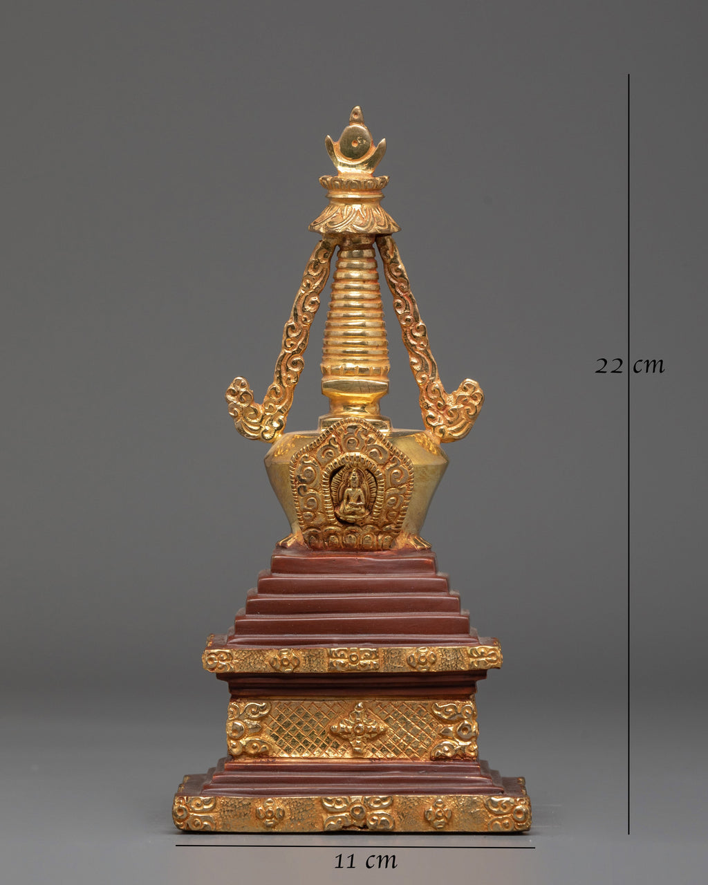 Each stupa is painstakingly crafted by hand. The dazzling gold plating and copper body enhance its magnificent beauty. This sculpture can be used as a focal point for your altar, a potent symbol of devotion, or a holy accent for your interior design. In addition to honoring Buddhist customs, owning this stupa allows you to bring serenity, good vibes, and a sacred presence into your everyday life.
