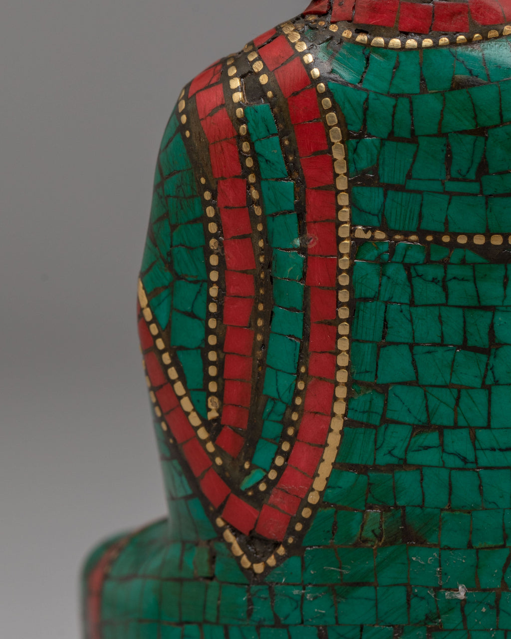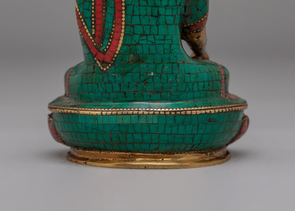 The statue represents Shakyamuni Buddha, the historical Buddha and founder of Buddhism. He is typically depicted seated in meditation posture with the Bhumisparsha Mudra (earth-touching gesture), symbolizing the moment of enlightenment. The detailed robe patterns and carefully placed gemstone inlays reflect traditional Tibetan artistic styles. Coral, lapis lazuli, and turquoise are often used in Himalayan art to enhance sacred imagery and add symbolic value.