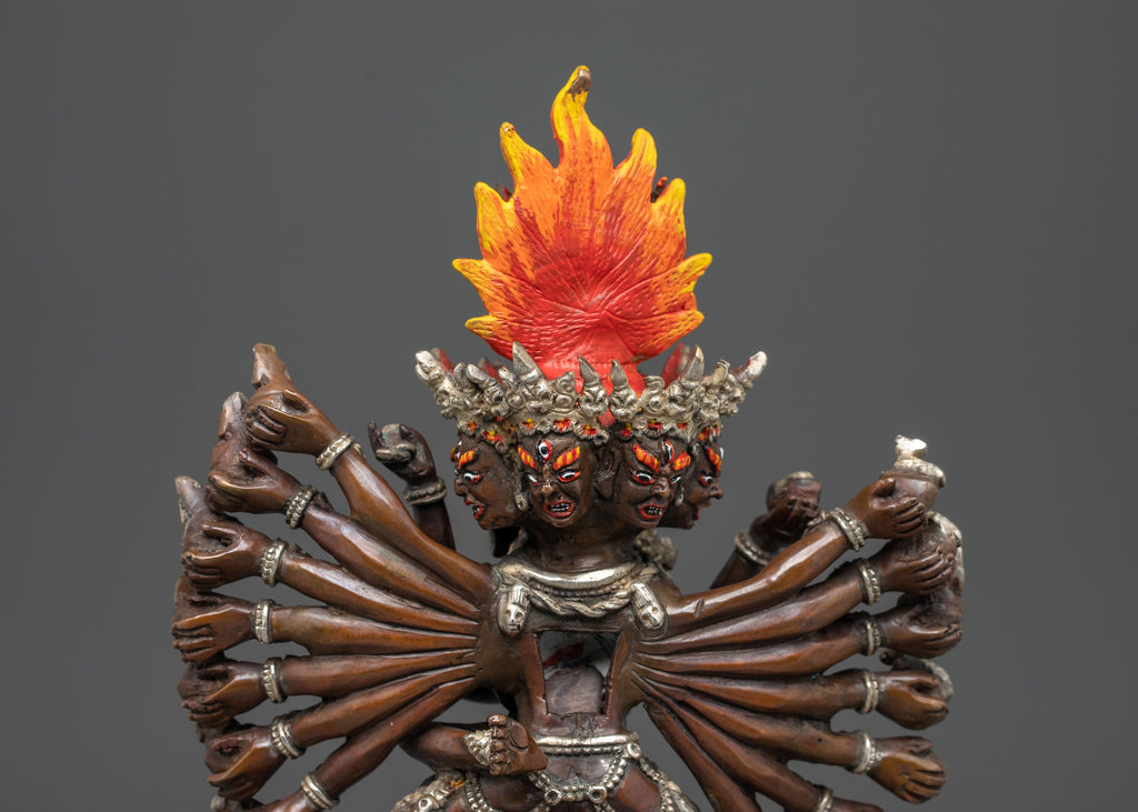 Hevajra is depicted in Alidha dancing ecstatically on four maras and tightly holding his consort Nairatmya. Hevajra has an ecstatic and wrathful expression. He is an outstanding yoga Tantra deity, directly tied to changes in the Shiva Nataraja cult. Hevajra's method is believed to be extremely helpful in melting the inner drops from the brain to the groin and producing the subtle subjectivity of enormous happiness, which is crucial in Tantric activities in the perfection stage. The consort of Hevajra, Nairatmya, is a Tantric manifestation of Prajnaparamita, Mother of all Buddhas, who is a divinity of subtle wisdom in her own right.