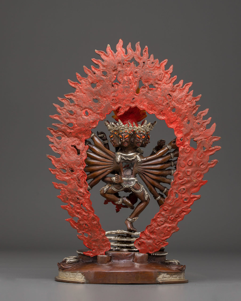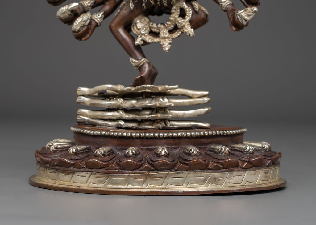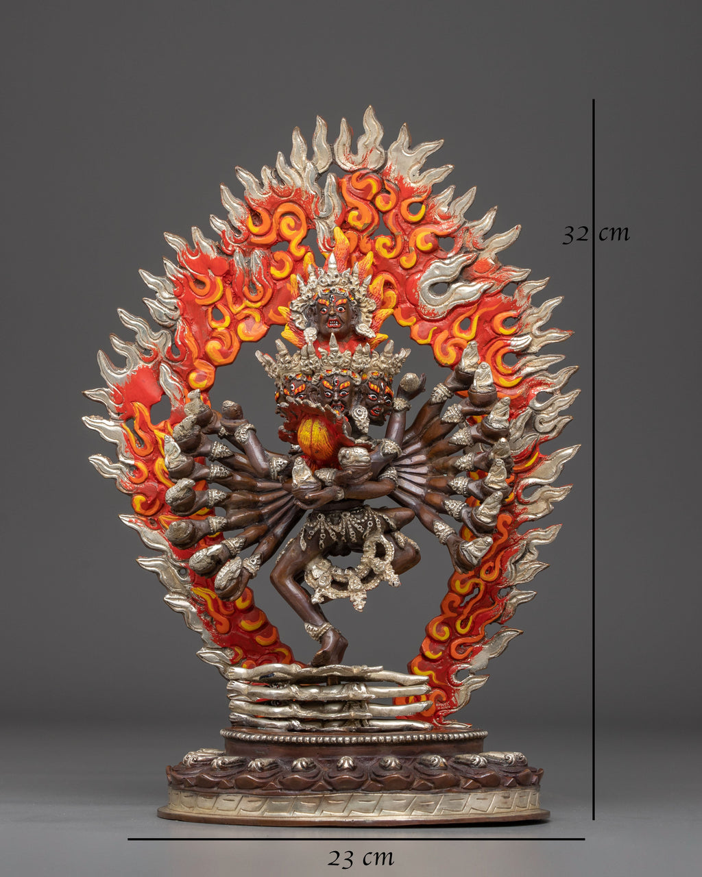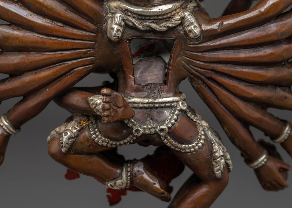 This statue, expertly created from oxidized copper and silver plated with detailed acrylic painting, exemplifies Nepalese craftsmen's mastery of ancient Himalayan workmanship. Each detail, from Hevajra's ferocious look to the ornate adornments, represents holy energy defeating illusion. The contrasting tones of silver and oxidized copper emphasize the spiritual equilibrium between light and shadow, which represents the balance required in Tantric meditation. The artistry exemplifies passion and skill, making this work a great spiritual and cultural treasure.