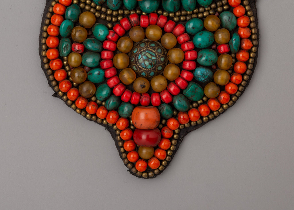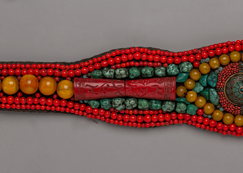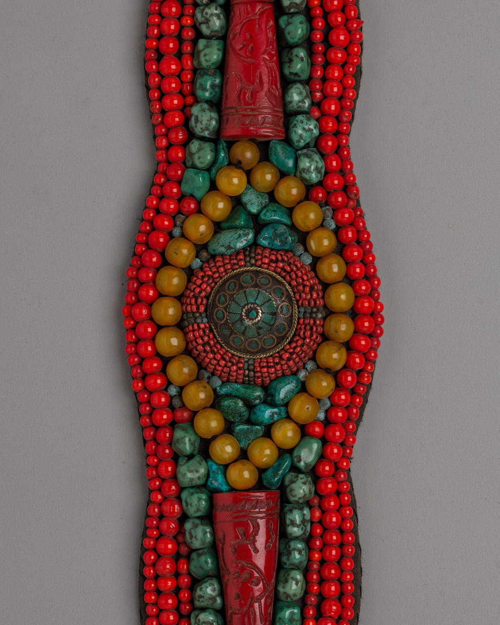 The belt is a wonderful example of Tibetan workmanship, with a linear design that embodies balance and stability. The coral and turquoise beads intertwined within the structure represent harmony and connection to the spiritual world. This item is frequently worn during traditional ceremonies or as a decorative adornment to emphasize cultural heritage and spiritual dedication. It might also be a thoughtful present for individuals who appreciate Tibetan artistry and spirituality.