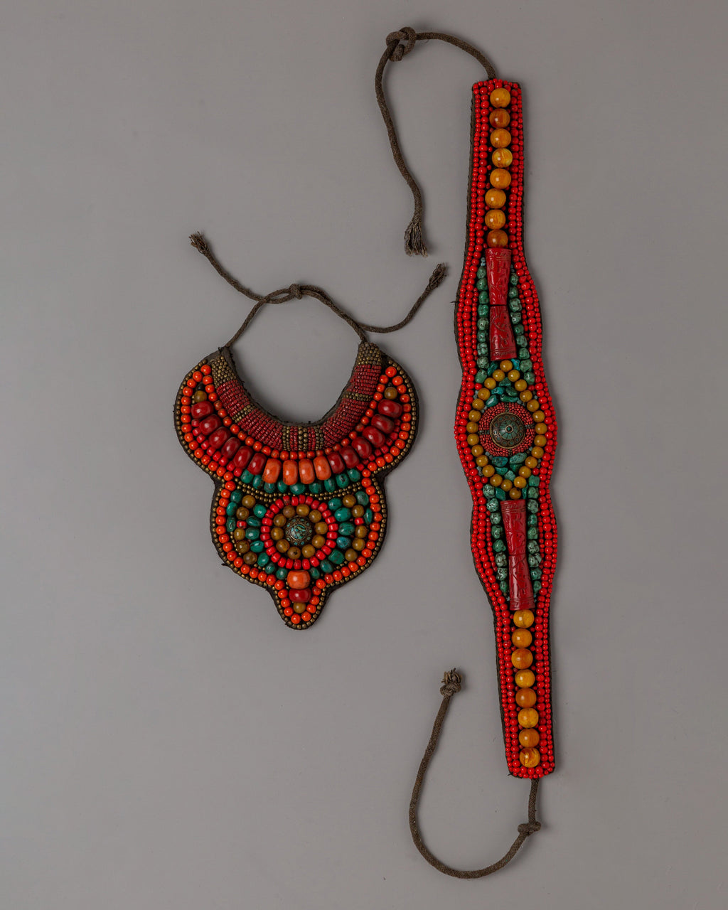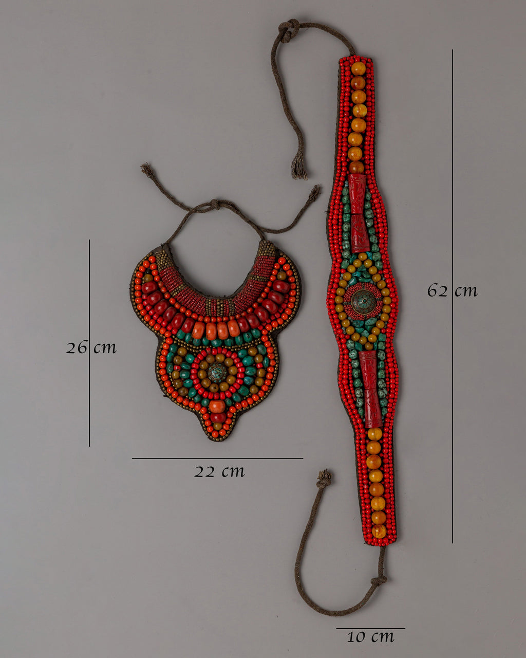 Our magnificent Tibetan Himalayan Belt & Necklace is a wonderful mix of craftsmanship and tradition. The necklace is 26cm in length and 22cm in breadth, while the belt is 62cm long and 10cm wide. With a total weight of 0.88kg, the set is light weight and comfortable to wear. Both products are beautifully created and embellished with colorful coral and turquoise beads, which represent spiritual equilibrium and cultural diversity.