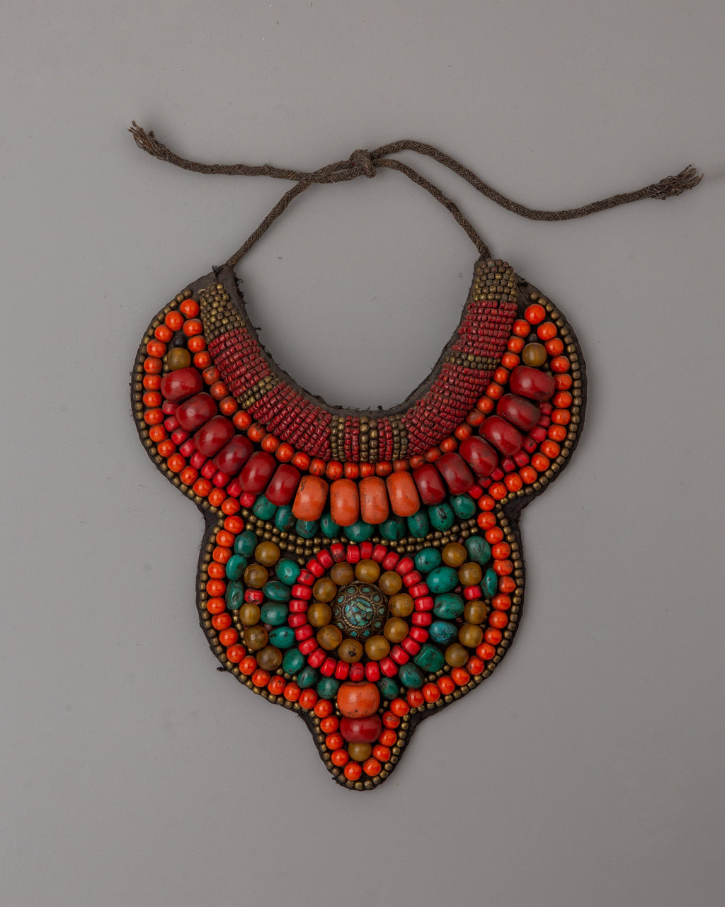 The necklace's strong and round design symbolizes the perpetual circle of life. Coral beads are usually connected with vitality and protection, whereas turquoise symbolizes calm, knowledge, and spiritual healing. The elaborate beadwork produces a striking centerpiece that suits both traditional and contemporary clothes, making it ideal for meditation, rituals, or as a statement jewelry item.