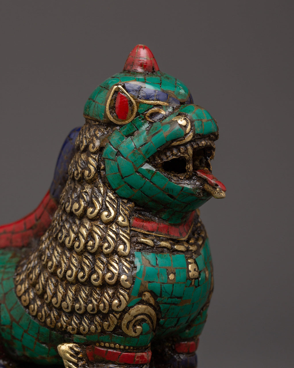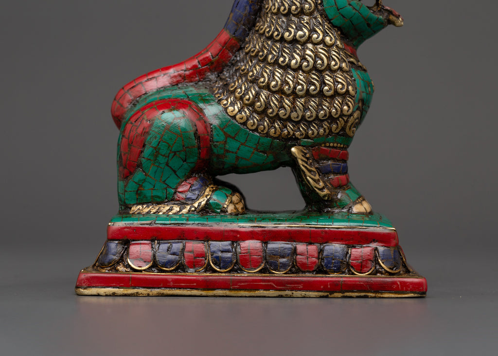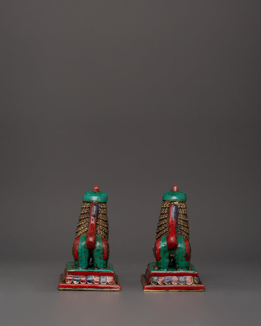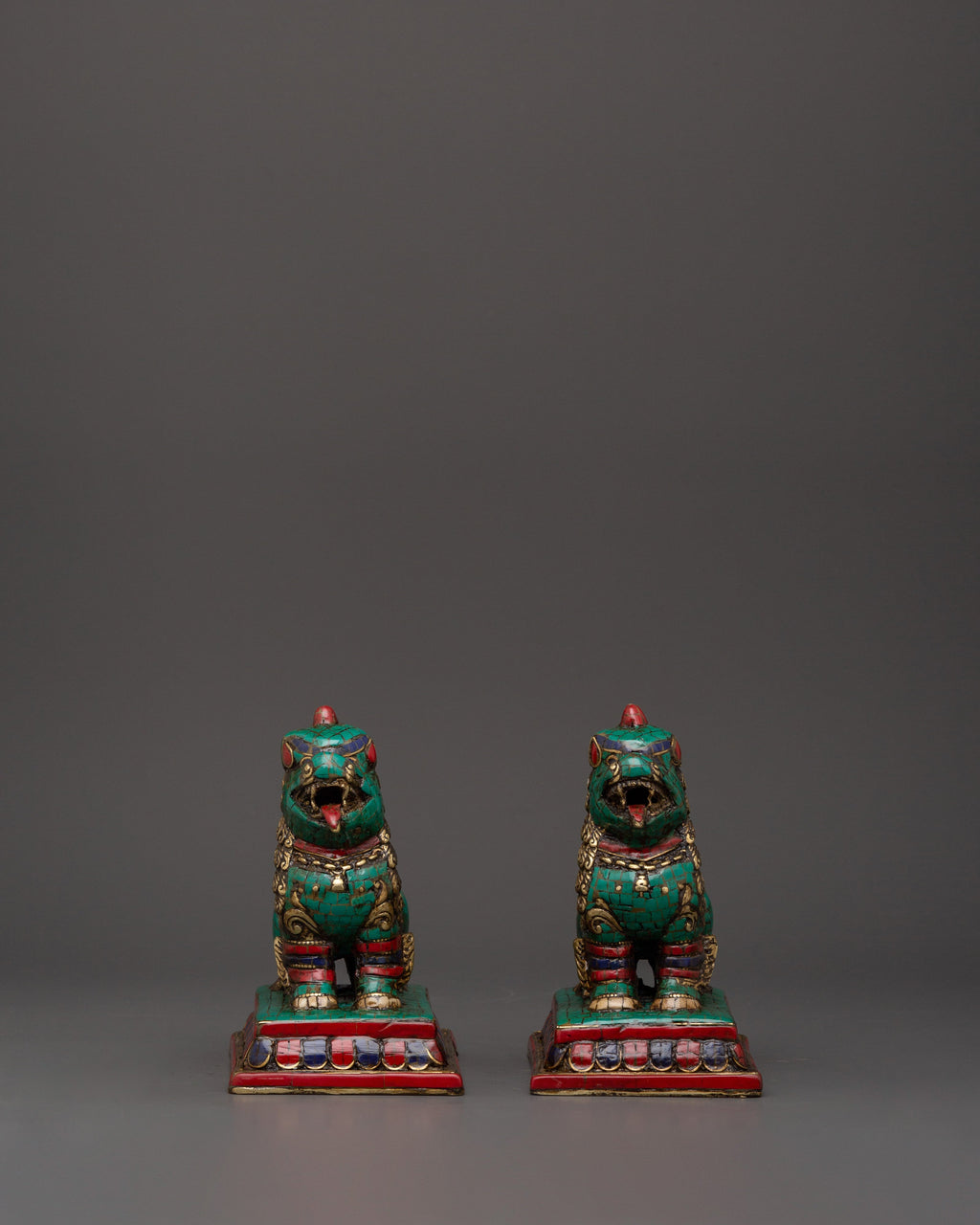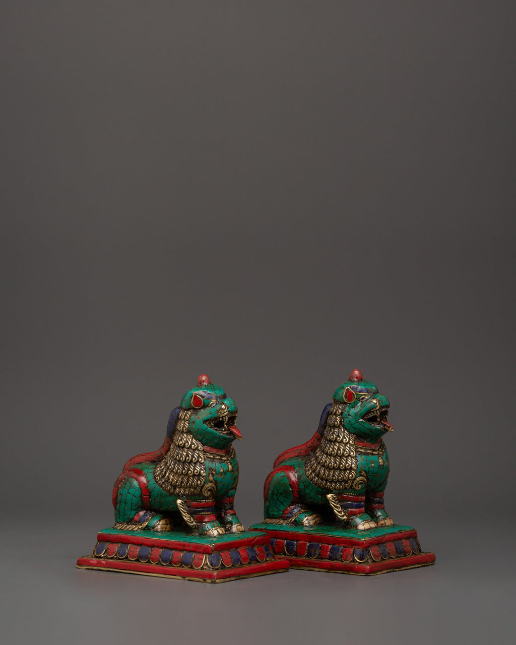 Tibetan Lion Set Brass Guardian Statues | Inlaid with Coral & Turquoise | Spiritual Protector