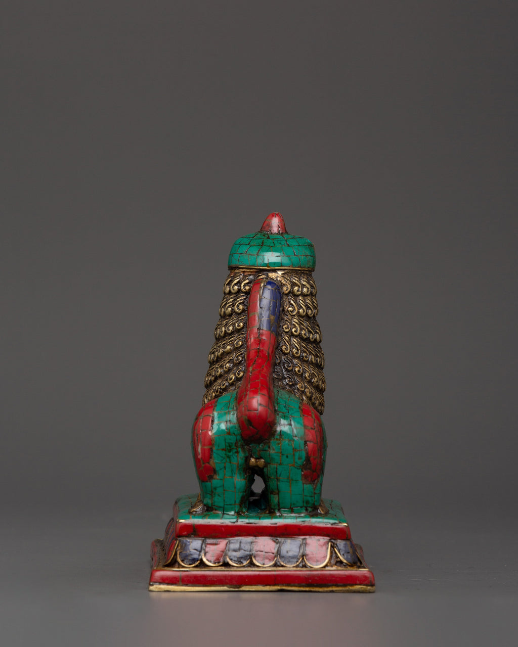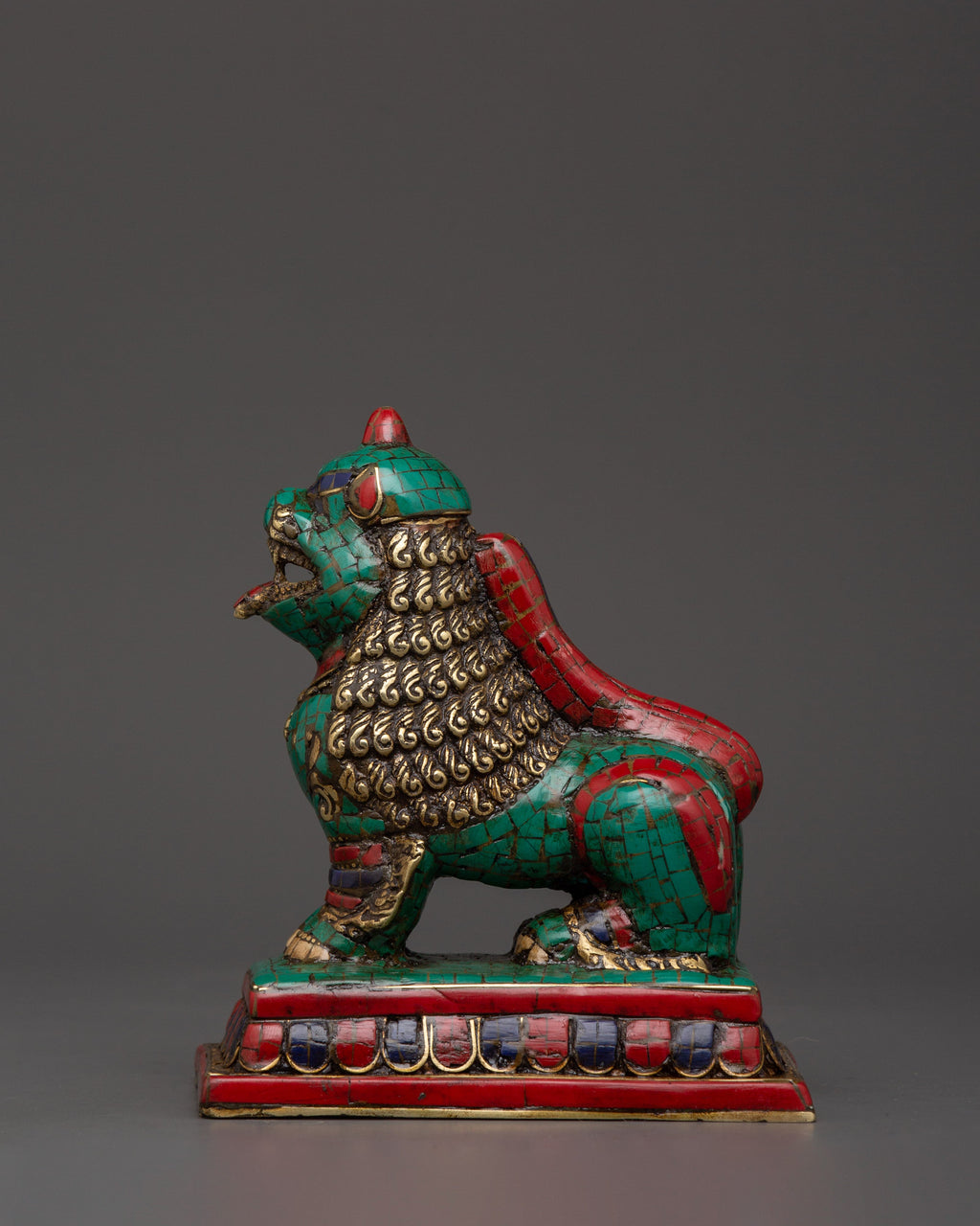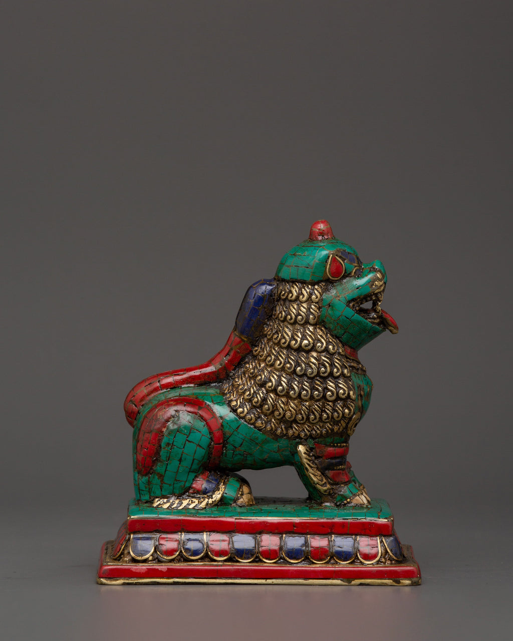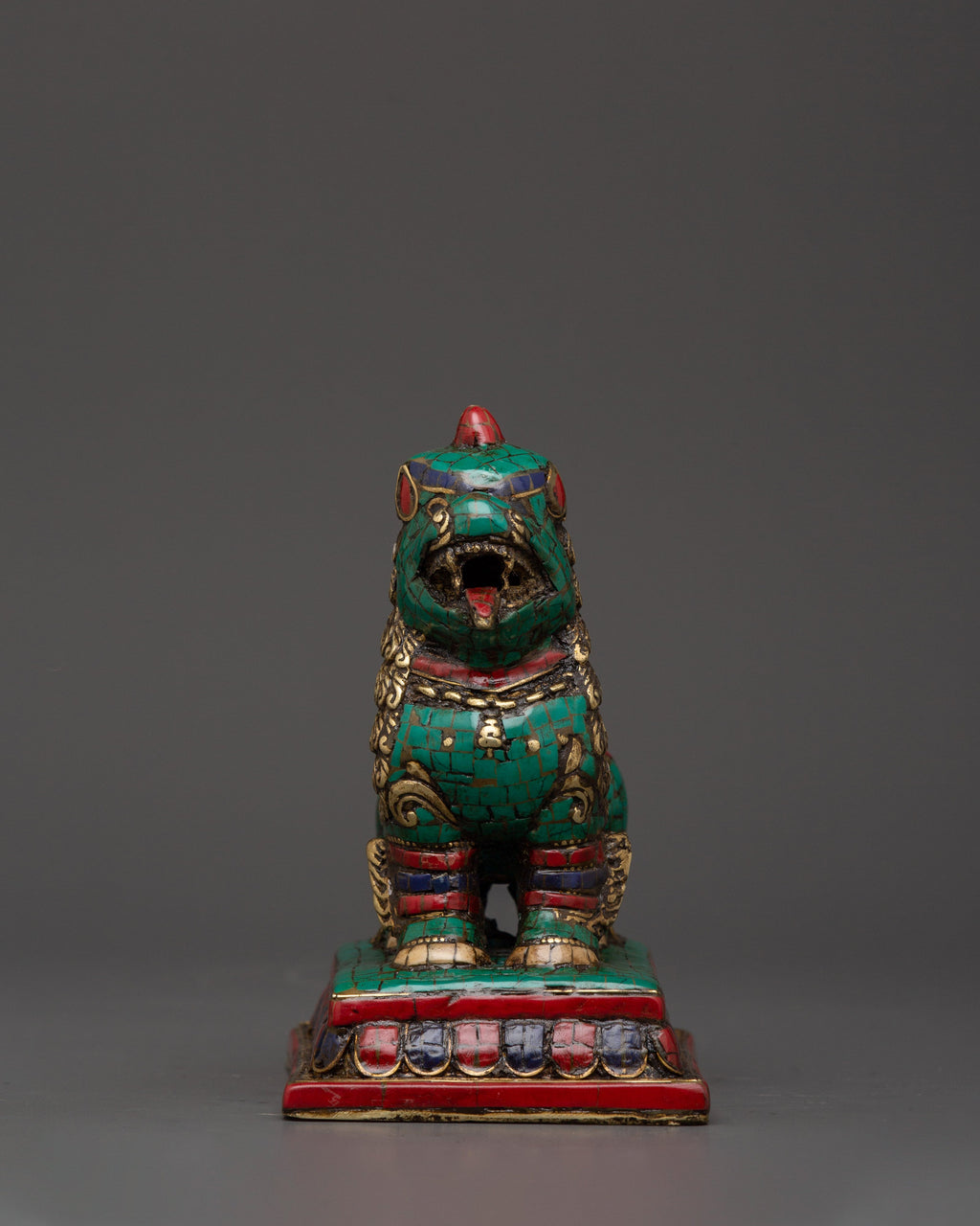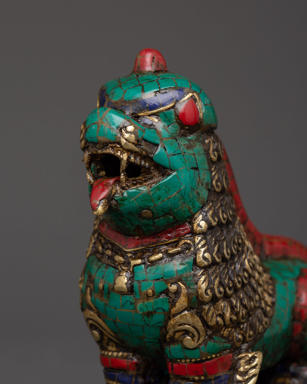 Tibetan Lion Set Brass Guardian Statues | Inlaid with Coral & Turquoise | Spiritual Protector