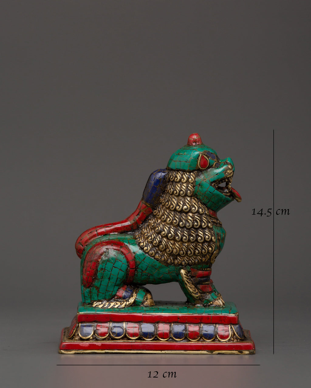 Bring the powerful force of safety and strength into your home with this Tibetan Lion Set of Brass Guardian Statues Inlaid with Coral and Turquoise. These sacred lion statues, which are frequently seen at the gates of Tibetan monasteries and temples, represent courage, stability, and spiritual protection. Each lion is meticulously carved from solid brass and embellished with brilliant coral and turquoise stones, evoking traditional Himalayan creativity. With a height of 14.5 cm and a width of 12 cm, this spiritual protector duo is a striking and essential addition to any setting.