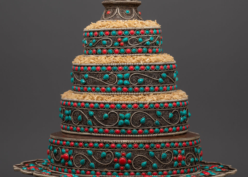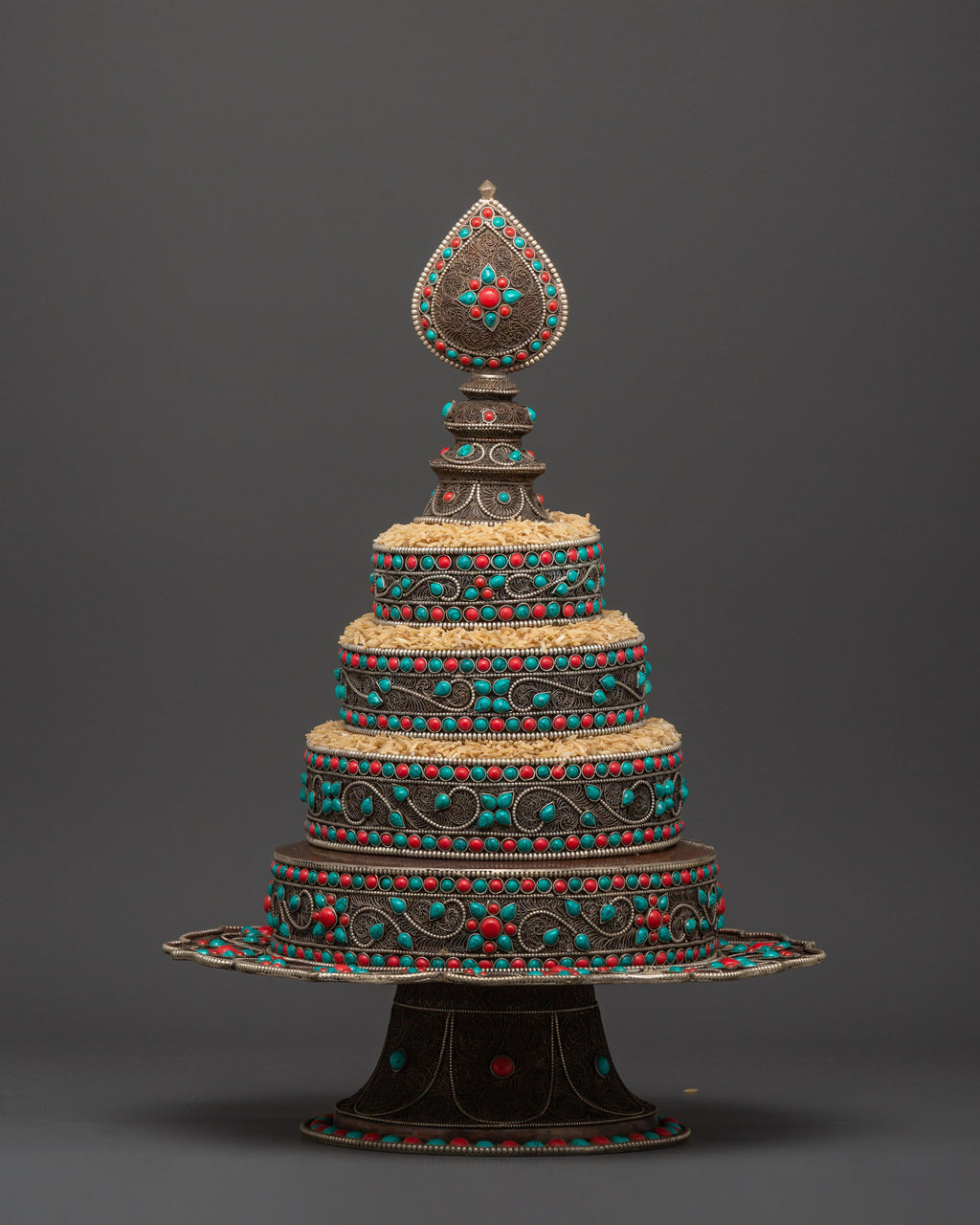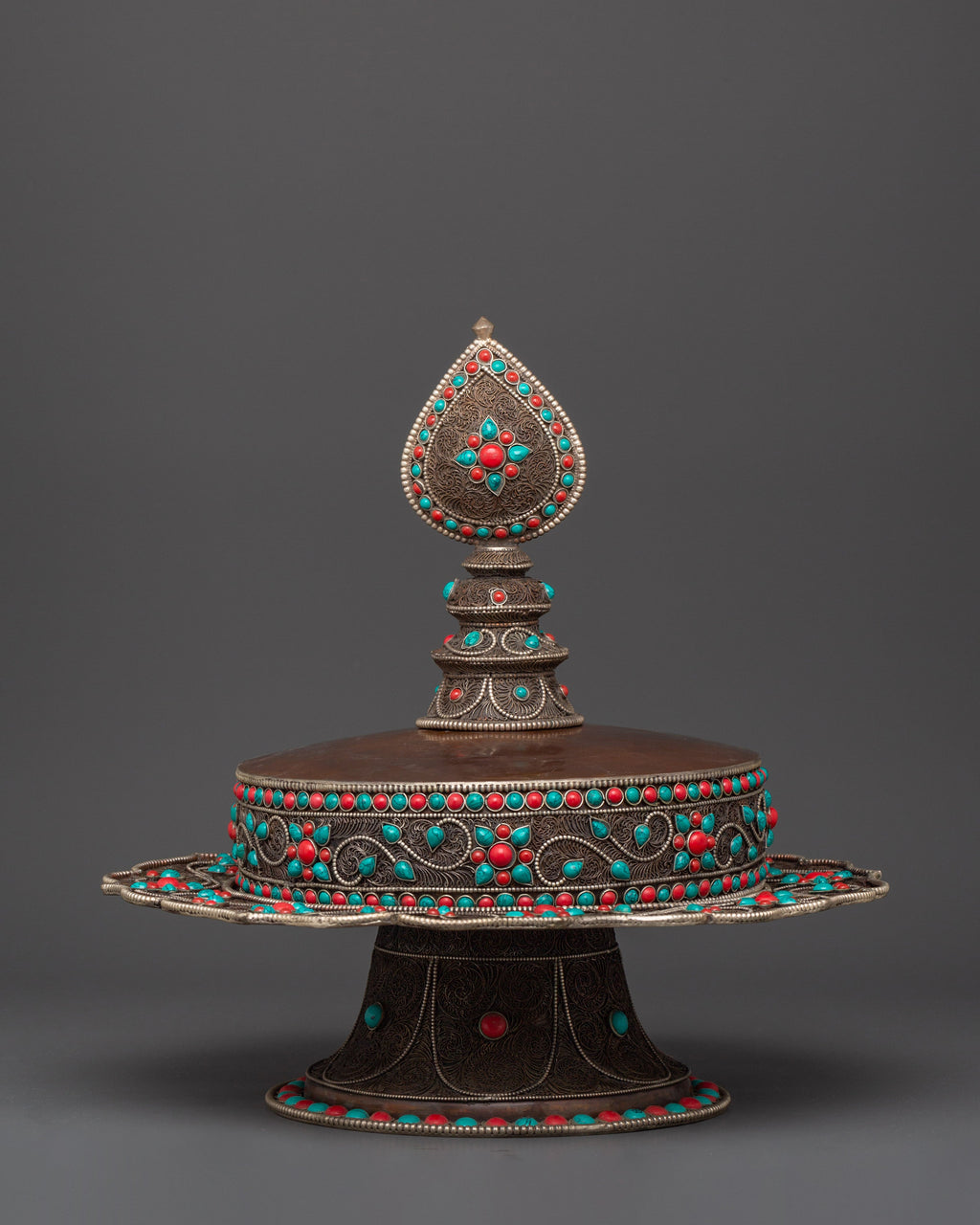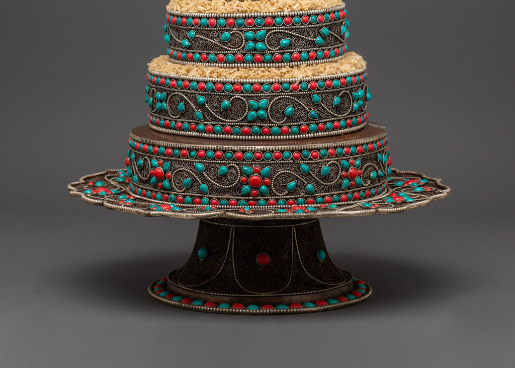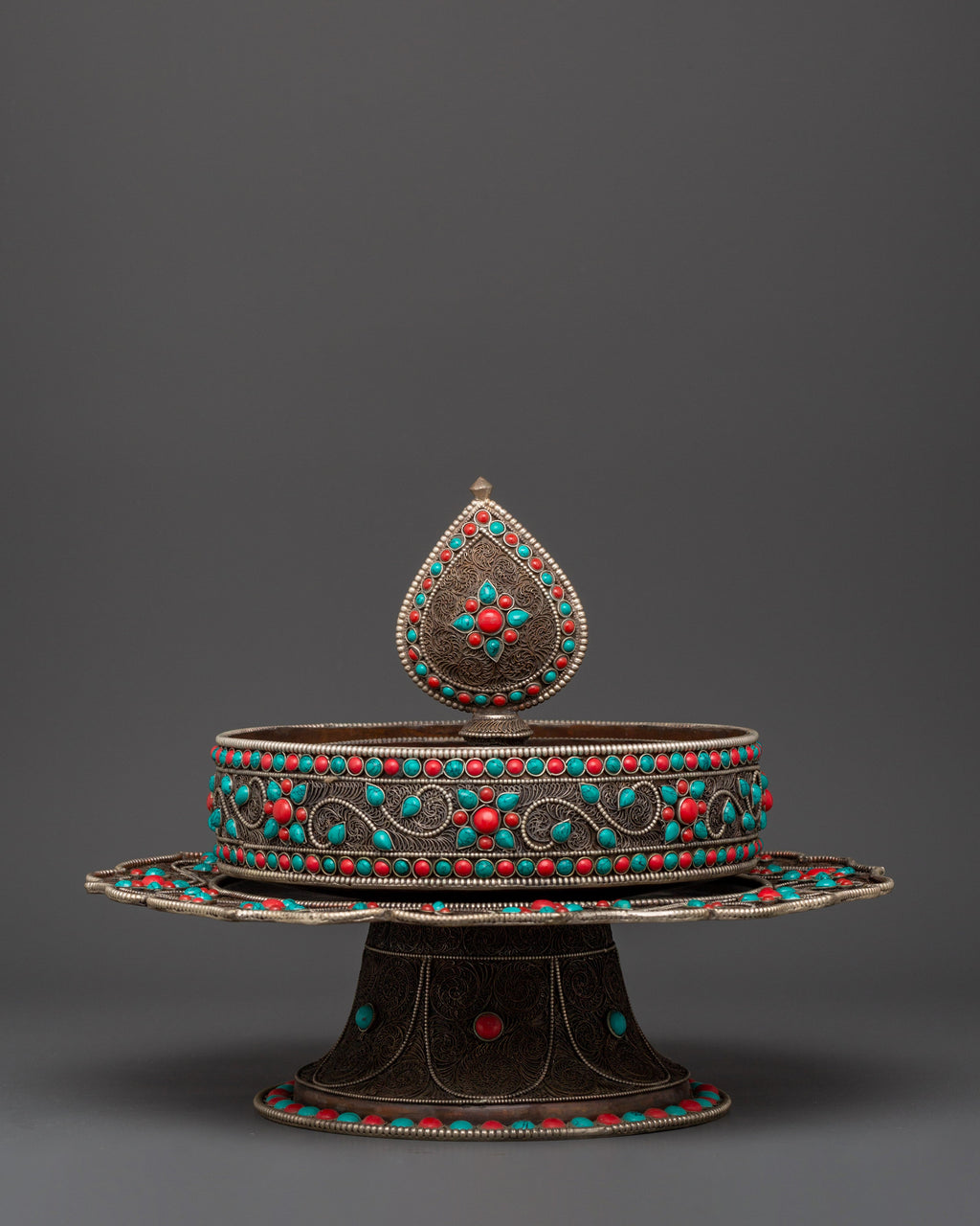 This gorgeous Tibetan Mandala Offering Set, a significant, handcrafted ritual item crafted from oxidized copper and silver plating, and embellished with Artificial coral and turquoise stones, will add sacred beauty and spiritual meaning to your home. Standing 43 cm tall, this mandala set is utilized in Tibetan Buddhist rituals that represent all of creation as a devotional and merit offering.