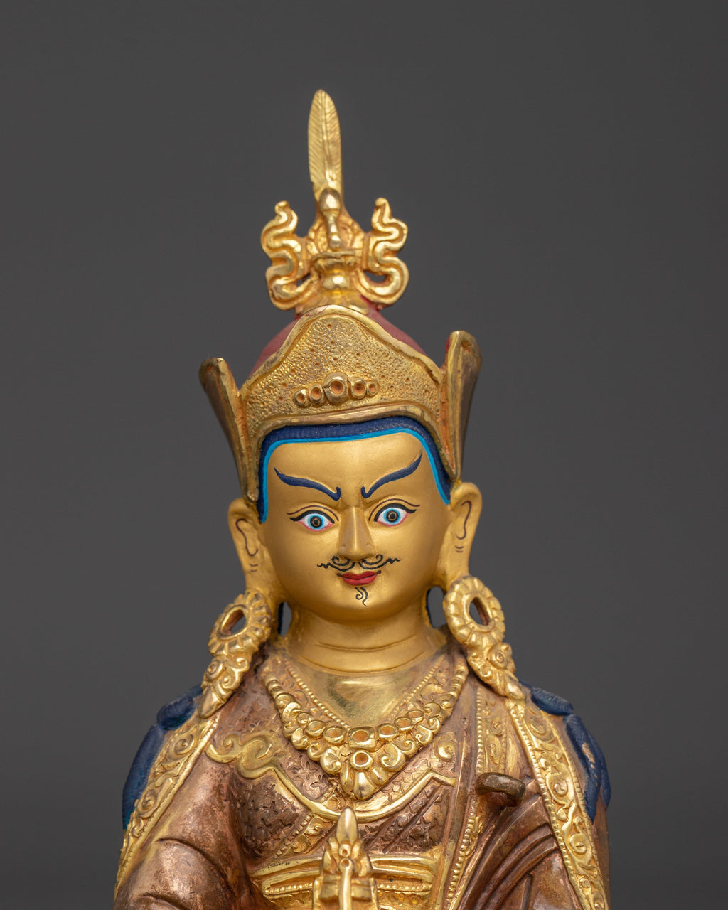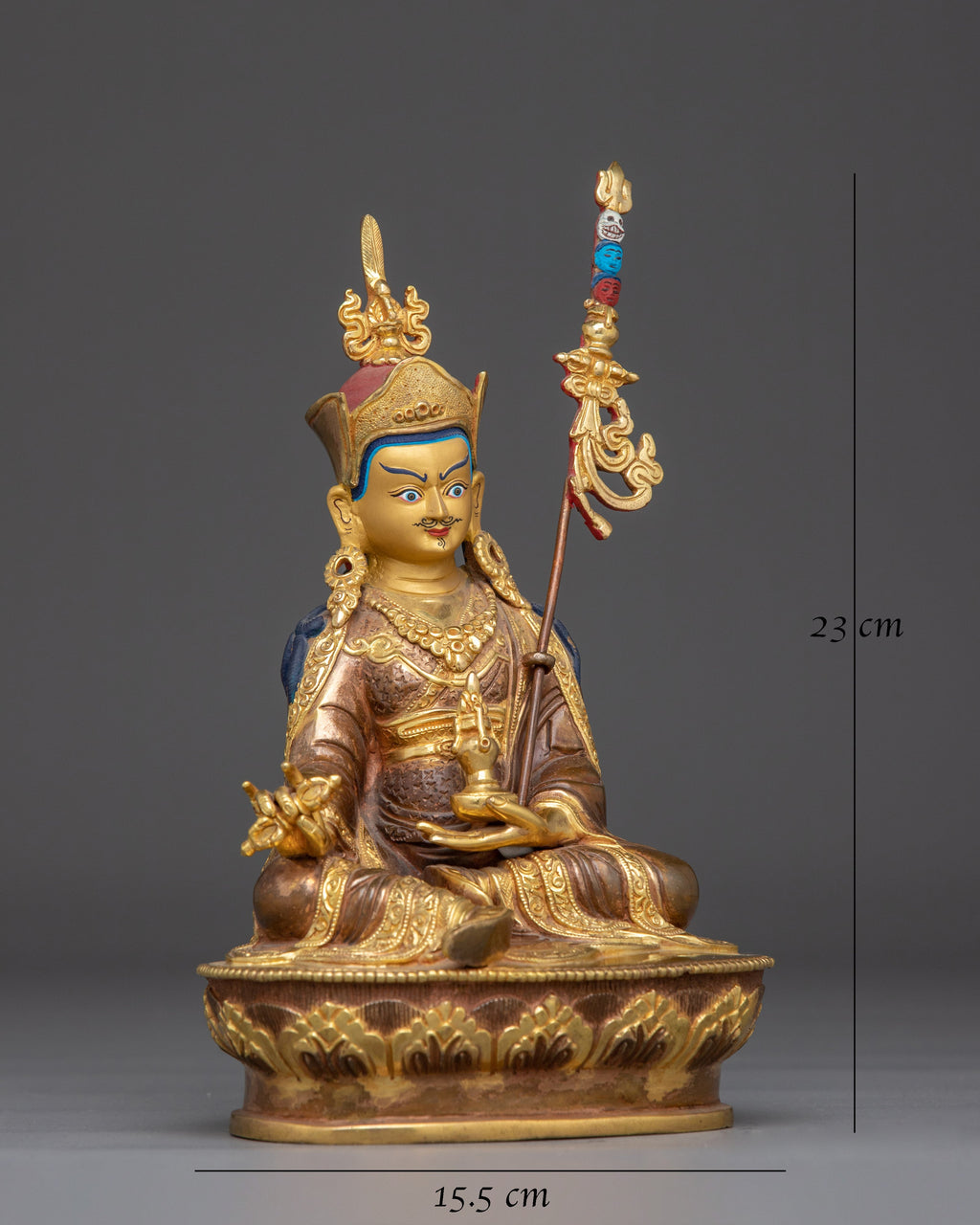 The Meditating Lord Padmasambhava Statue, the founder of Tibetan Buddhism, represents enlightenment, compassion, and spiritual mastery. This handcrafted statue is 9.1" (Height) x 6.1" (Base) and weighs 1.30 kg. It is made of solid copper, adorned with 24K gold gilding, and enhanced with detailed gold and acrylic paints. Created by expert Nepalese artisans, it represents Himalayan Buddhism's holy traditions, making it an appealing addition to altars, meditation places, or sacred collections.