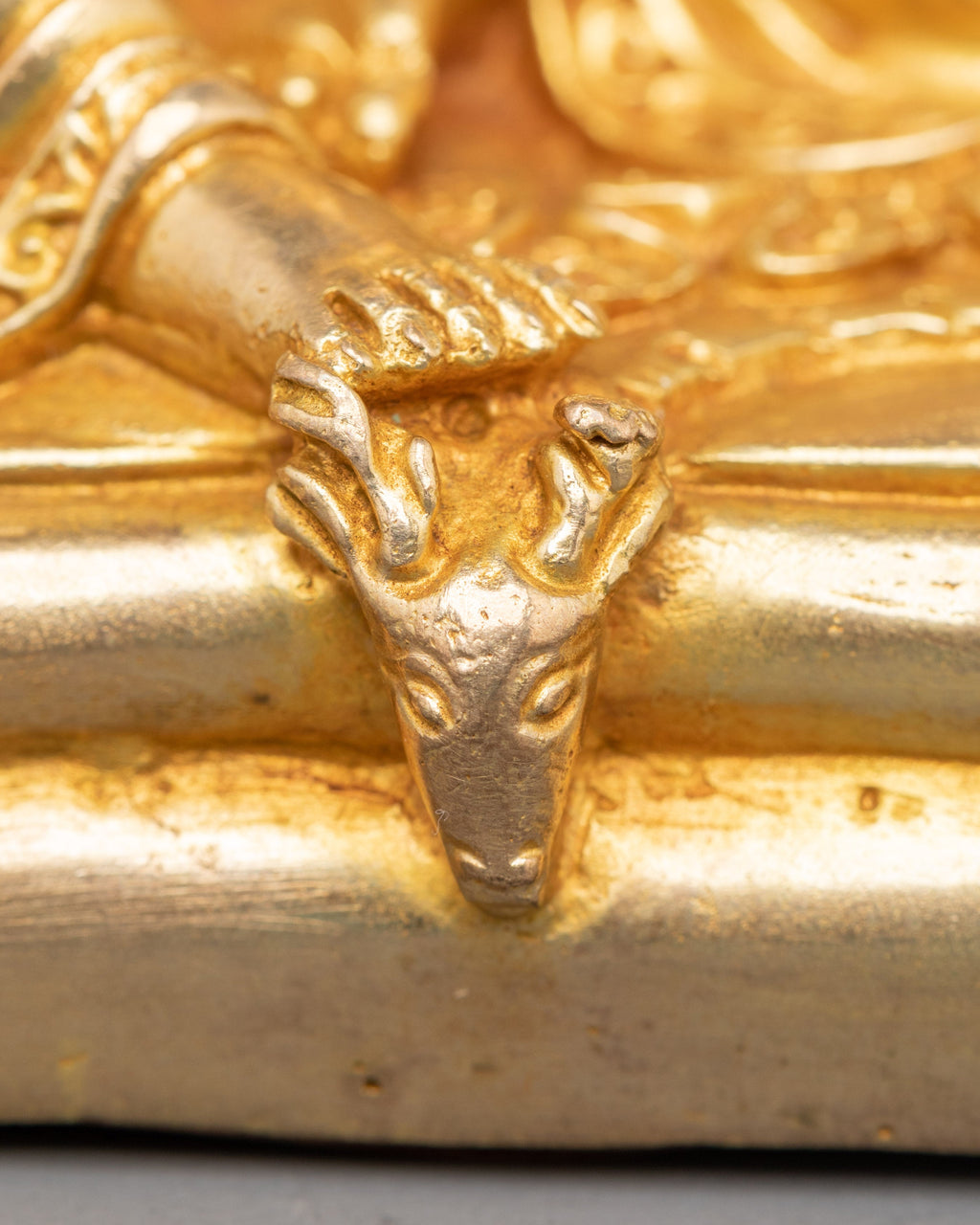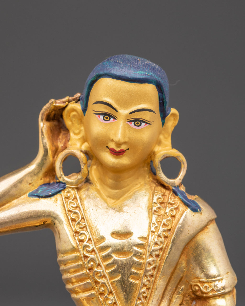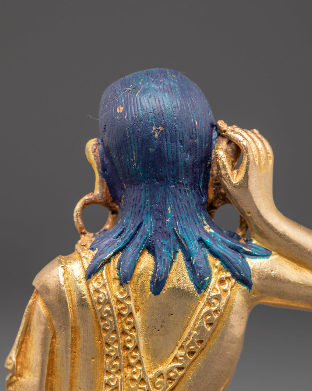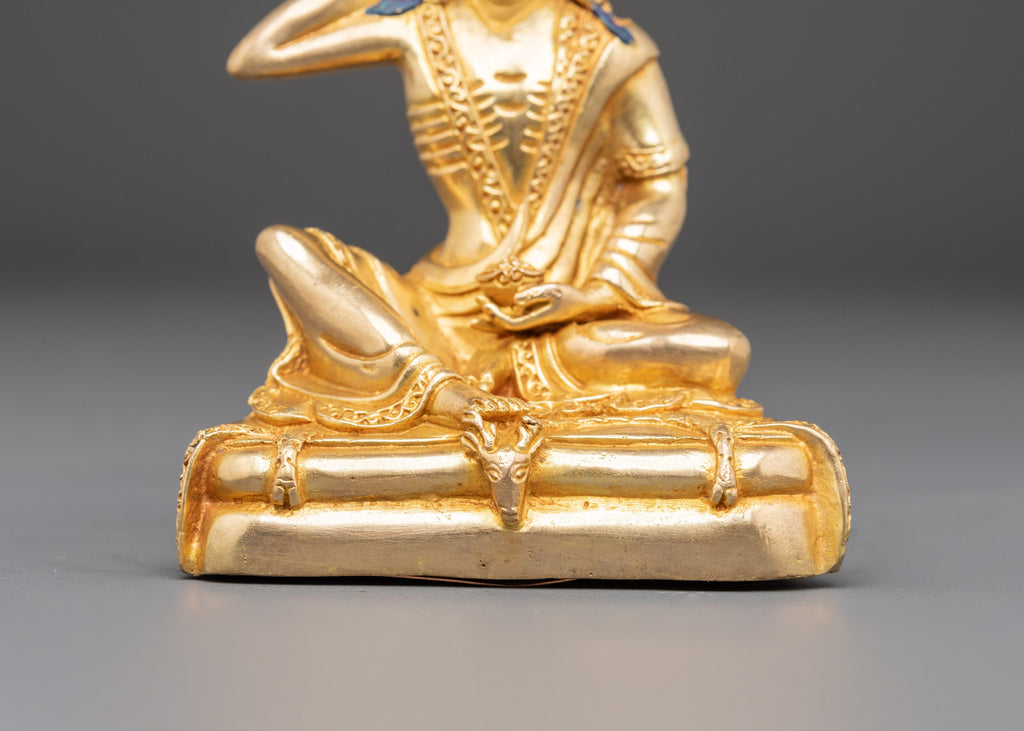 The fine craftsmanship highlights Milarepa’s iconic posture, with one hand raised to his ear, symbolizing his transmission of teachings through song and meditation. The gold plating enhances the sacred presence of this statue, while the copper base ensures strength and authenticity. Ideal for placement on an altar, meditation room, or as part of a Buddhist collection, this statue serves as a reminder of perseverance, discipline, and devotion to the spiritual path.