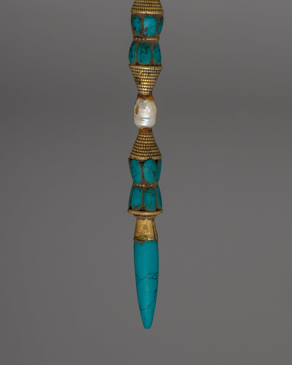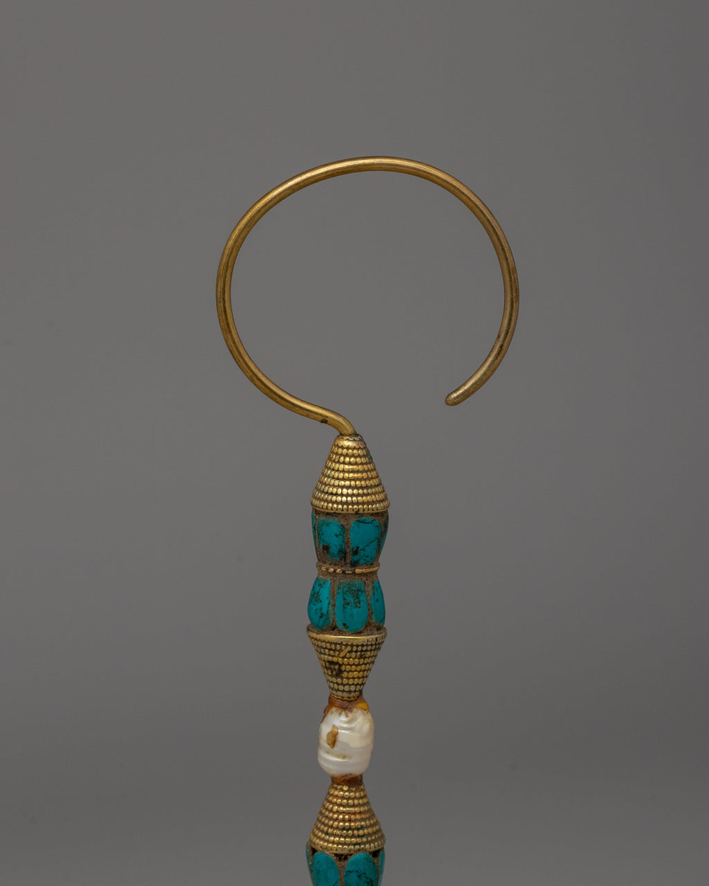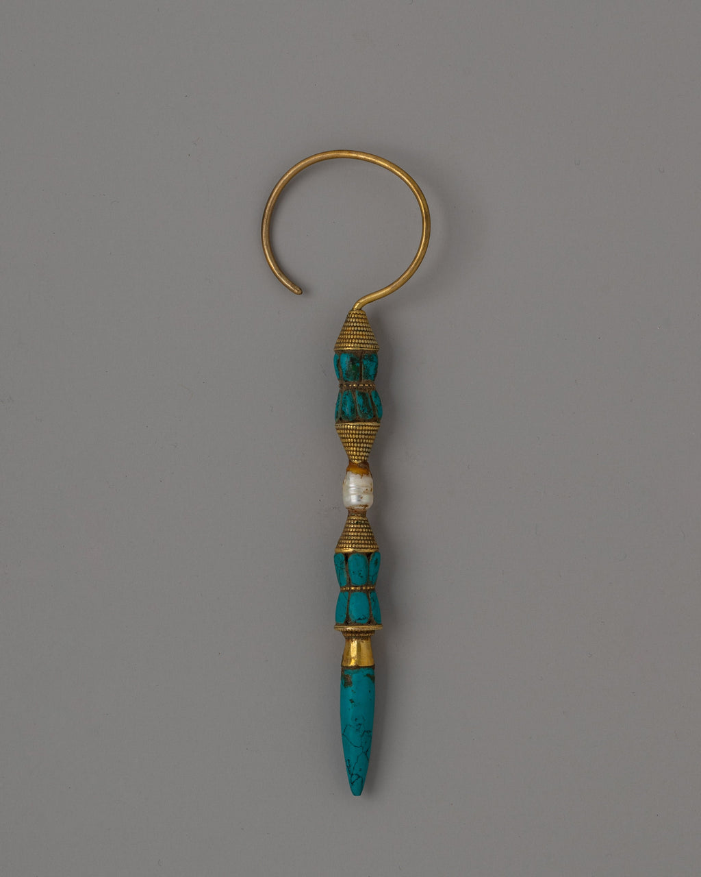 Experience the traditional elegance of the Tibetan Minister Earring, a magnificent piece of handcrafted jewelry with cultural significance. The earrings, made with 90% silver and gold-plated accents, highlight exquisite original turquoise and pearl stones, resulting in an appealing blend of traditional artistry and elegance. This stunning piece, measuring 14.5 cm in height and 4 cm in width, is lightweight (0.068 kg), making it ideal for wear or display.