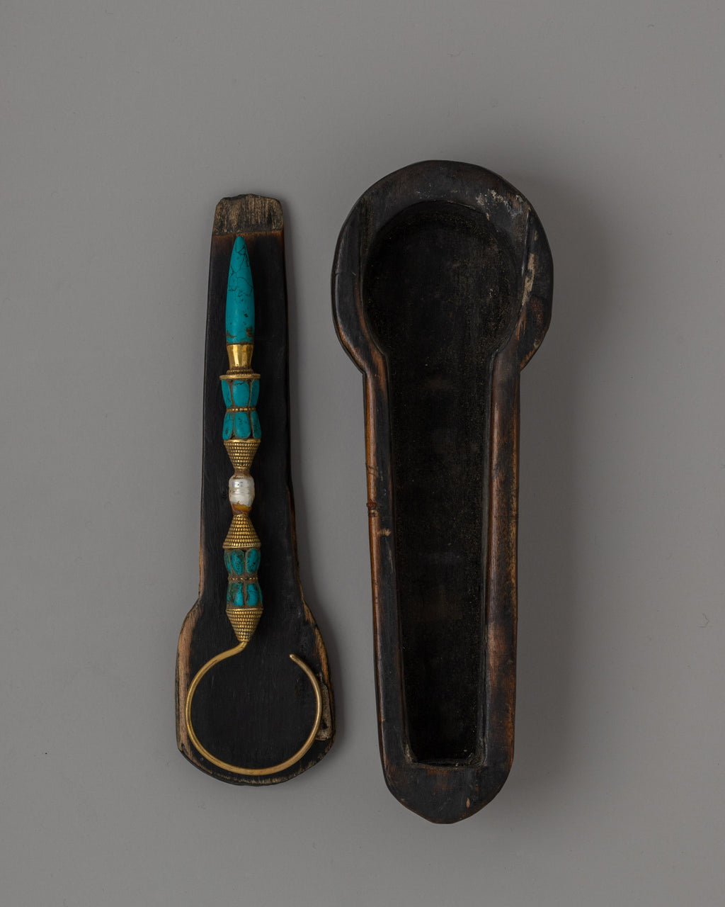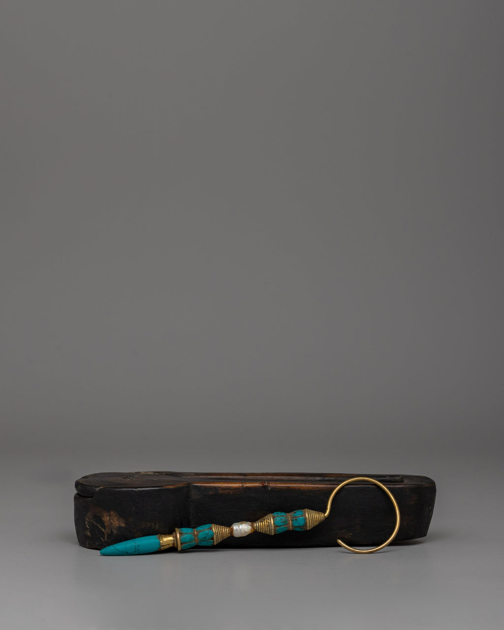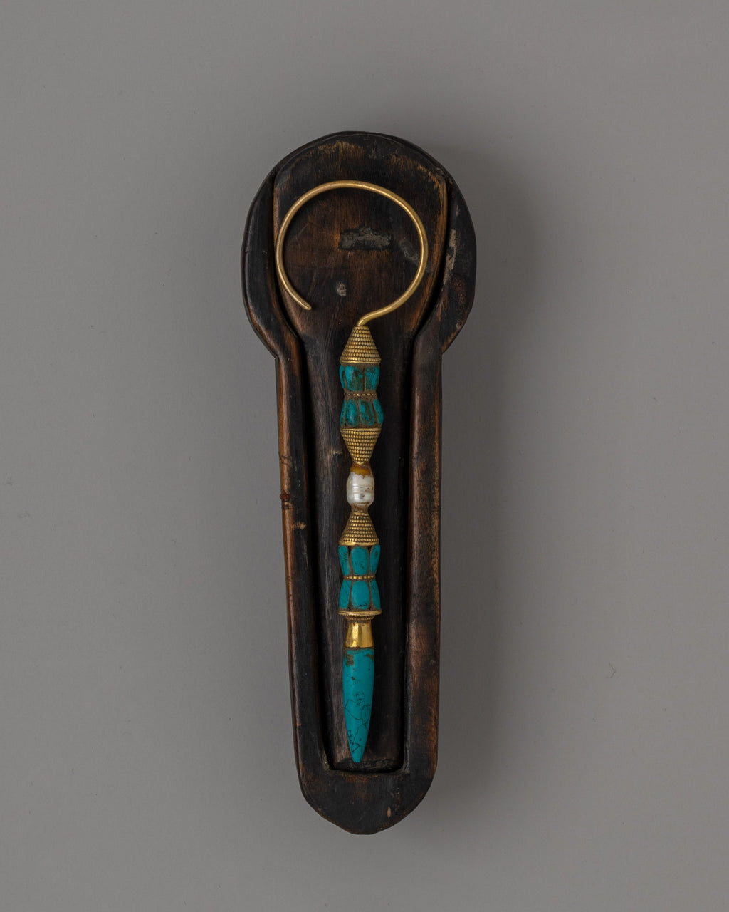 The earrings are packaged in a wonderfully constructed old box measuring 3.3 cm in height and 18 cm in width, retaining their historical charm and offering a striking presentation. This Tibetan Minister Earring, whether as an exclusive keepsake, a magnificent present, or an exquisite accessory, demonstrates Tibetan artists' rich legacy and skilled work. Ideal for individuals who value cultural treasures and beneficial jewelry.