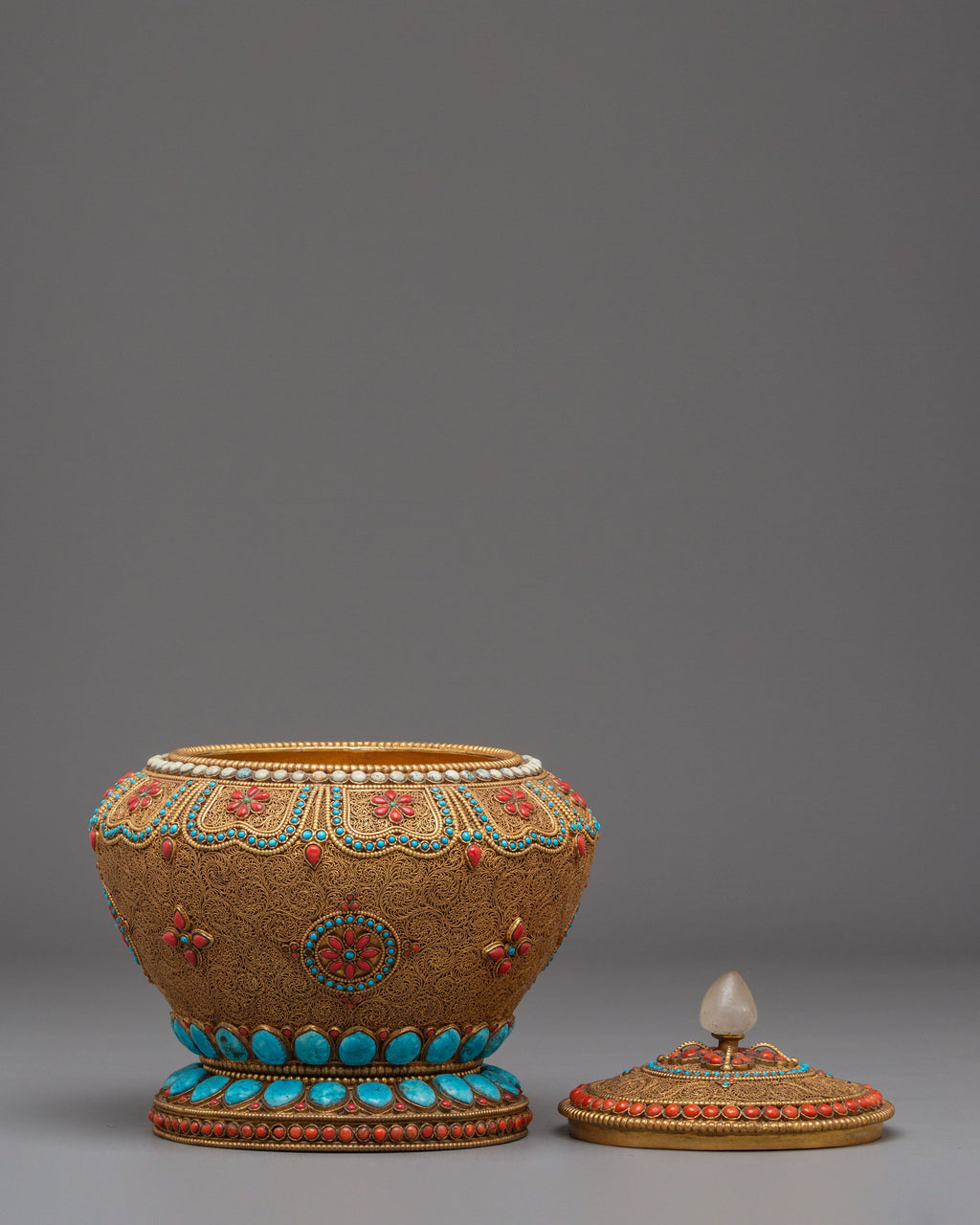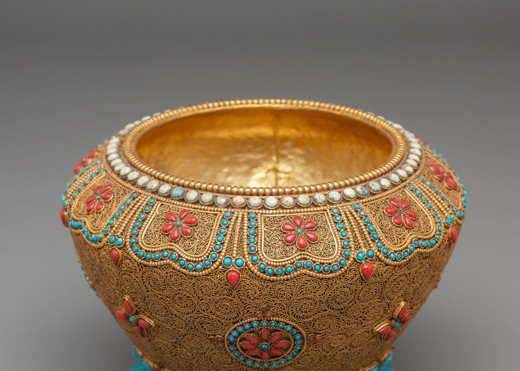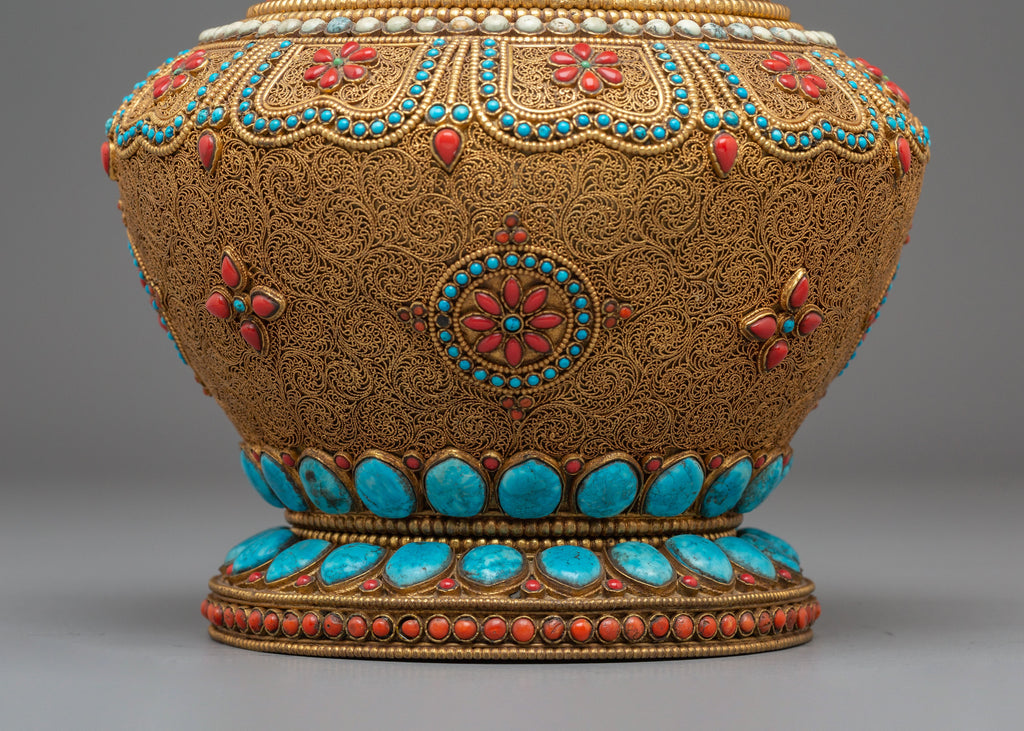 Tibetan Rice Pot | Spiritual Offering Pot with Semi-Precious Stones
