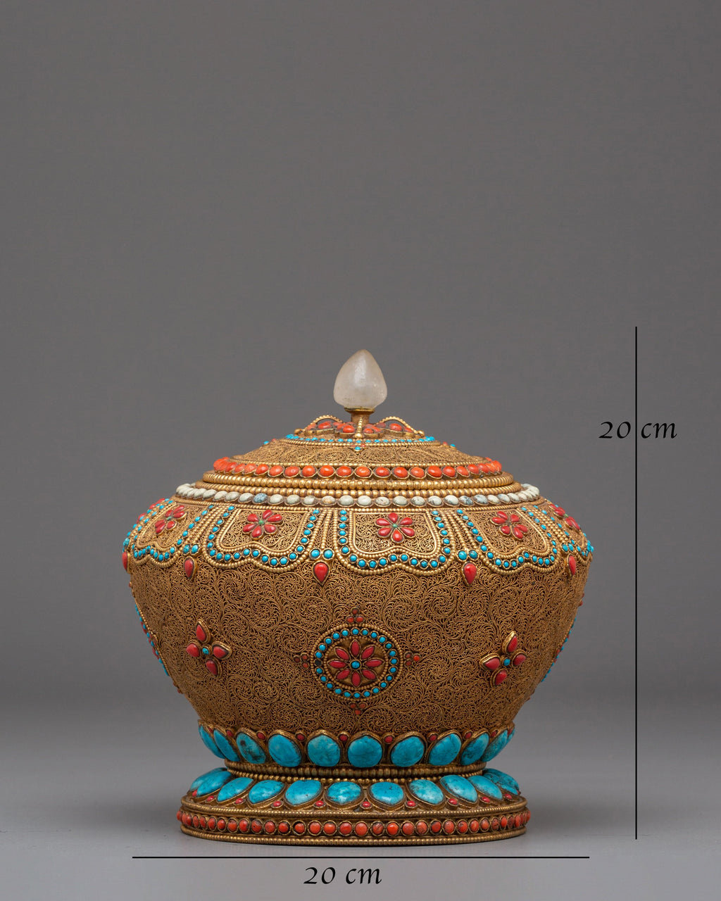 The Tibetan Offering Rice Pot is a beautifully crafted sacred vessel used in Tibetan Buddhist rituals, symbolizing generosity, abundance, and spiritual offerings. Standing at 20cm in height and 20cm in width, and weighing 1.72kg, this pot is made from high-quality copper, gold-plated for an elegant finish, and adorned with semi-precious stones such as coral and turquoise. The vibrant stones are strategically placed around the pot, creating an intricate design that enhances its spiritual and decorative significance. This offering pot is often used to hold rice or other offerings in ceremonies, helping to honor and show gratitude to deities and spirits.