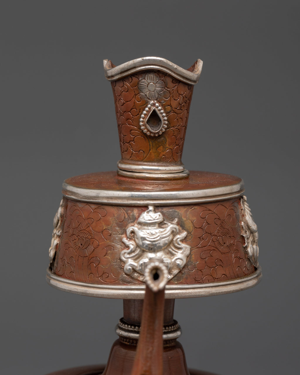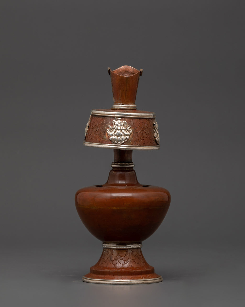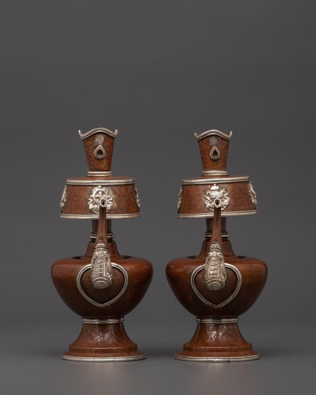 This Tibetan Oxidized Copper Bhumba Set, a delicately handcrafted set of water offering vessels, is ideal for spiritual ceremonies, altar blessings, healing rituals, and meditation activities. Each Bhumba is approximately 20 cm tall and 13 cm wide, making it suitable for home altars, shrines, or other spiritual spaces. This set, carefully crafted from oxidized copper with a brass interior and finished with silver plating, embodies the deeply rooted traditions of Tibetan Buddhist ceremonial craftsmanship. The antique patina and intricate design lend each item a classic, spiritual quality, making it ideal for creating a tranquil and sacred space.