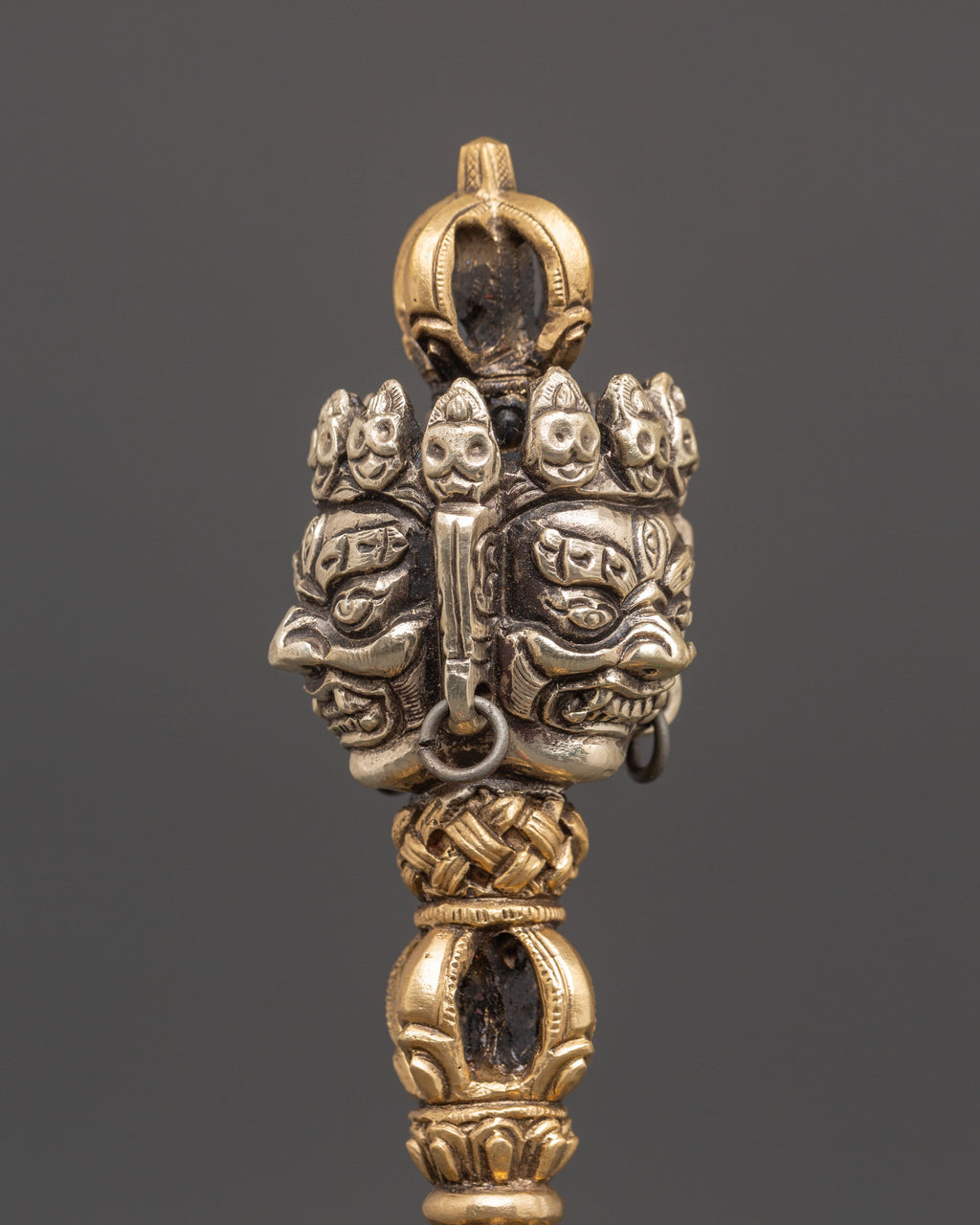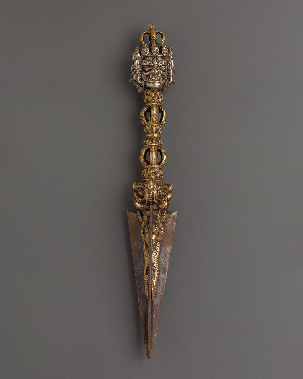 The ceremonial dagger (Sanskrit: Kila; Tibetan: phurba) is essential for expelling evil and is considered particularly effective in neutralizing the forces obstructing Tantric Buddhist practice. It has ancient origins, first appearing in the Indian Rig Veda as the core blade of the vajra used by Indra to destroy the primordial cosmic snake Vritra. Kila, derived from Sanskrit, was most likely associated with Vedic sacrifices. Meditation on the Vajrakila Tantra, an early Indian scripture first promoted in Tibet in the eighth century by Padmasambhava, one of the founding teachers of Tibetan Buddhism, is used to invoke the three-headed Vajrakila Buddha.