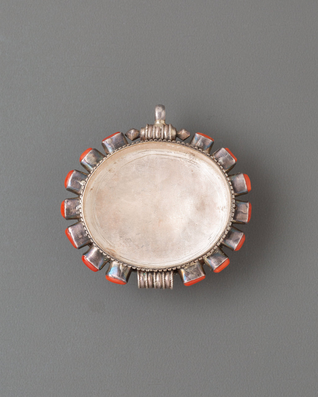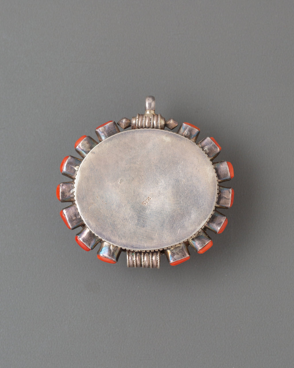 The design showcases delicate silver patterns surrounding a bold turquoise centerpiece, framed by coral accents that symbolize vitality and spiritual harmony. Turquoise is cherished in Tibetan culture for its healing and protective qualities, believed to bring peace and balance to the wearer. Coral, known for its warm red hue, signifies life, courage, and transformation. The harmonious combination of these stones creates a visual and spiritual balance — a representation of body, mind, and spirit working in unity. The detailed silverwork mirrors ancient motifs often found in Himalayan temples and sacred artifacts, making this pendant an actual work of devotional art.