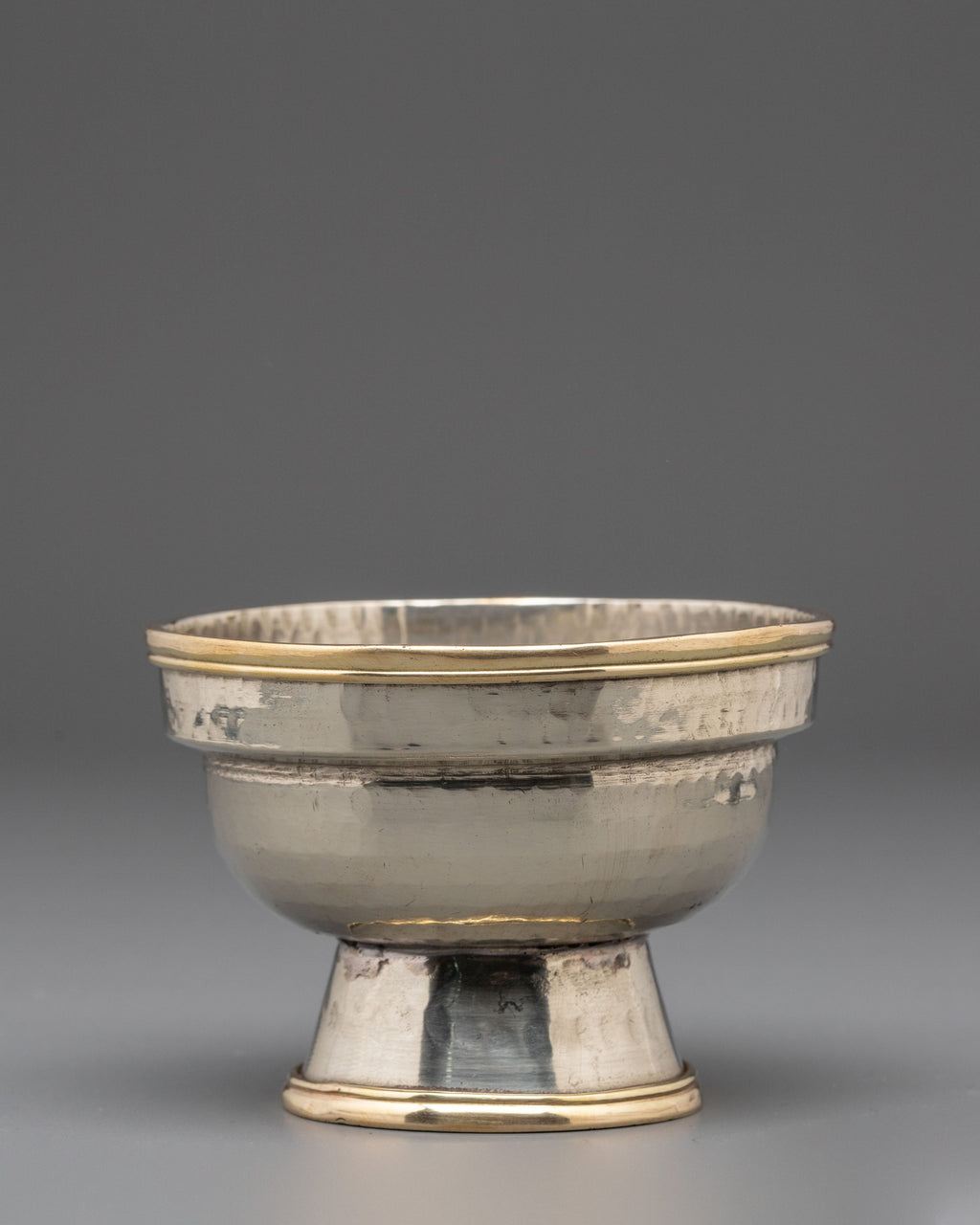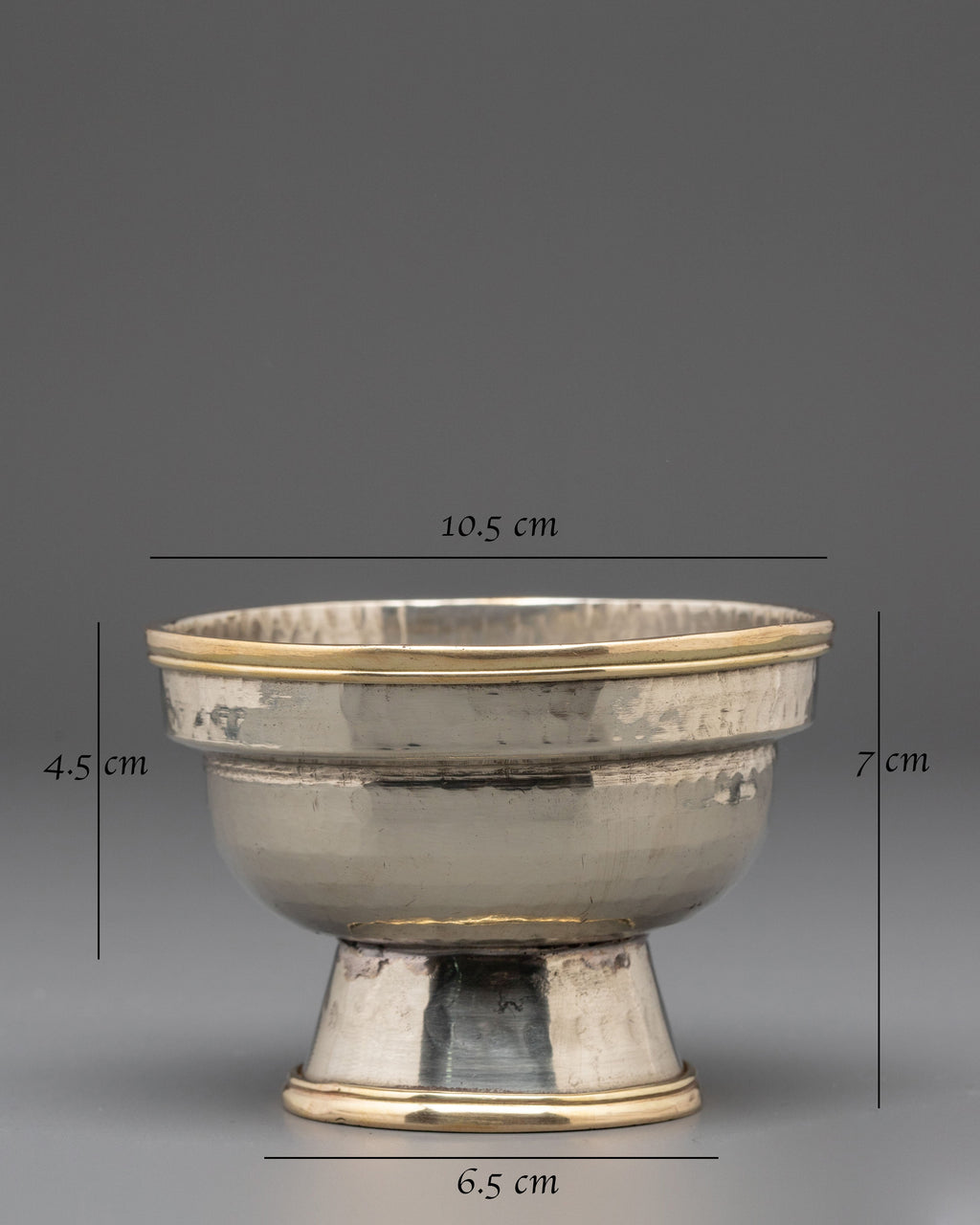 The hammered texture and white metal finish create an aura of simplicity and refinement. The design reflects traditional Himalayan craftsmanship, with clean lines and a polished sheen that symbolize clarity and spiritual purity. The copper foundation adds warmth and strength, while the white metal exterior enhances spiritual intention, protection, and inner harmony. These bowls are not only functional but also visually uplifting, making them a beautiful focal point on any prayer altar.