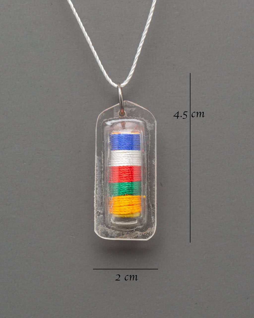 This Tibetan Protection Amulet is a traditional Buddhist charm, handcrafted with sacred threads that represent the five elements and the five Buddha families. Each color—blue, white, red, green, and yellow—embodies a unique spiritual energy that harmonizes mind, body, and spirit. The threads are carefully wound around a sacred canvas core and sealed in a clear plastic case, allowing you to carry the blessings of peace, protection, and mindfulness wherever you go.