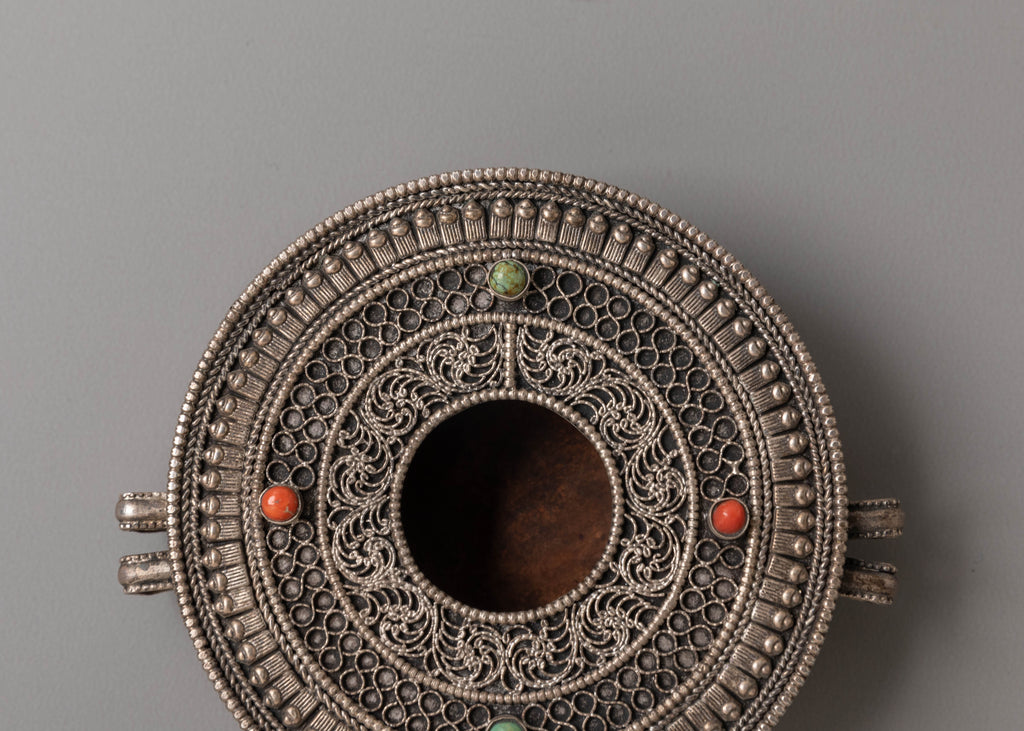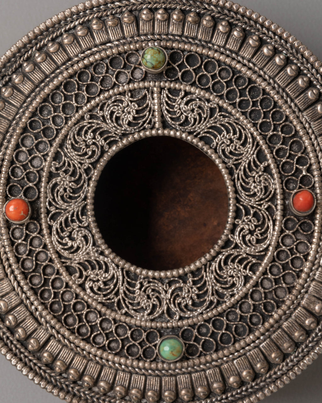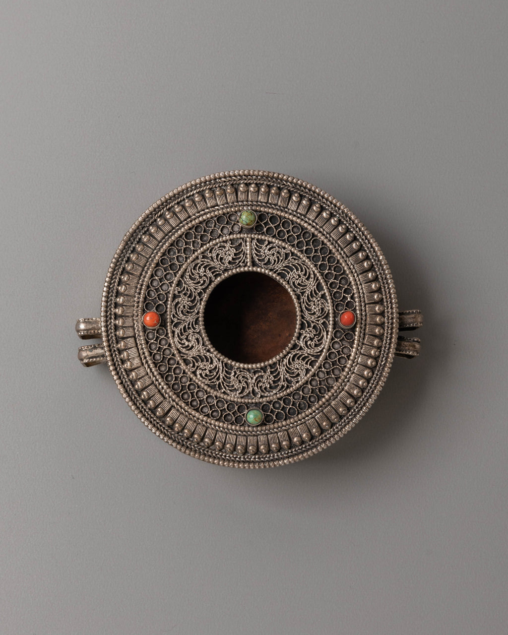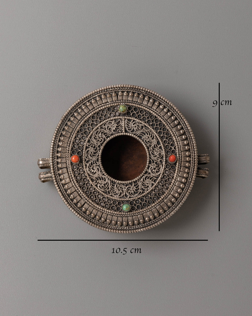 The Tibetan Protective Ghau Box Amulet is crafted with a copper body and silver-plated artistry, adorned with authentic turquoise and coral stones. Its circular form features refined filigree patterns and traditional Himalayan metalwork, creating a captivating spiritual centerpiece. The central opening is designed to hold sacred mantras, blessing scrolls, or small relics, allowing the wearer to carry a personal field of spiritual protection.