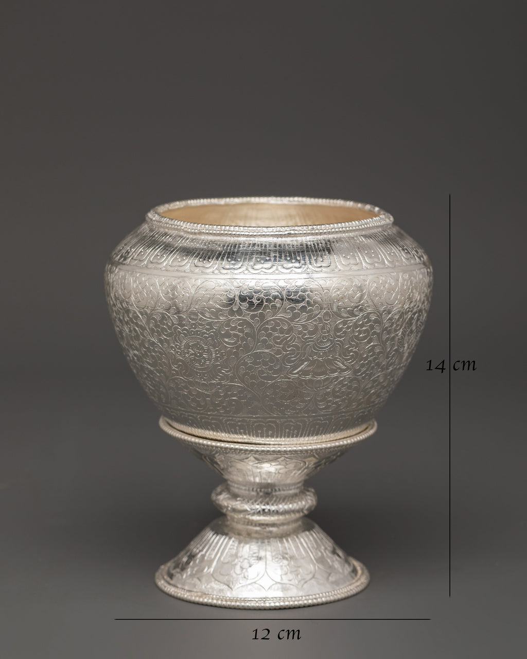 This Tibetan Pure Silver Golpa Rice Pot with Stand makes a beautiful and significant addition to any meditation altar or spiritual decor collection. This gorgeous offering bowl measures 14cm in height, 12cm in width, and features an 8cm base. It is skillfully fashioned from pure silver and contains detailed floral engravings on both the golpa and its matching stand. The elegant floral patterns represent progress, purity, and the flowering of spiritual knowledge. This lovely item, ideal for use as a spiritual offering pot, altar decor piece, or ritual vase, adds tranquility, beauty, and deeper intention to your home, shrine, or meditation area. Its style makes it an eye-catching centerpiece for spiritual displays or a thoughtful gift for mindfulness practitioners, Buddhists, or those with a Tibetan connection.