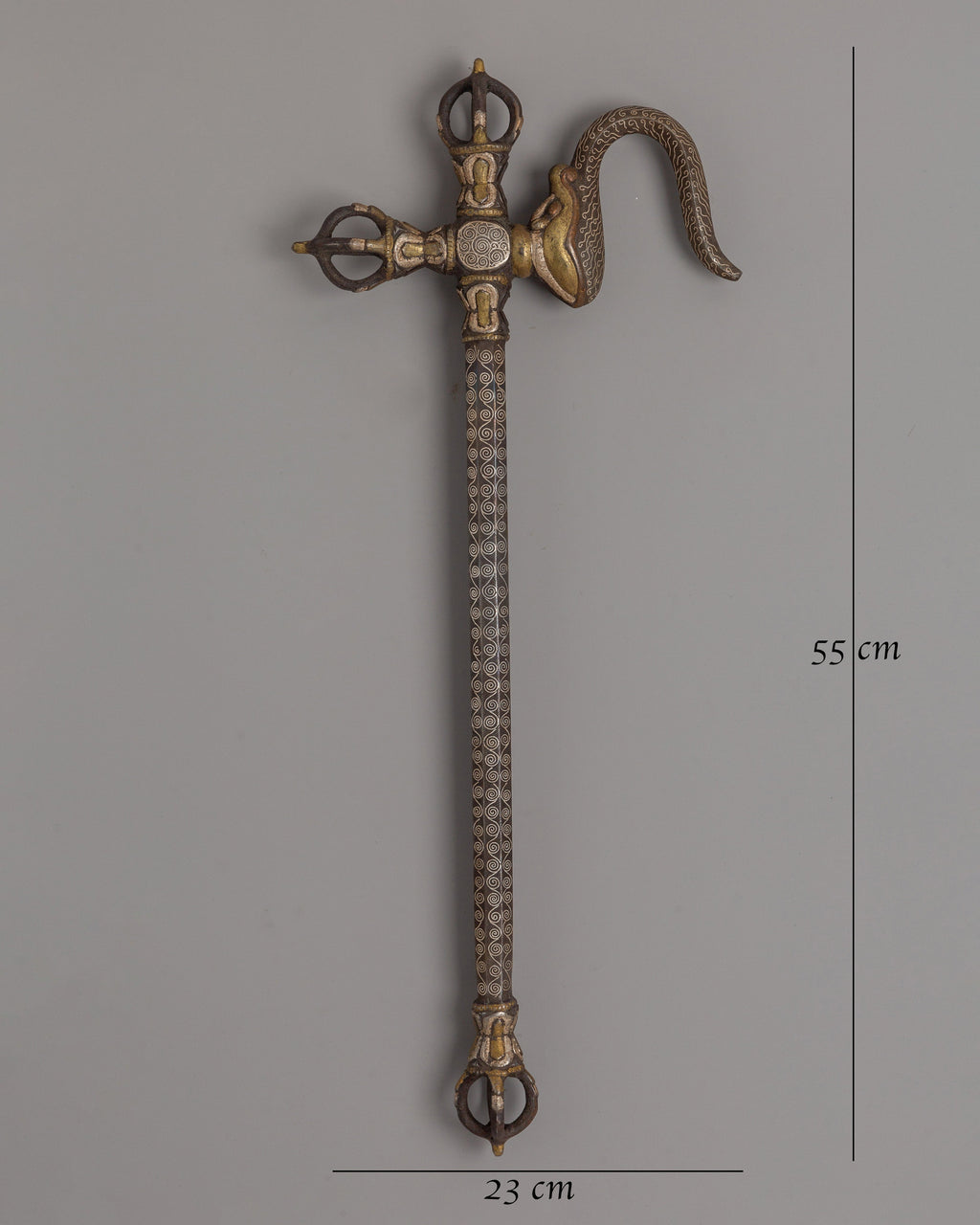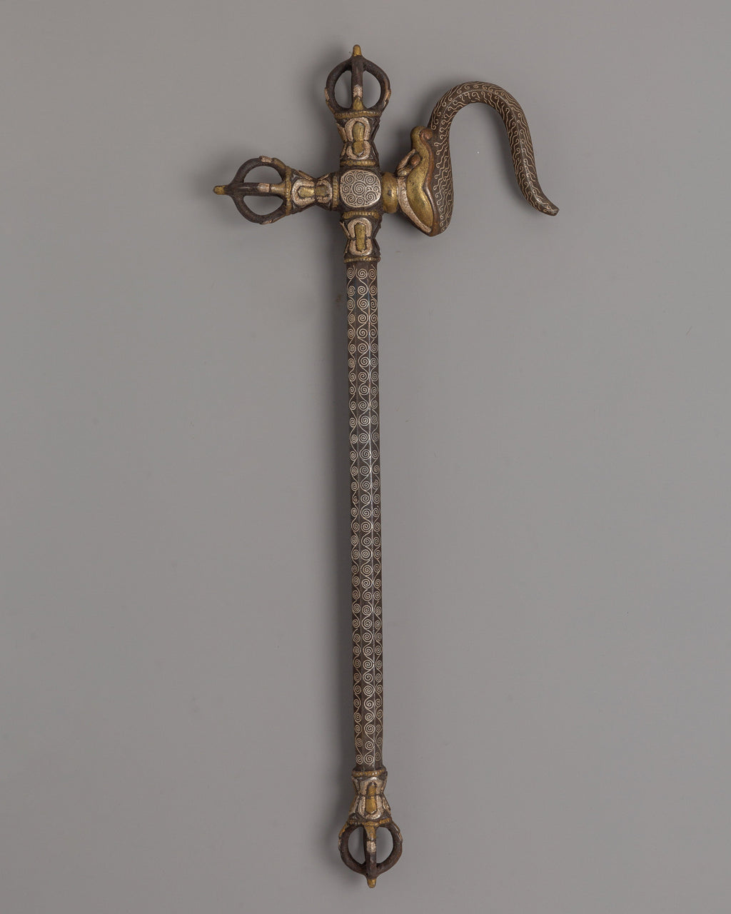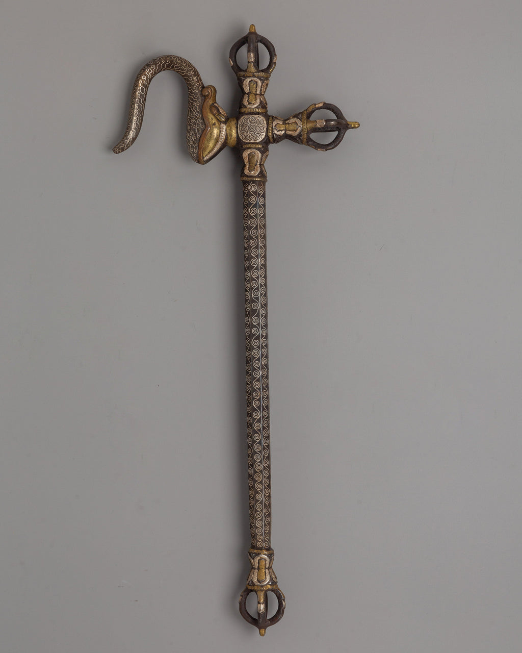 This ritual hook (ankusha) resembles the tool used by mahouts to keep elephants under control. According to its Buddhist ritual purposes, multiple half vajras are affixed to its handle, and its blade emerges from the mouth of the Makara sea monster. The hook is commonly utilized as part of the power activities of tantric rituals that try to subdue and tame entities via brilliance. It is most usually wielded by red deities linked with these activities, such as the dakini Kurukulla or Ganapati, the Buddhist equivalent of Ganesh, the well-known elephant-faced god.