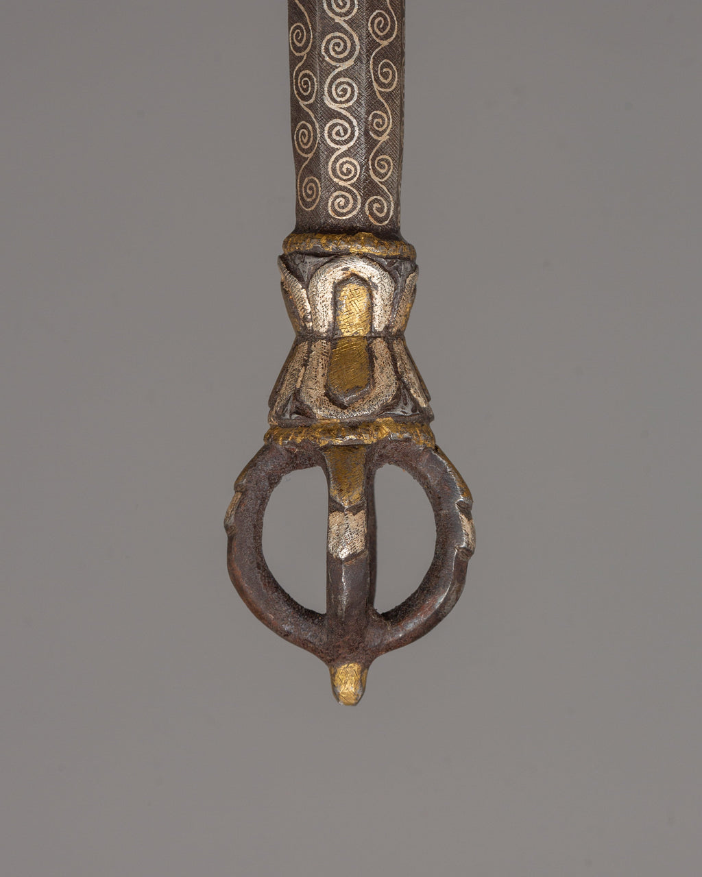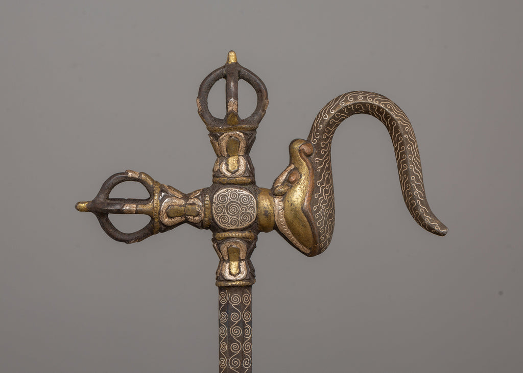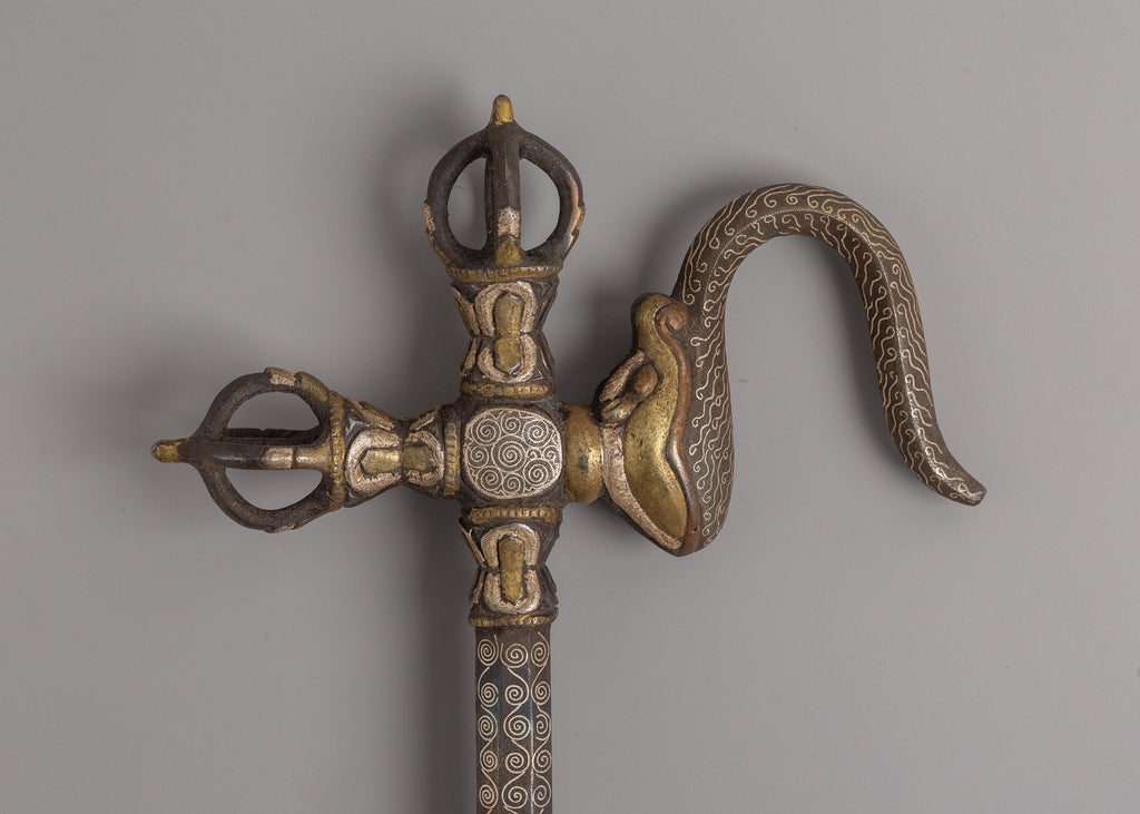 This ritual hook (ankusha) resembles the tool used by mahouts to keep elephants under control. According to its Buddhist ritual purposes, multiple half vajras are affixed to its handle, and its blade emerges from the mouth of the Makara sea monster. The hook is commonly utilized as part of the power activities of tantric rituals that try to subdue and tame entities via brilliance. It is most usually wielded by red deities linked with these activities, such as the dakini Kurukulla or Ganapati, the Buddhist equivalent of Ganesh, the well-known elephant-faced god.