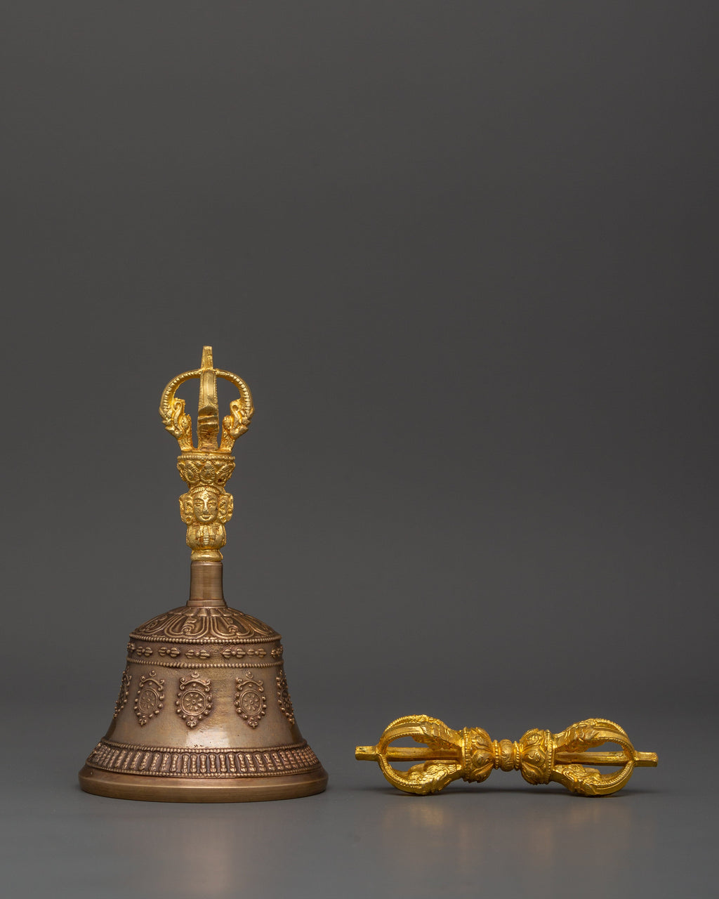 The intricate designs of both the bell and the vajra highlight their deep spiritual meaning. The bell is traditionally used to invoke blessings and remove obstacles, while the vajra represents the indestructible nature of spiritual teachings. Together, these tools embody the union of wisdom and method, male and female energies, and are potent symbols of the balance between compassion and strength.