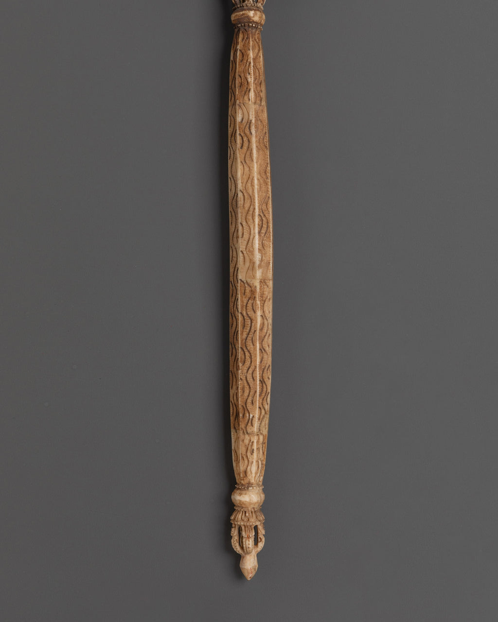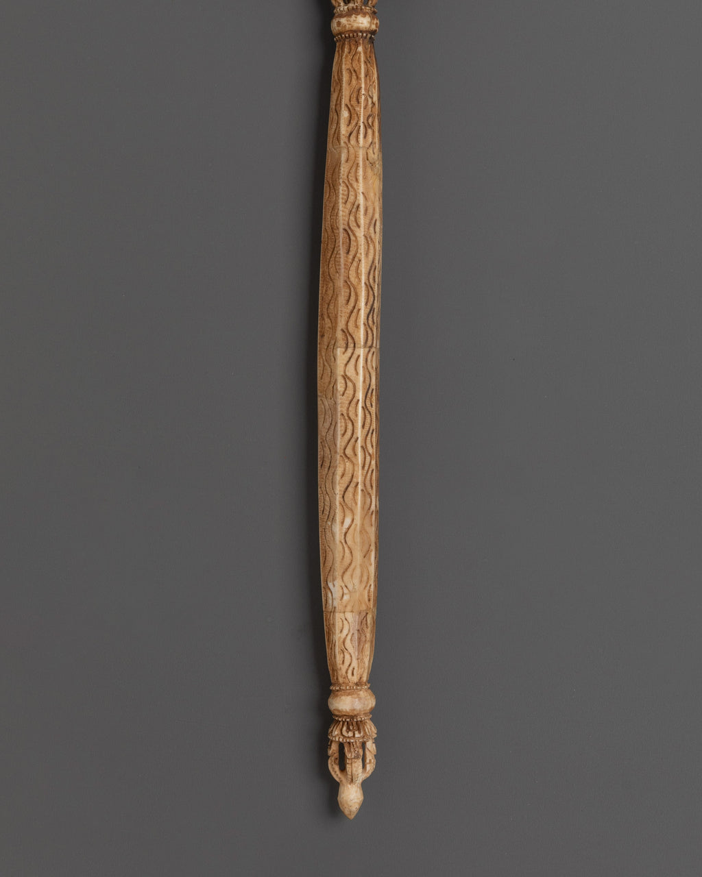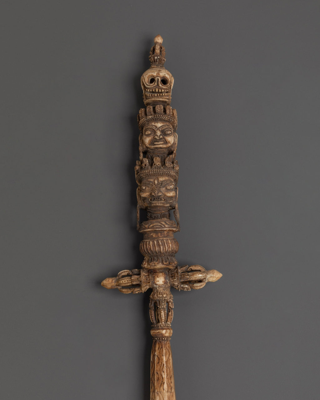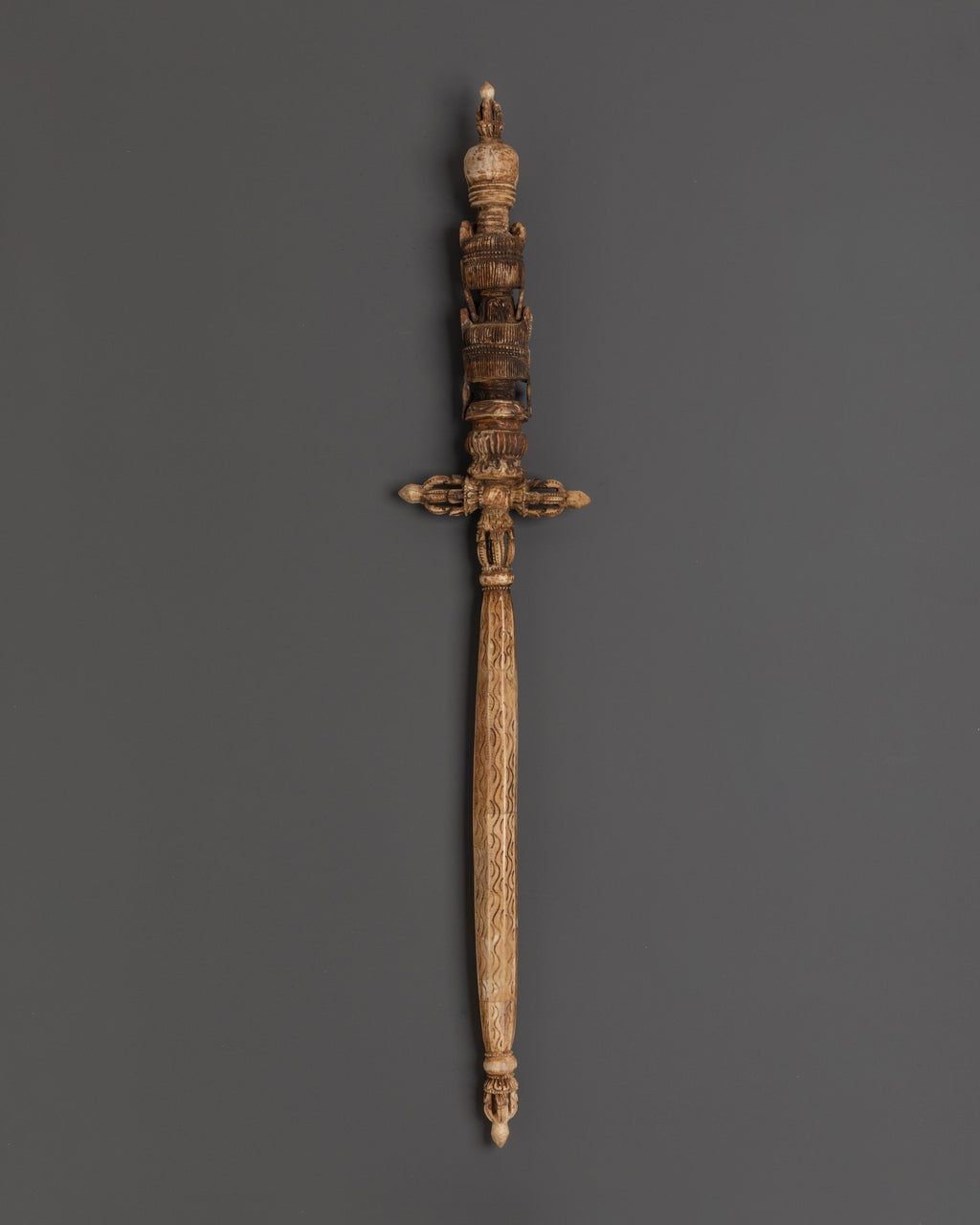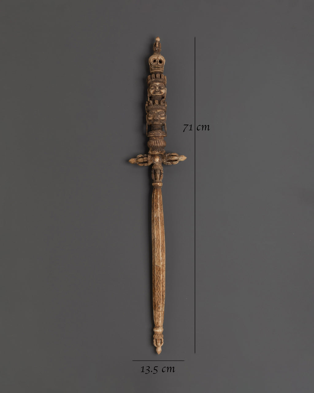The Tibetan Ritual Phurba Dagger is a sacred spiritual tool, precisely designed to assist in meditation, spiritual rites, and defense. This beautiful dagger, which measures 71cm in height and 13.5cm in width, features an ethically sourced buffalo bone inlay. The Phurba is revered for its cultural and ritual significance, symbolizing spiritual transformation, protection, and energy grounding during meditation. Its sharp, three-pronged blade symbolizes the removal of negative forces and is used in sacred rituals to seal and protect areas.