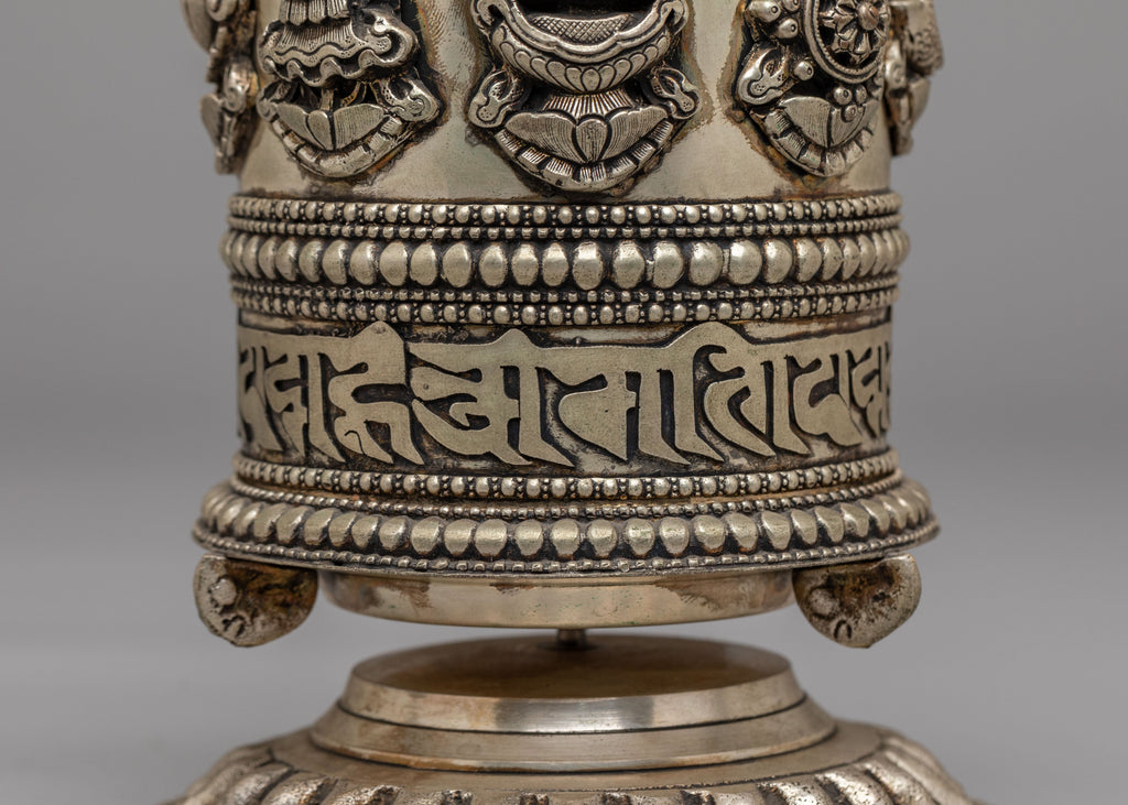 This Tibetan Ritual Prayer Wheel is a beautifully crafted spiritual instrument made of white metal, designed to enhance meditation and prayer practices. Measuring 23 cm in height and 13 cm in width, it features intricate designs and symbolic carvings that reflect Tibet's rich cultural heritage and spiritual traditions.