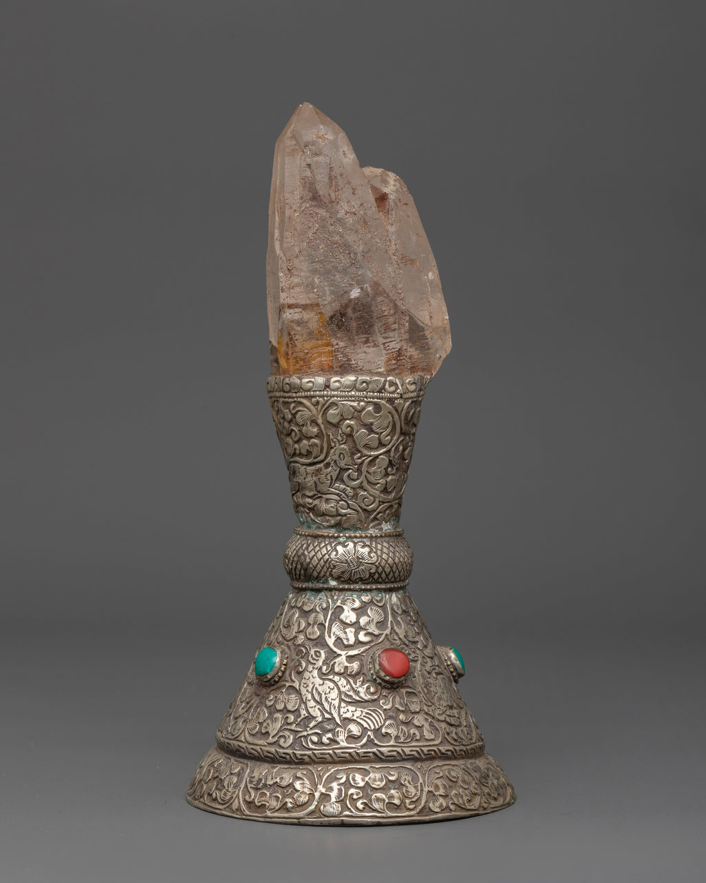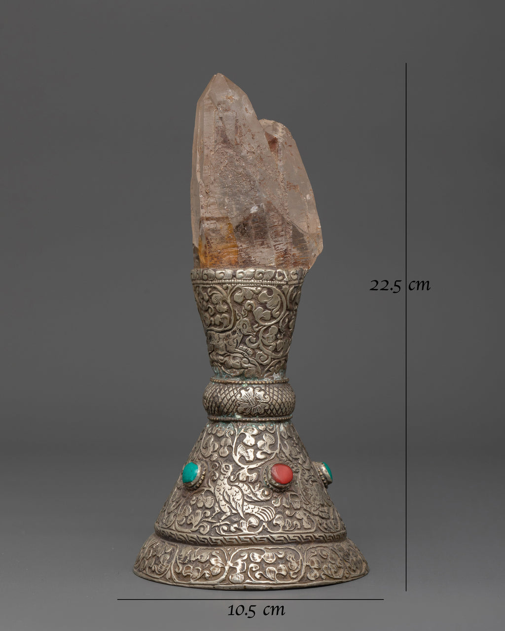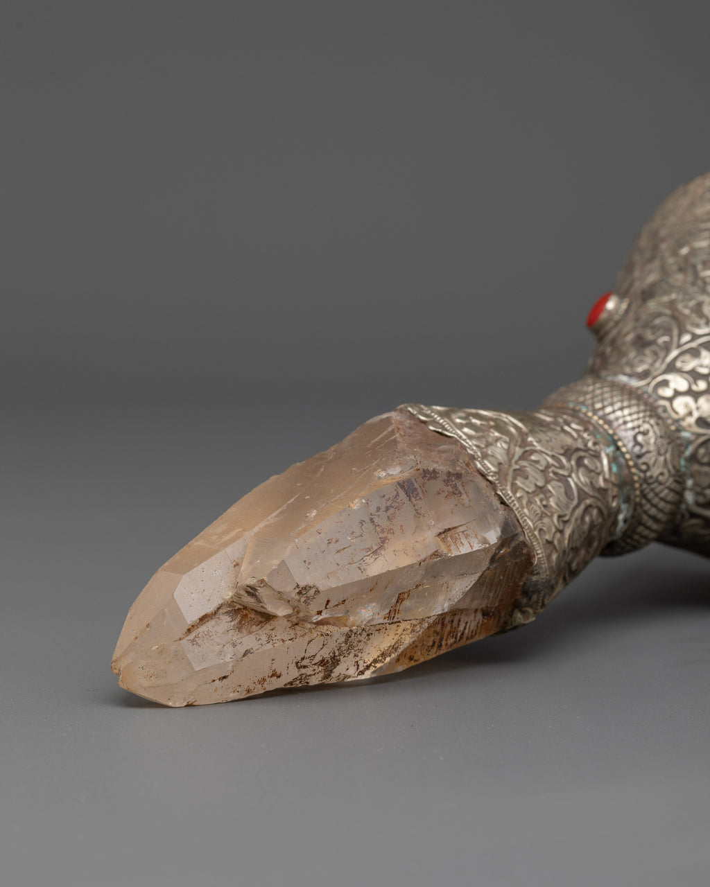 This Tibetan Ritual Stamp is a potent spiritual tool with a raw crystal tip and a finely carved white metal base. It measures 22.5 cm in height and 10.5 cm in width, weighs 0.93 kg, and is adorned with coral and turquoise stones, which enhance its visual appeal and energetic meaning. His handcrafted piece is perfect for chakra work, altar blessings, and spiritual imprint ceremonies.