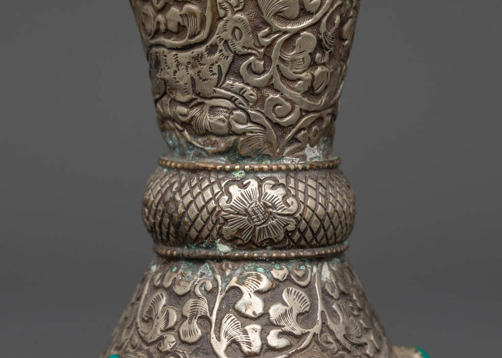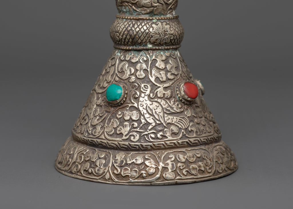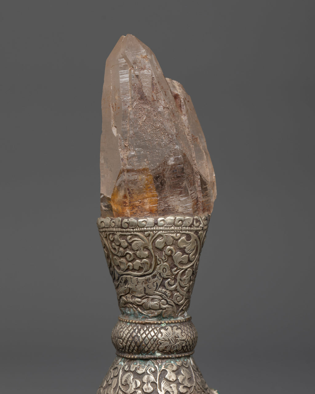This Tibetan Ritual Stamp is a potent spiritual tool with a raw crystal tip and a finely carved white metal base. It measures 22.5 cm in height and 10.5 cm in width, weighs 0.93 kg, and is adorned with coral and turquoise stones, which enhance its visual appeal and energetic meaning. His handcrafted piece is perfect for chakra work, altar blessings, and spiritual imprint ceremonies.