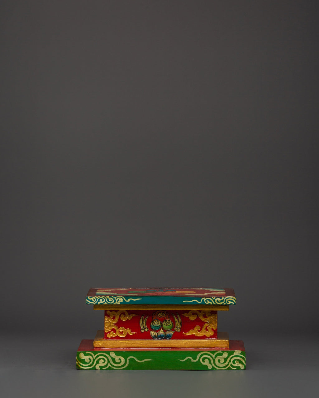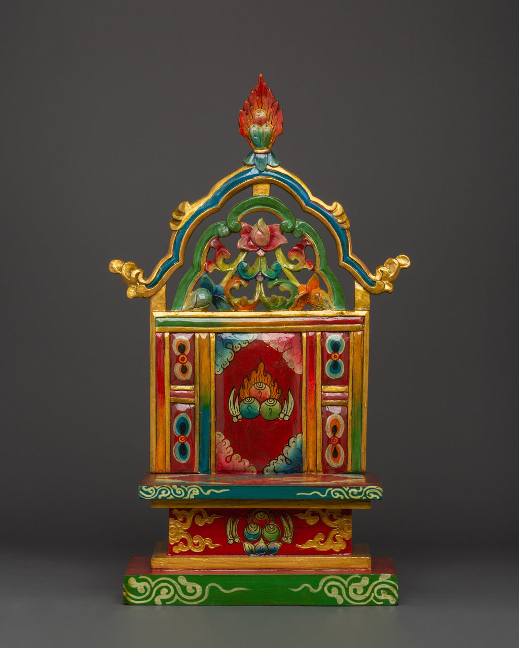 This Buddhist deity throne, whether used on a home altar, in a meditation area, or at a temple, embodies Himalayan craftsmanship and spiritual significance. This handcarved shrine stand is ideal for supporting Buddha statues, ceremonial artifacts, or symbolic offerings. It combines spiritual symbolism with practical usefulness. Allow this Tibetan ritual furniture, including a wooden altar seat and a colorful spiritual throne, to enhance the visibility of your spiritual practice.