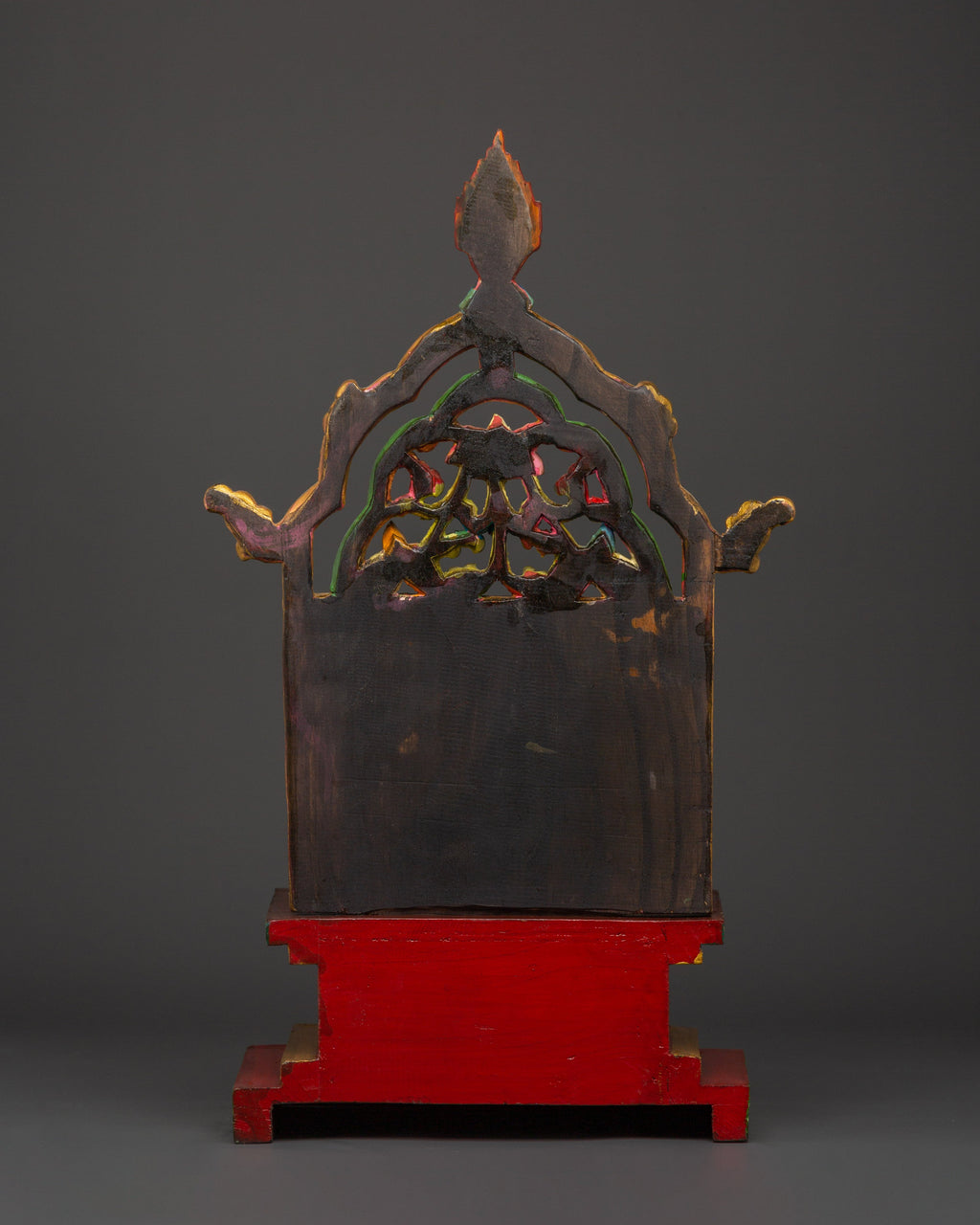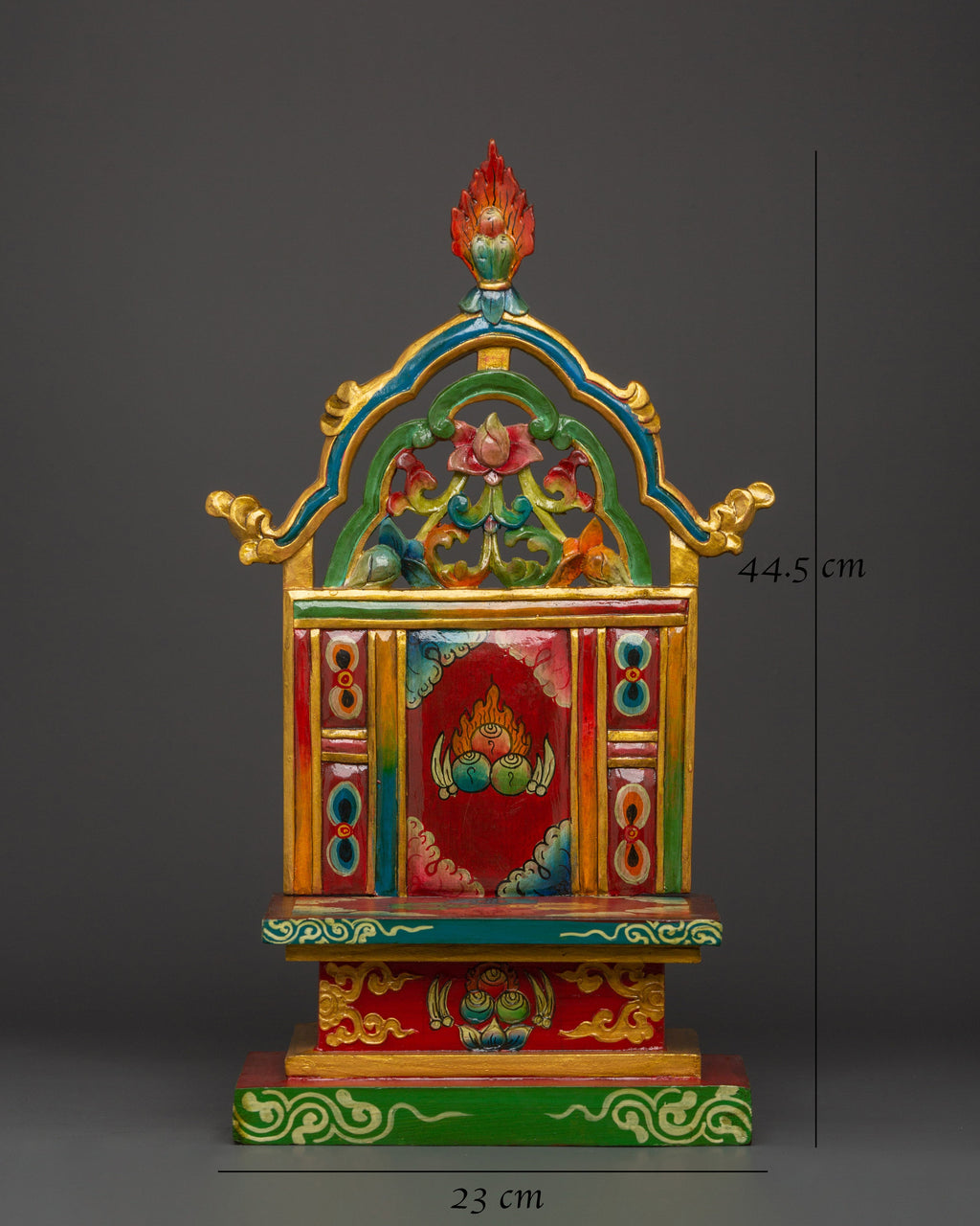 Honor your spiritual practice with this finely detailed Tibetan Ritual Throne, which is 44.5cm tall and 23cm broad. This wooden throne, designed as a sacred seat for deity figurines or symbolic offerings, has been delicately handcarved and hand-painted in rich, brilliant acrylic hues. It incorporates traditional Tibetan themes, such as lotus petals, flames, and auspicious symbols, to enhance the spirit and purity of any altar area. Weighing only 1.10kg, it is both strong and easy to install on your puja table or in a home shrine.