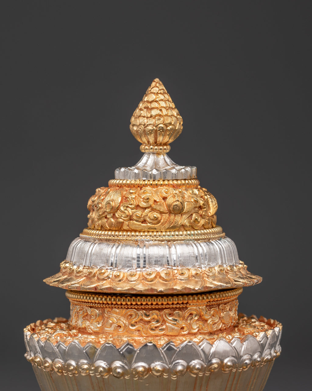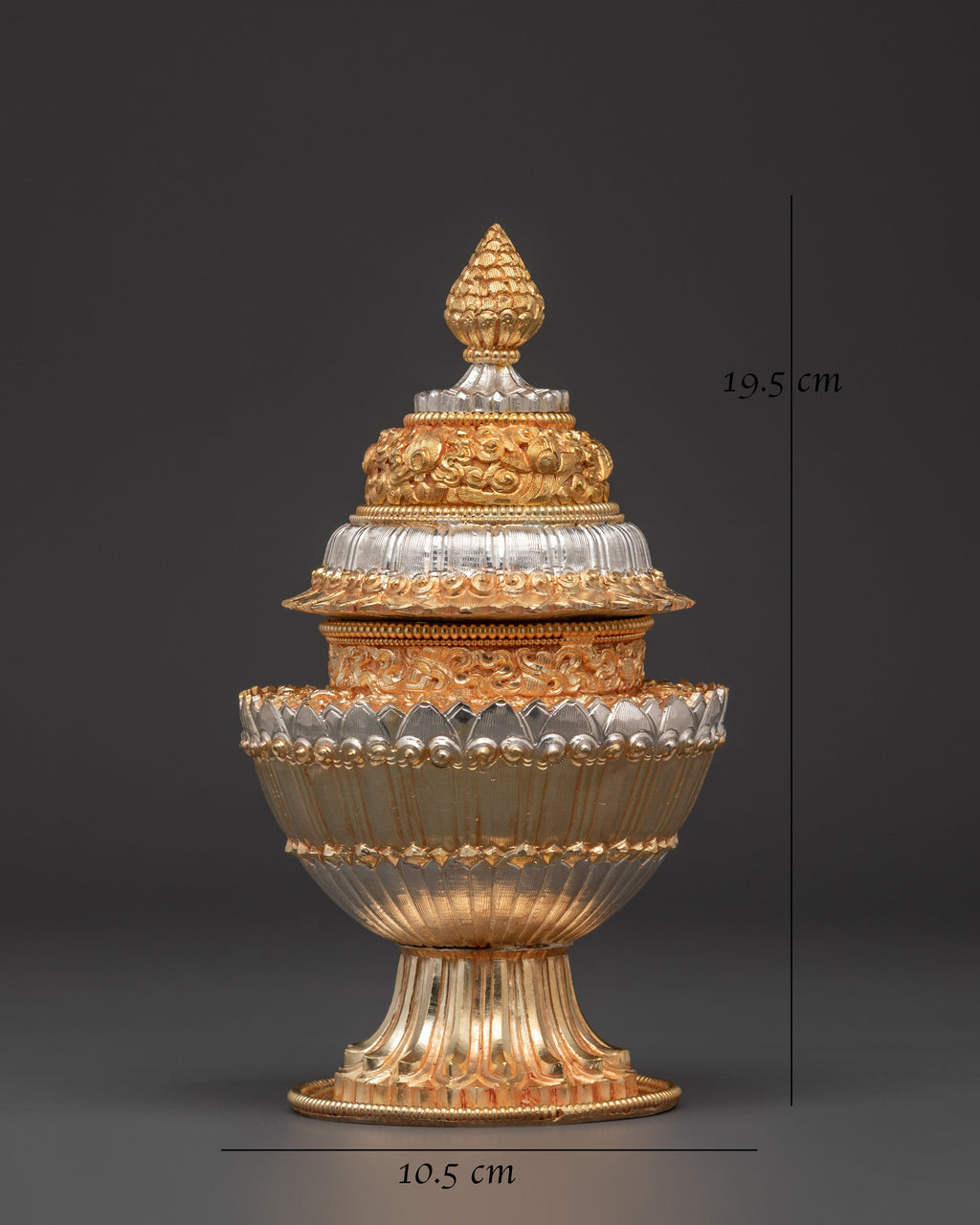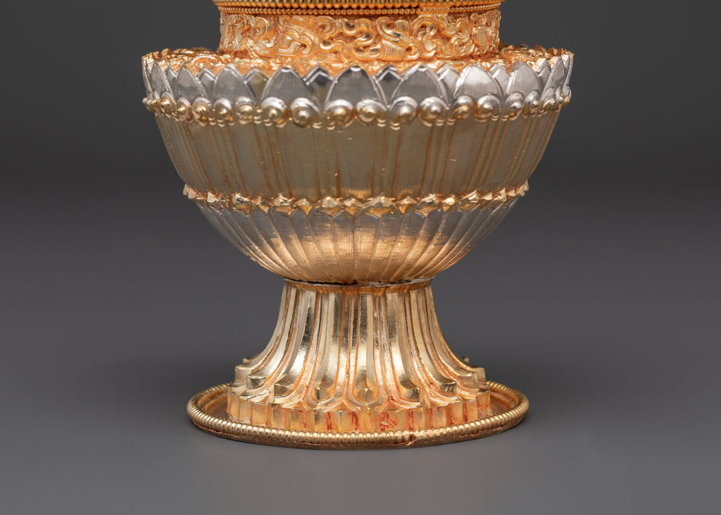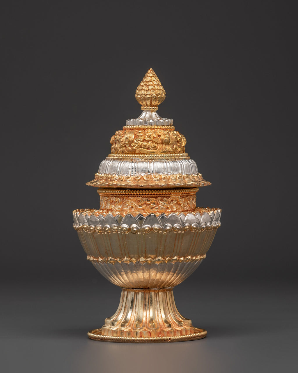 This rice pot has exquisite floral designs and is beautifully crafted. The pot's sacred significance and the expert craftsmanship required are reflected in the magnificent sheen added by the dual-tone plating of gold and silver. Every little detail highlights how the pot is a sacred item in Buddhist ceremonies, symbolizing purity and the aspiration to cultivate merit and good fortune.