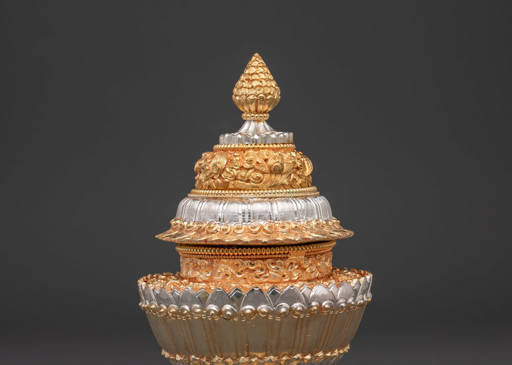 The Dhupur Rice Pot represents sustenance and food for life, both physically and spiritually. As a staple offering, rice represents wealth, success, and the fulfillment of desire. The spiritual efficacy of this pot is enhanced by the precious metals used in it, which draw forth blessings, protection, and harmony for the practitioner. This container enhances one's meditation and prayer practices, making it a valuable addition to any altar.