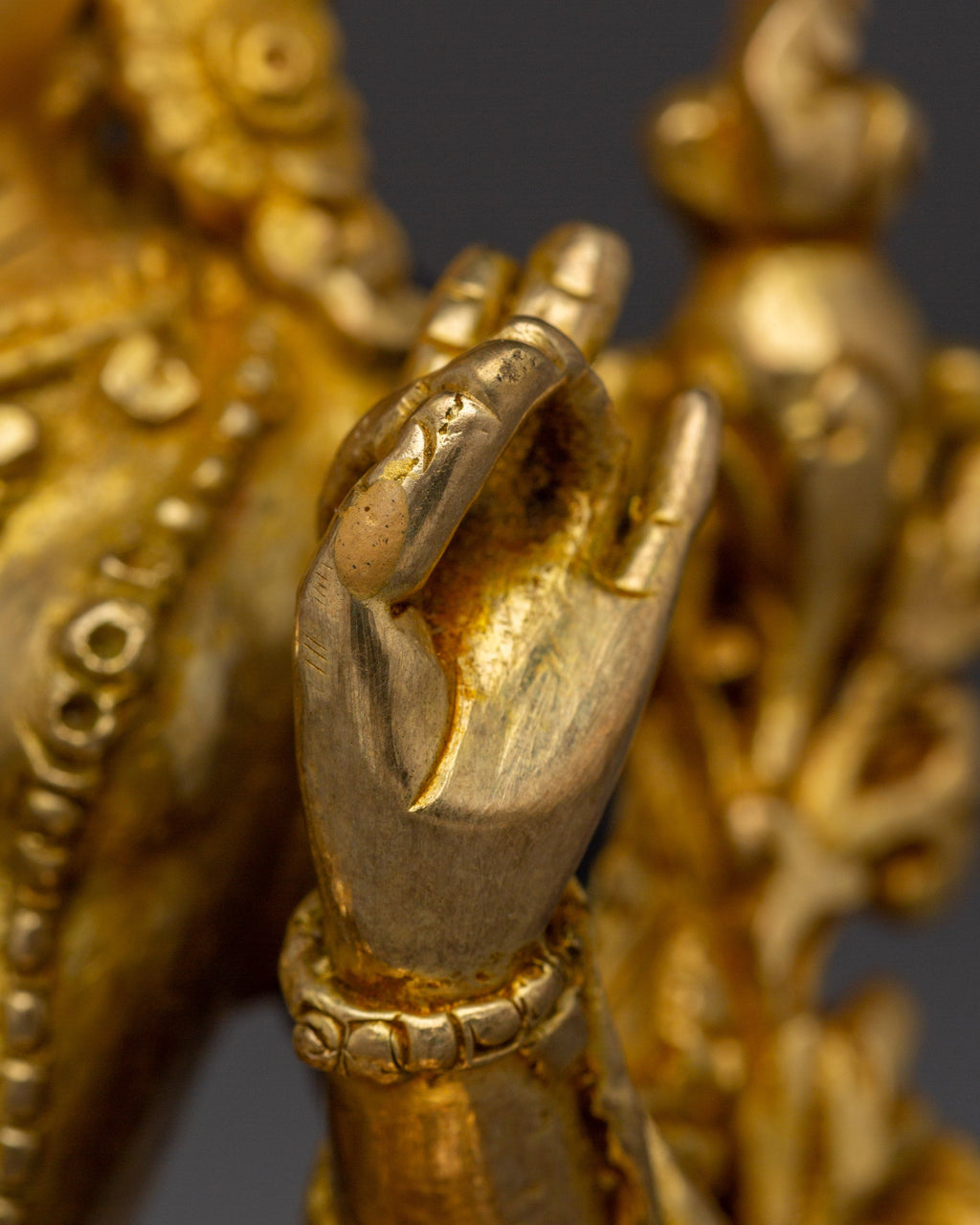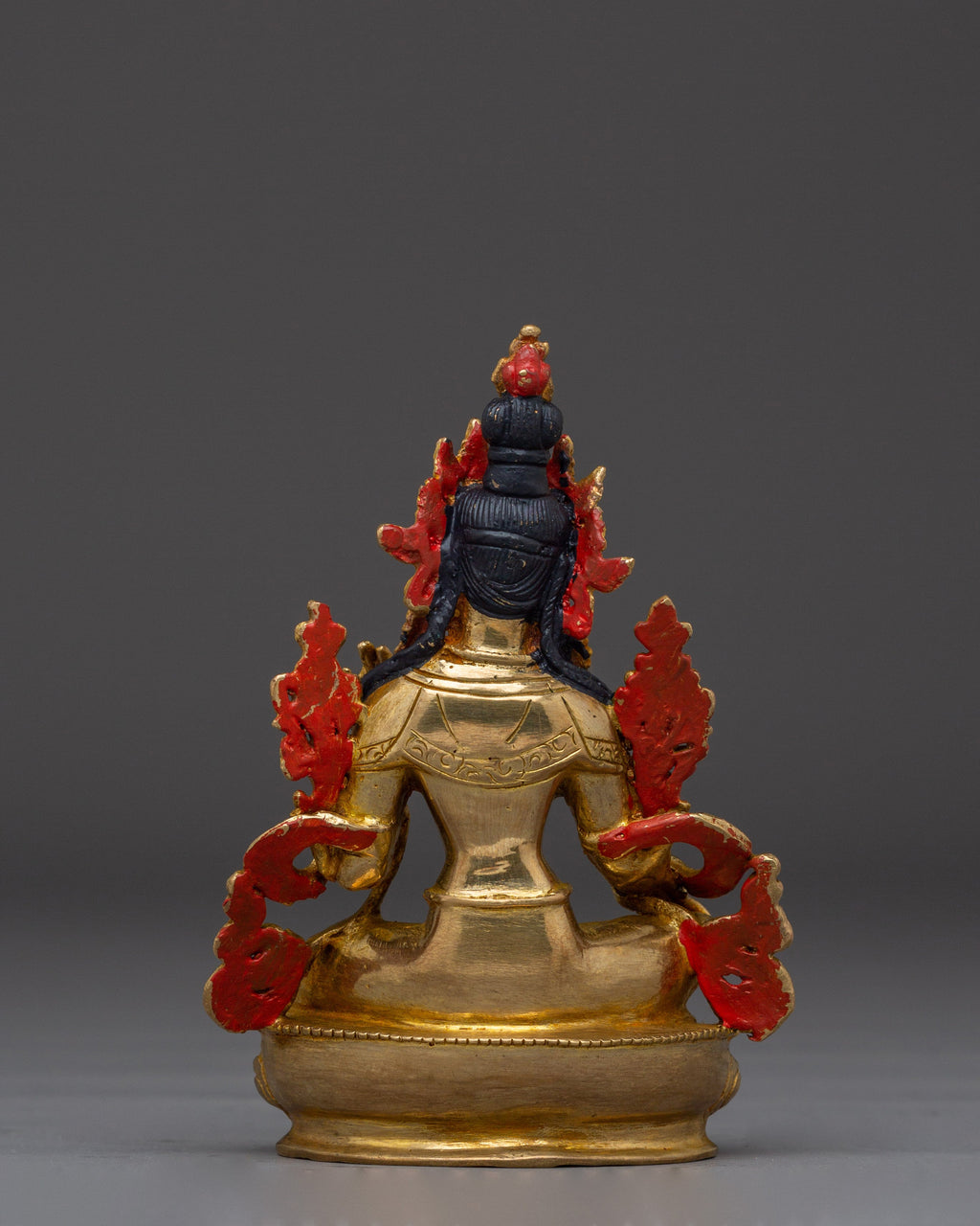As depicted, Green Tara is shown seated on a lotus throne with her right leg typically extended forward, signifying her active compassion and willingness to help. Her hands express profound meaning through their gestures, the right hand is displayed in the "gesture of giving" (Varada Mudra), symbolizing her boundless generosity and willingness to provide blessings. Meanwhile, her left hand delicately holds a blue lotus (Utpala), a symbol of purity and spiritual awakening, offering protection and reassurance to those who seek her guidance.