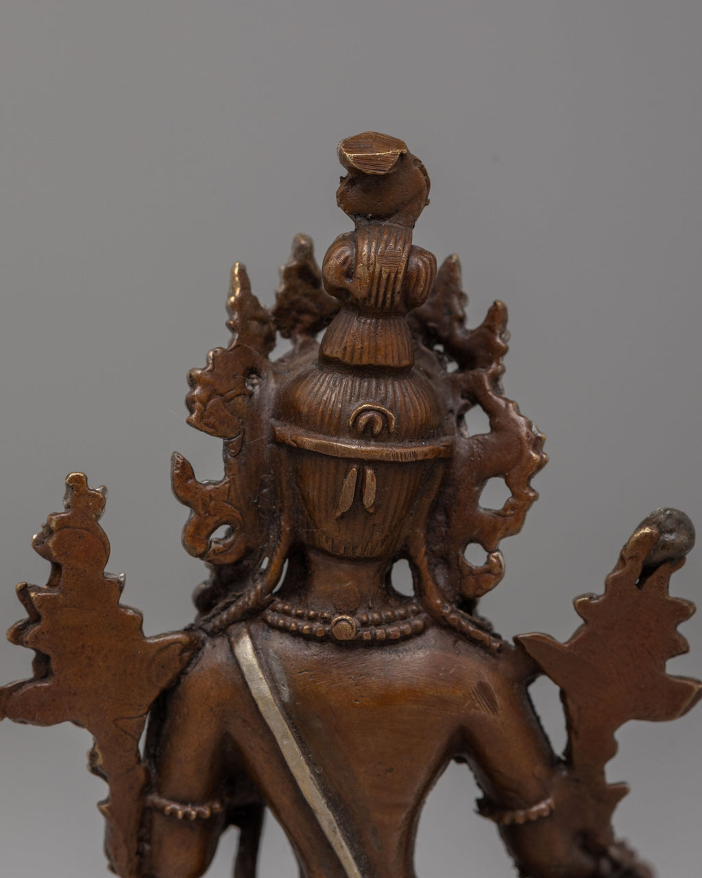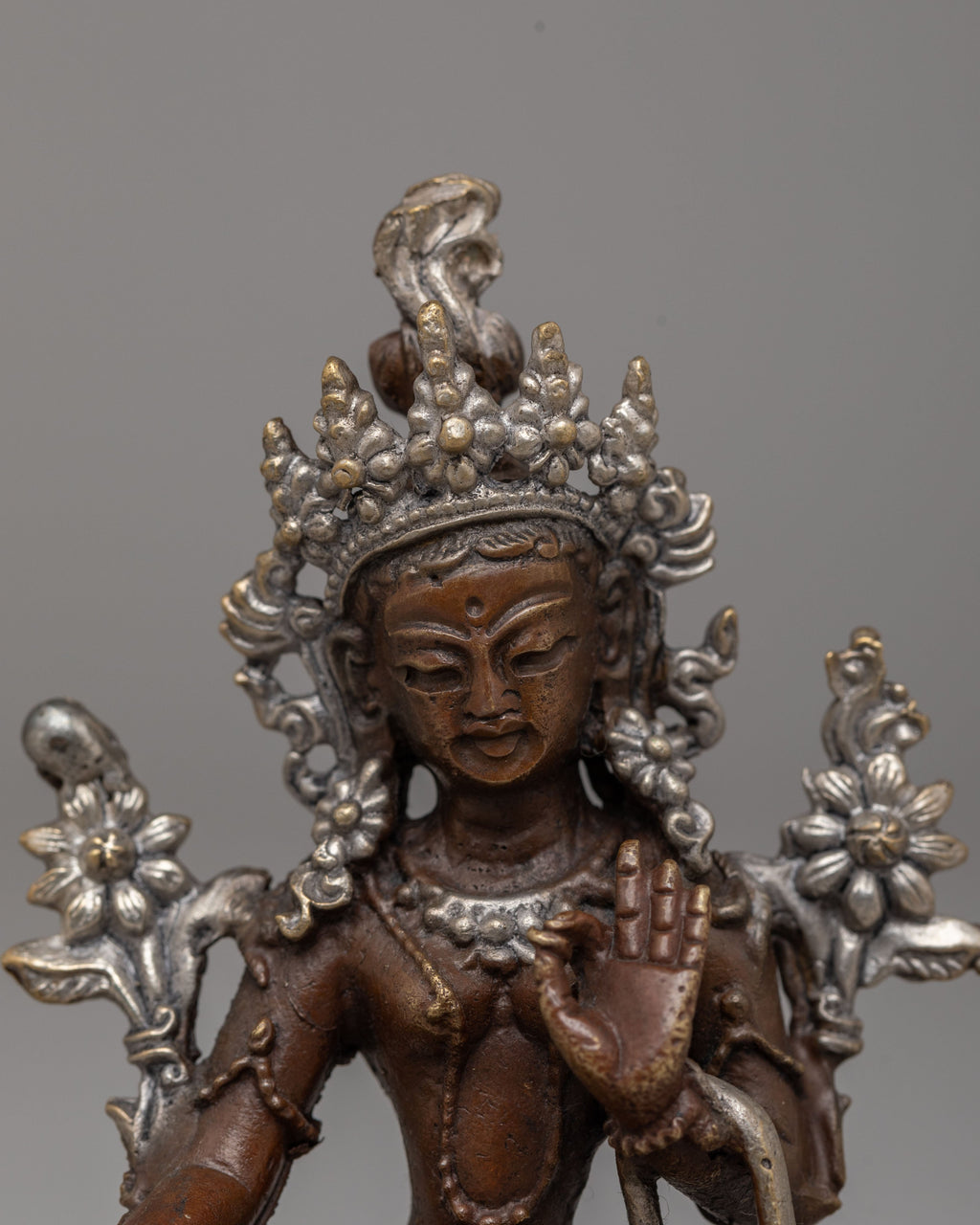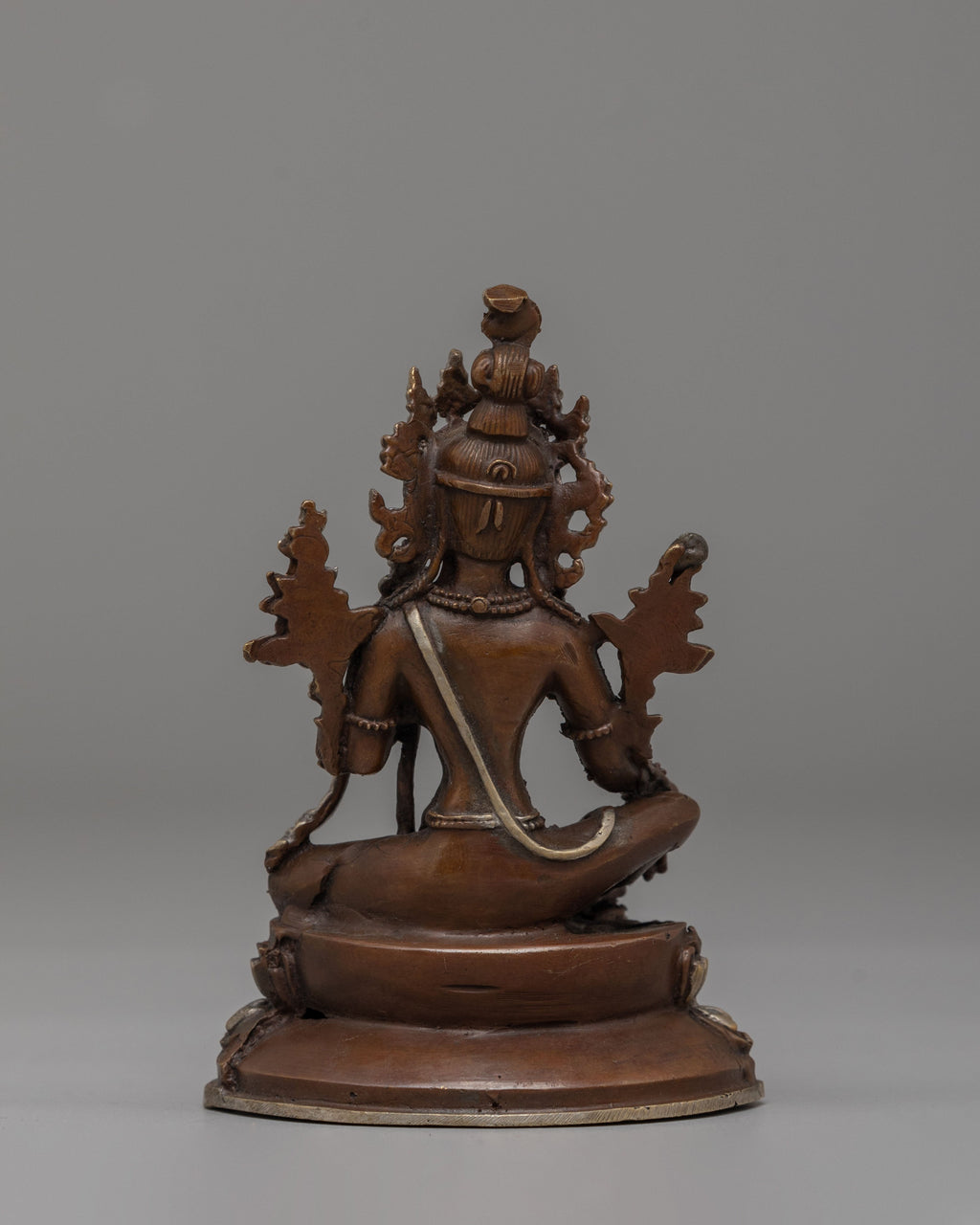 Expertly handcrafted, the statue features an oxidized copper body enhanced with elegant electro silver plating that highlights the intricate details of traditional Tibetan metal artistry. The contrast between the rich copper tones and radiant silver accents gives the sculpture a distinctive monastery style aesthetic admired in Himalayan ritual art. Oxidized finishing emphasizes depth in the carvings while the silver plating enhances sacred ornaments, facial features, and symbolic elements. This refined combination of materials reflects the heritage of Tibetan devotional craftsmanship and elevates the statue as a collector’s piece of Buddhist ritual art.