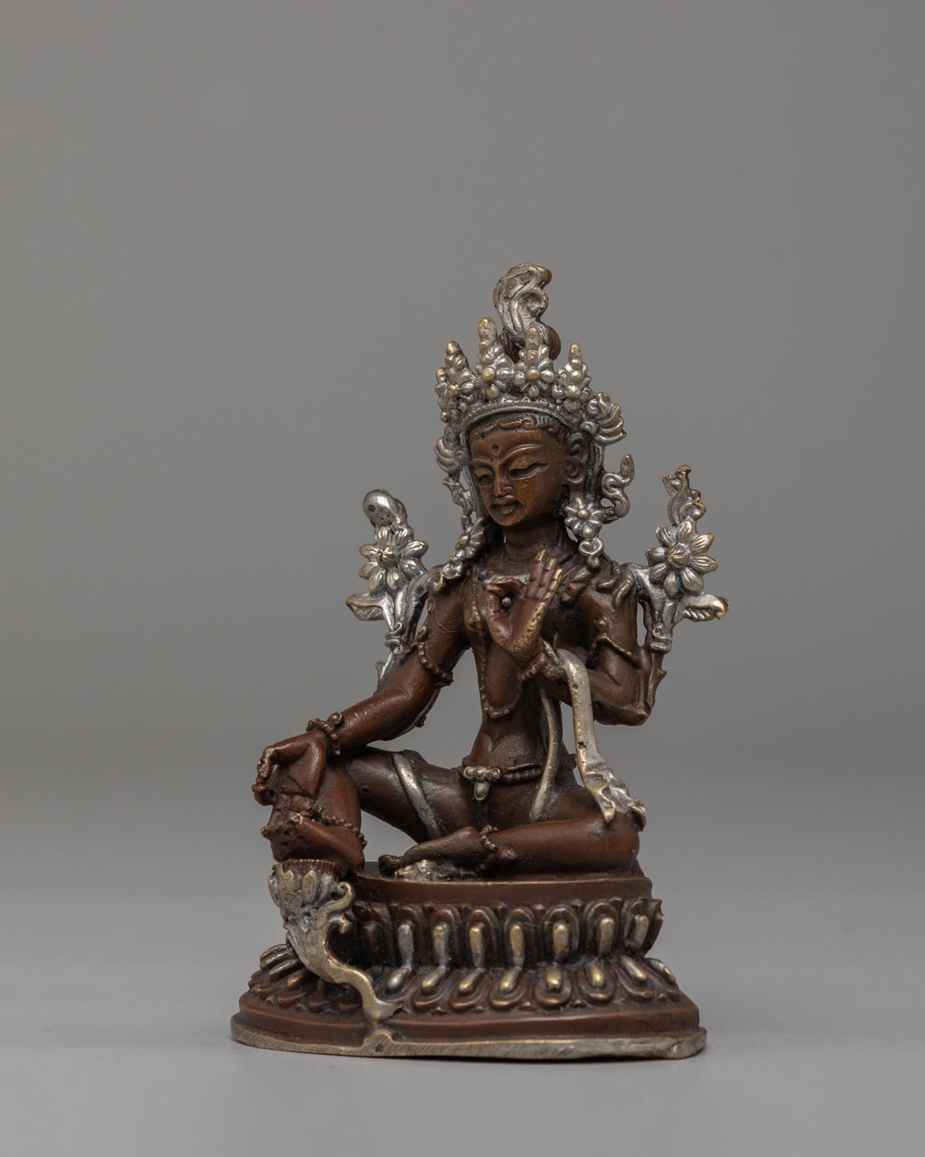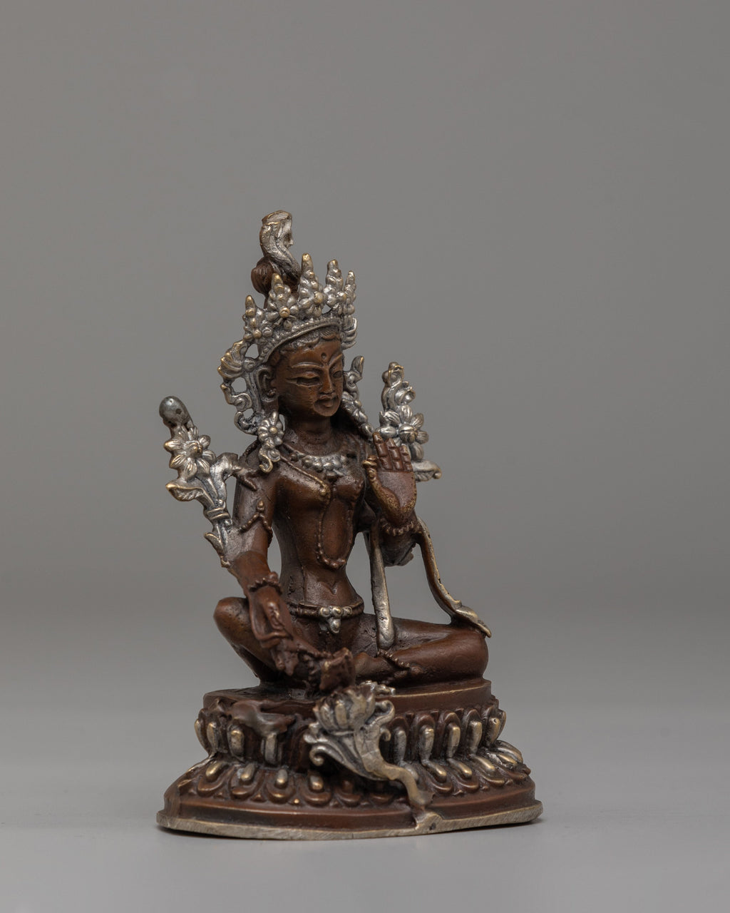 Green Tara Figurine | Handcrafted Oxidized Copper with Silver Plating