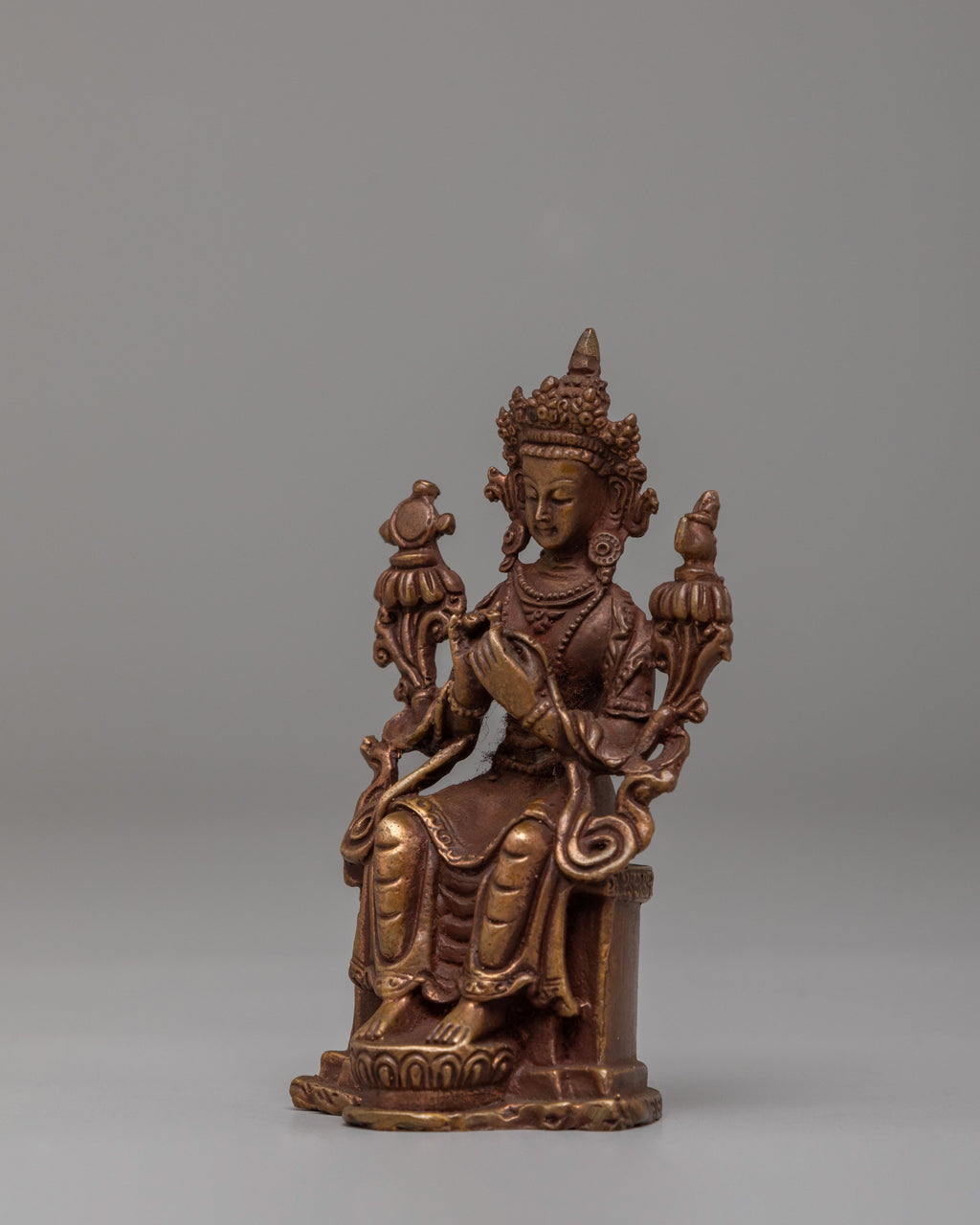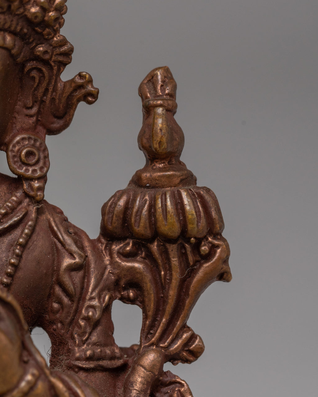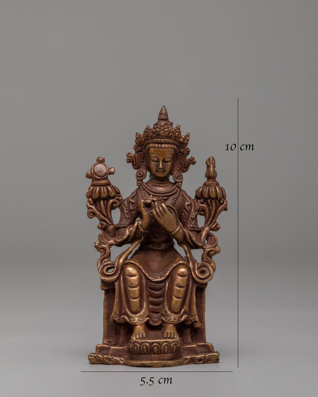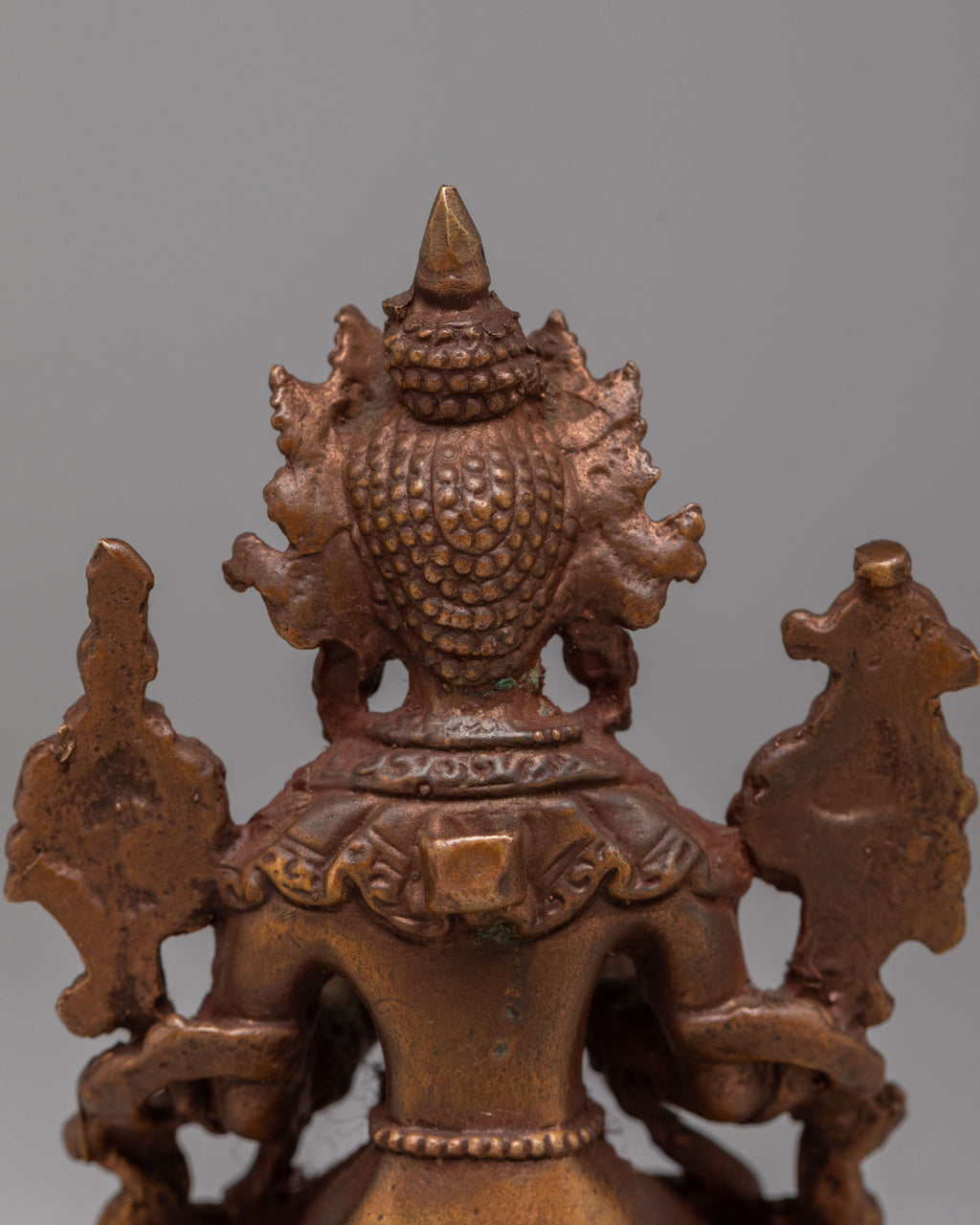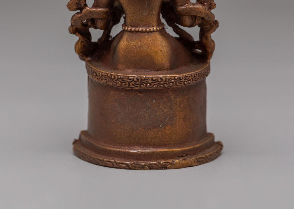 Handcrafted with a carefully sculpted copper body, this statue reflects the rich heritage of Himalayan Buddhist artistry. The warm metallic tone enhances the intricate carvings and fine detailing, giving the piece an authentic monastery style appearance. Copper has long been used in Tibetan ritual art for sacred figures, valued for its traditional association with devotional craftsmanship. The precise ornamentation and smooth finishing display the dedication of skilled artisans who preserve classical metal sculpting techniques passed down through generations.