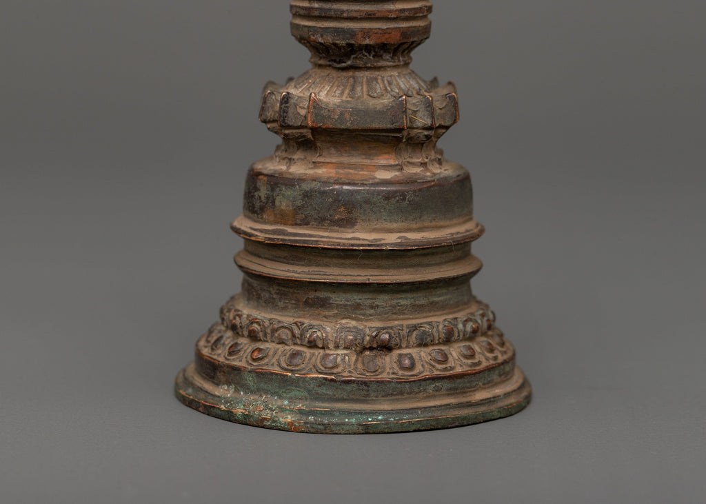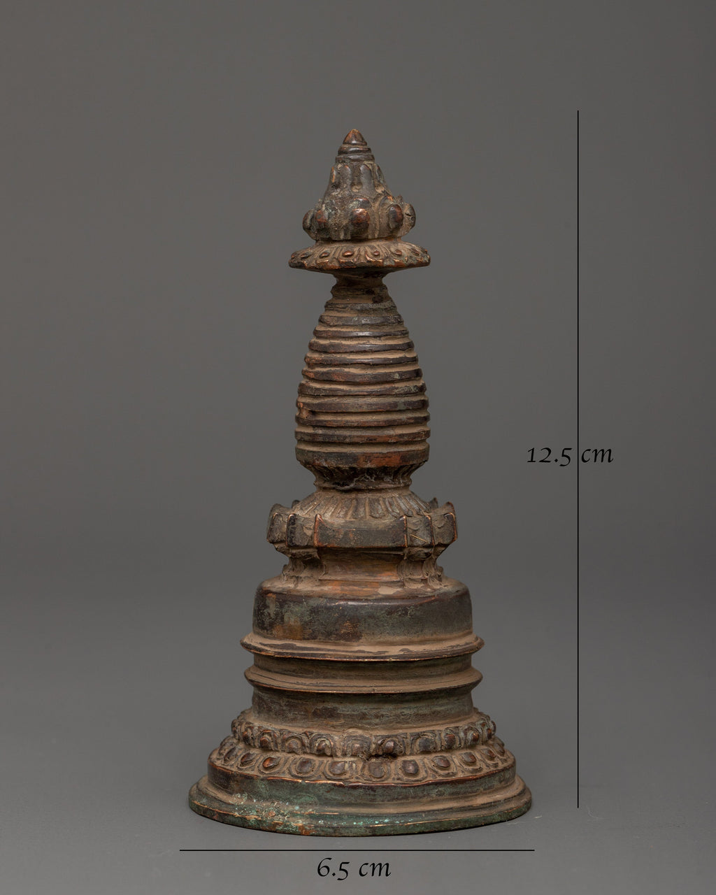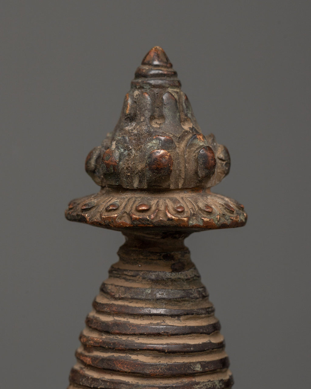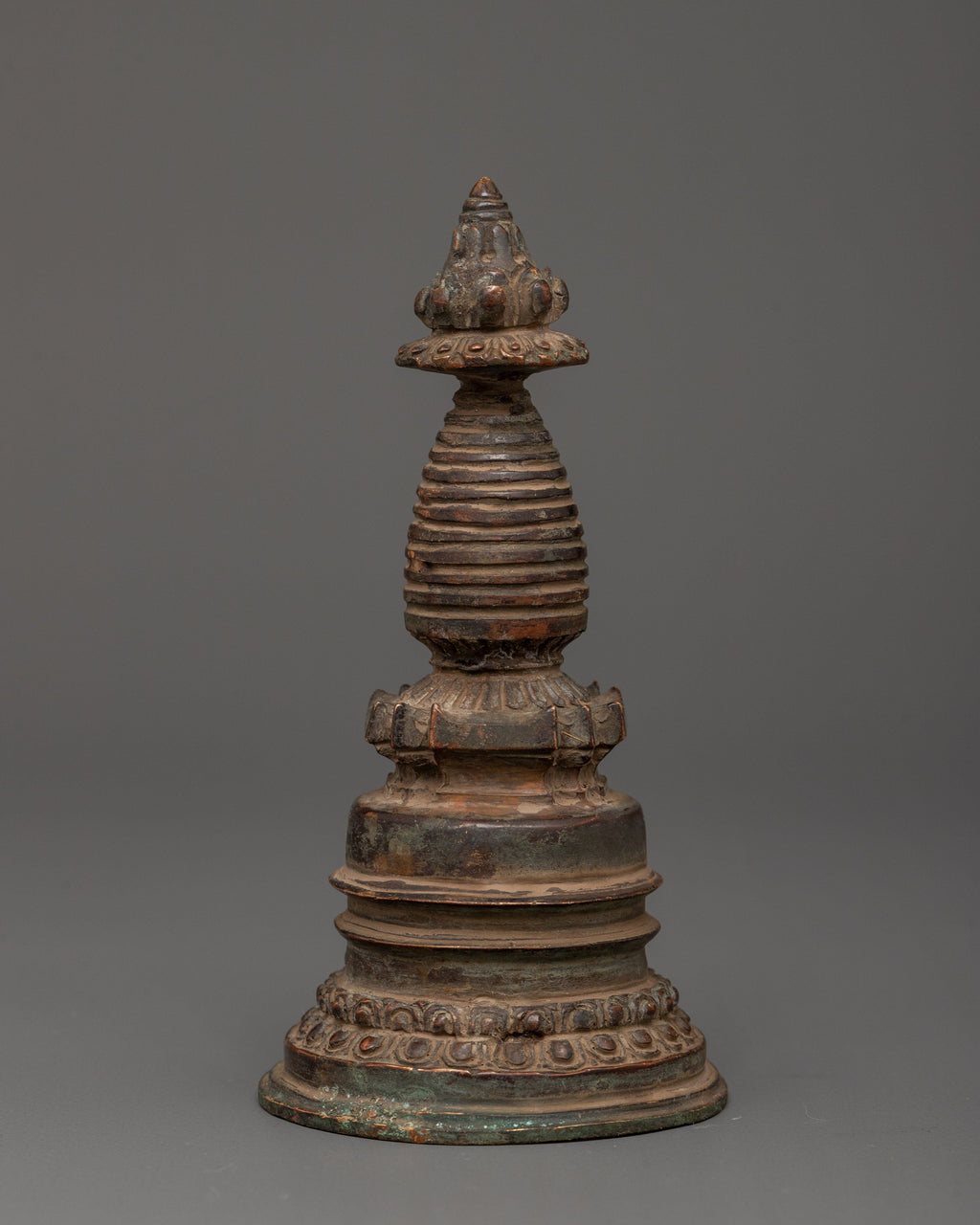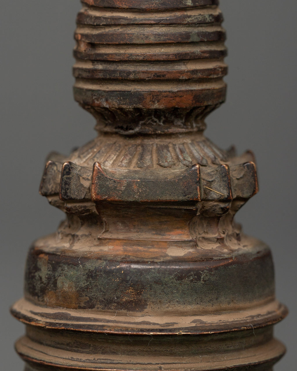 The intricately layered design of the stupa reflects the journey to enlightenment and the balance between the physical and spiritual realms. This antique copper stupa is perfect for anyone looking to cultivate a serene and sacred atmosphere in their home or temple. Place this stupa in your meditation area, living room, or altar as a reminder of the Buddhist tradition's serenity, harmony, and profound wisdom. Each piece is unique due to its handcrafted nature, and the antique finish adds a deep, spiritual dimension to your sacred space.