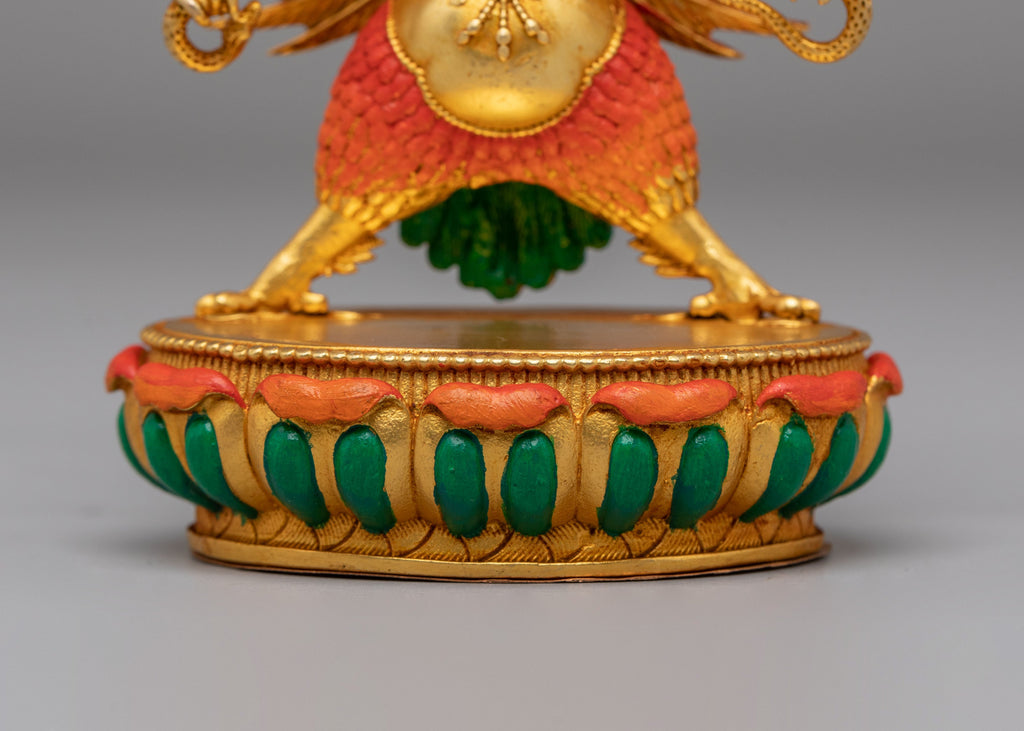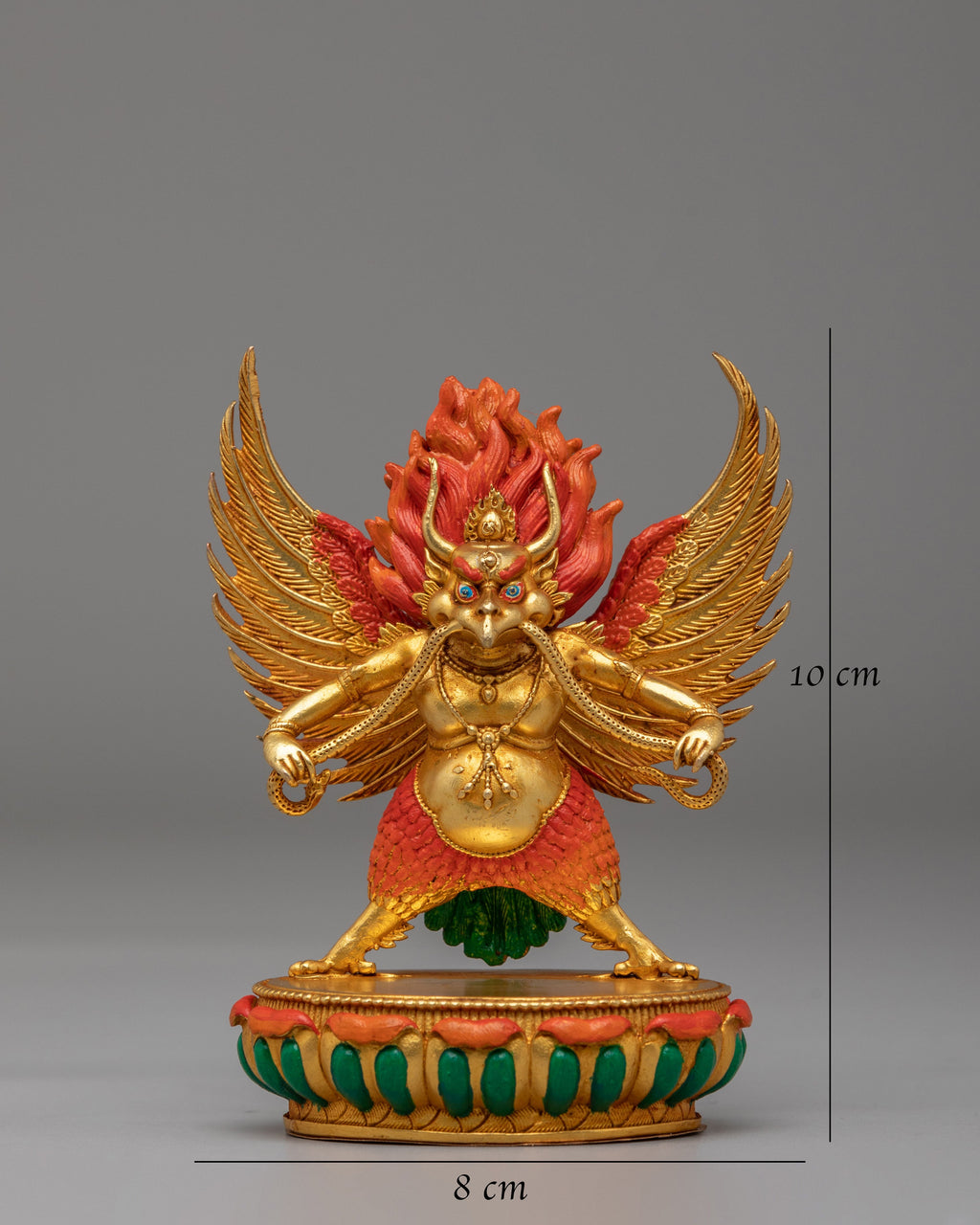 The Tibetan Sacred Buddhist Garuda statue is a remarkable piece of spiritual art, symbolizing power, protection, and liberation in Tibetan Buddhism. Standing at 10 cm in height and 8 cm in width, this exquisitely handcrafted statue features a majestic Garuda, a mythical bird-like creature revered in Buddhist and Hindu traditions. The figure is made from a copper body, accented with acrylic color and beautifully gold-plated details. Its design embodies the essence of spiritual strength, overcoming obstacles, and providing protection from evil forces.