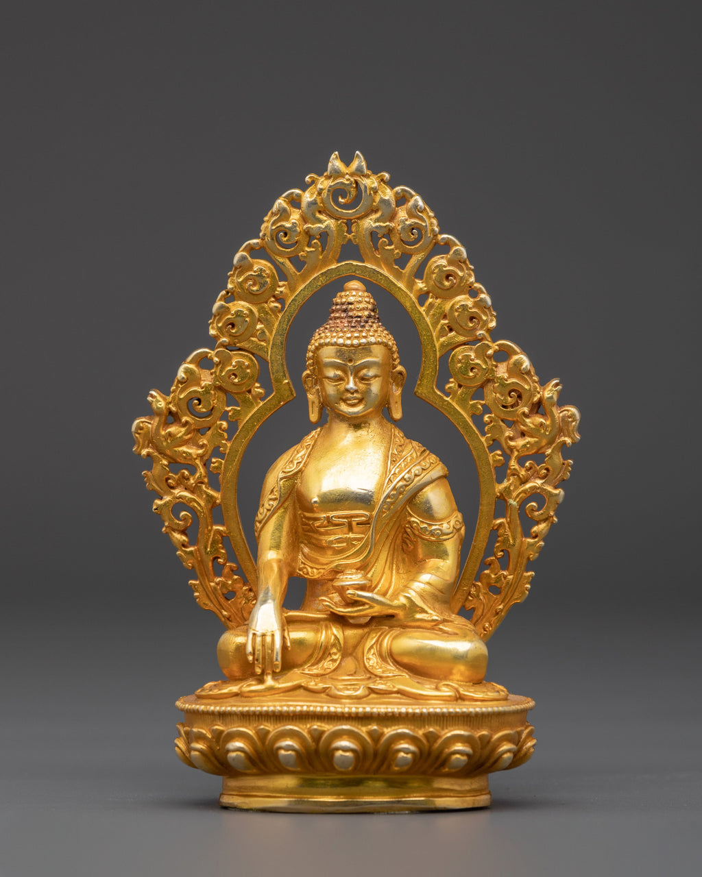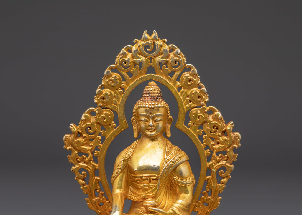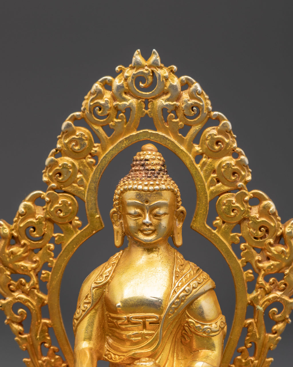This finely carved Tibetan Shakyamuni Buddha Copper Statue, along with an elegant floral-designed seat, will bring calm, wisdom, and clarity into your area. This machine-made statue, with its copper body and brilliant gold plating, features precise craftsmanship on both the figure and the elaborate floral Halo. The lotus pedestal and intricate throne behind the Buddha are meticulously made to increase their visual presence, making them a valuable addition to your collection or a wonderful spiritual present.