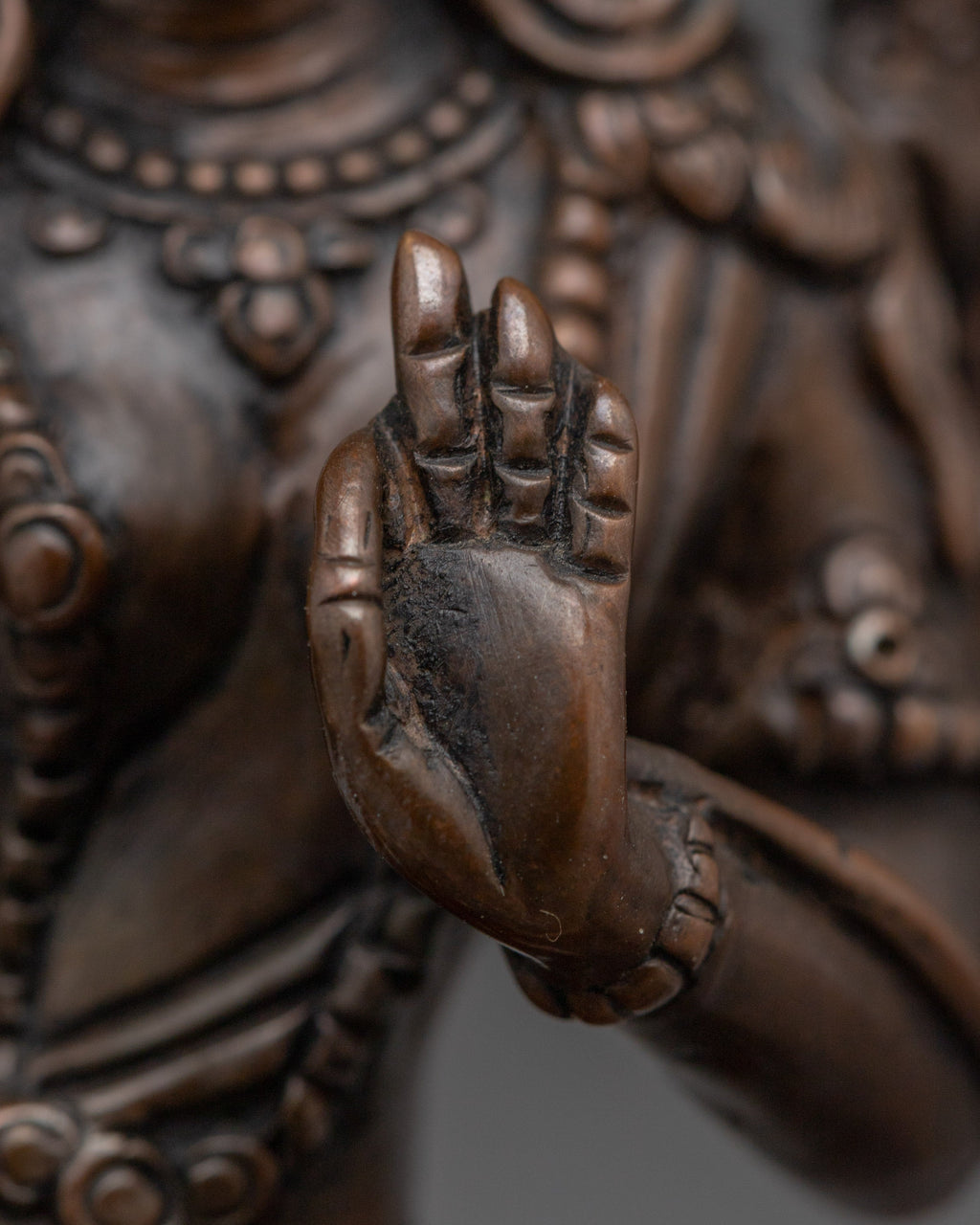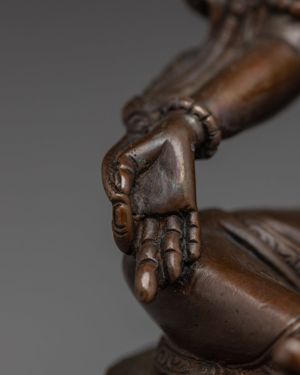 Tibetan Shyama Tara Statue measures 3.9” (10 cm) in height and 3” (7.5 cm) at the base, with a weight of 0.27 kg. Made from oxidized copper. Compact and lightweight, this piece is ideal for personal altars, travel shrines, or as a meaningful spiritual gift. Its handcrafted detail reflects the richness of the Himalayan artisan tradition.