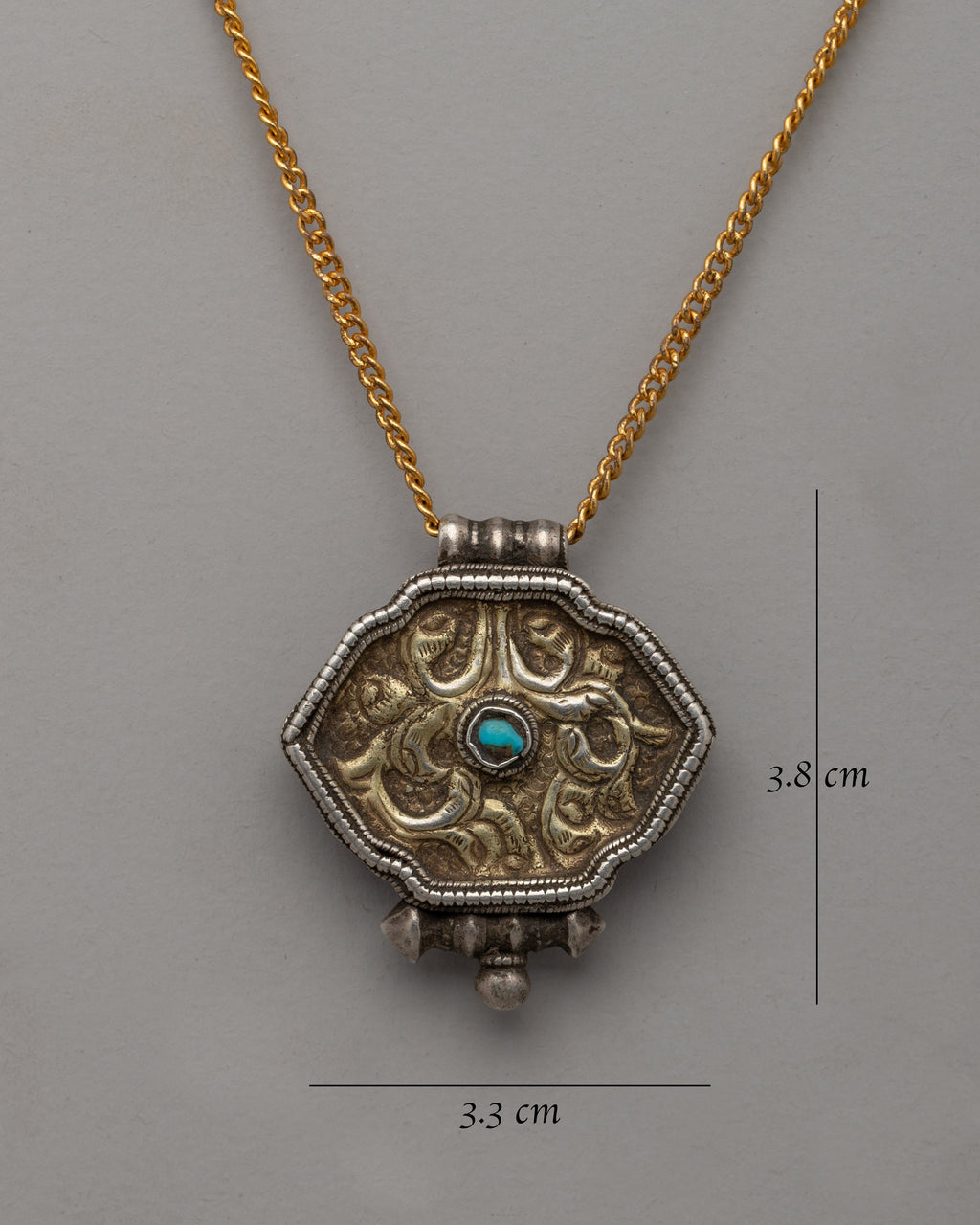 This Tibetan Ghau Box Locket is a religious amulet that carries treasured prayers or spiritual artifacts. Made of 85% silver and electroplated in gold, the locket radiates a unique combination of elegance and spirituality. Featuring turquoise in its design, this piece transcends traditional jewelry, serving instead as a spiritual tool that fosters protection and harmony. Measuring 3.8 cm tall and 3.3 cm wide, this delicately crafted item is perfect for wearing as a reminder of your spiritual journey. It weighs approximately 0.008 kg, ensuring it is lightweight and comfortable for daily wear.