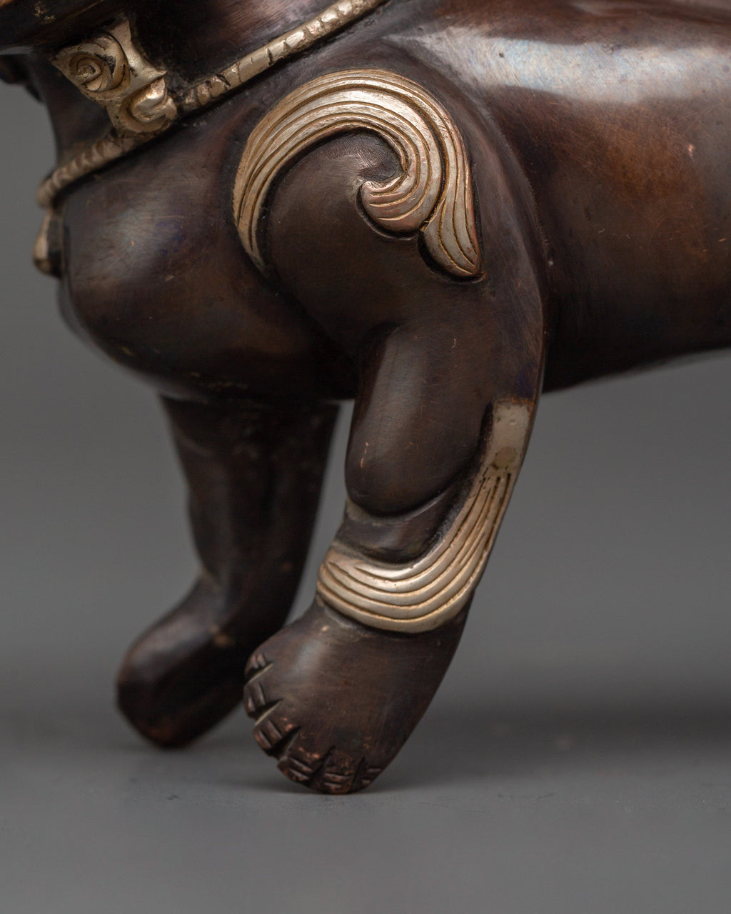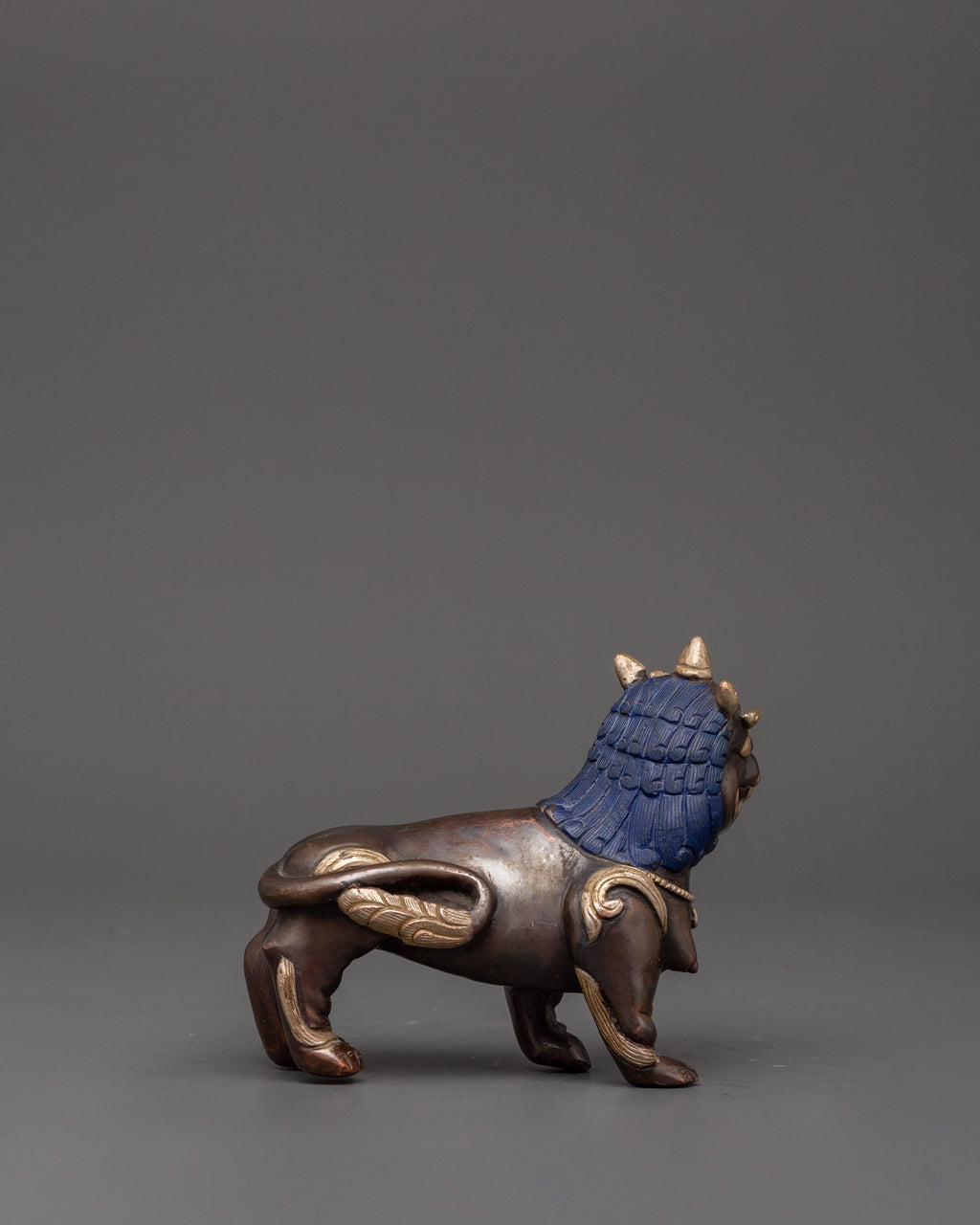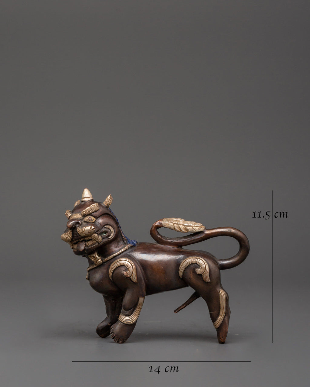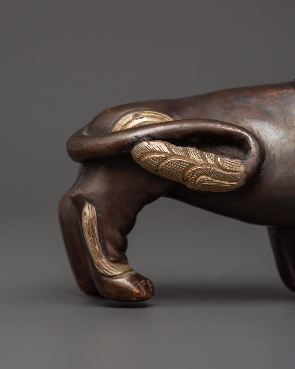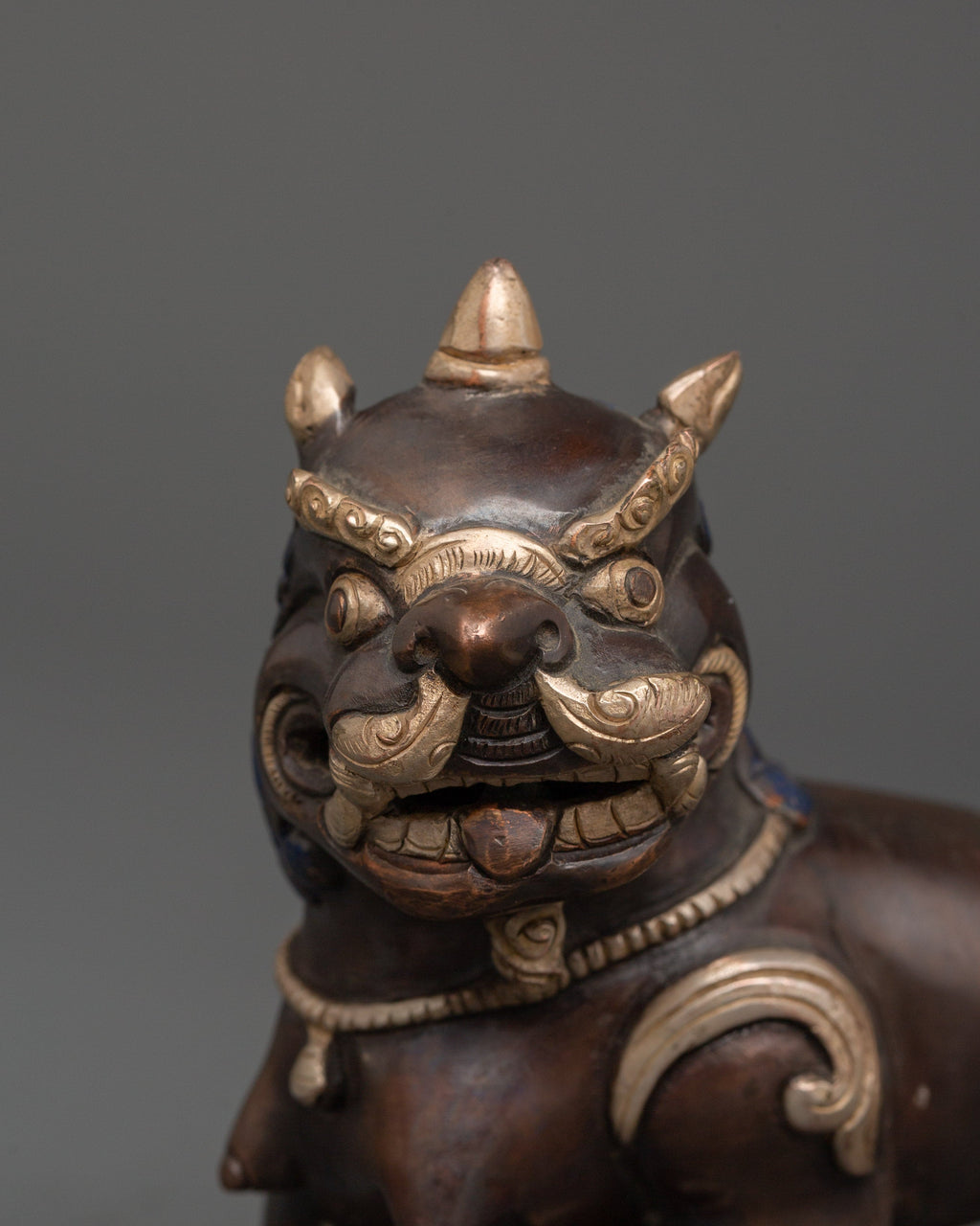 This handmade Snow Lion Statue Set embodies the ferocious compassion and protection of Tibetan tradition and will make a powerful addition to your spiritual environment. These 11.5cm tall guardian statues are meticulously carved from oxidized copper and plated with silver, emphasizing their magnificent features. Snow lions are traditionally seen as defenders of dharma, representing bravery, strength, and boundless pleasure.